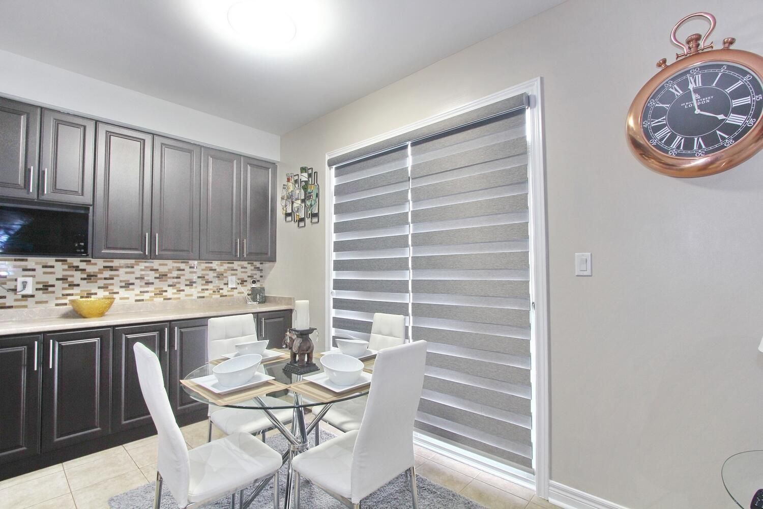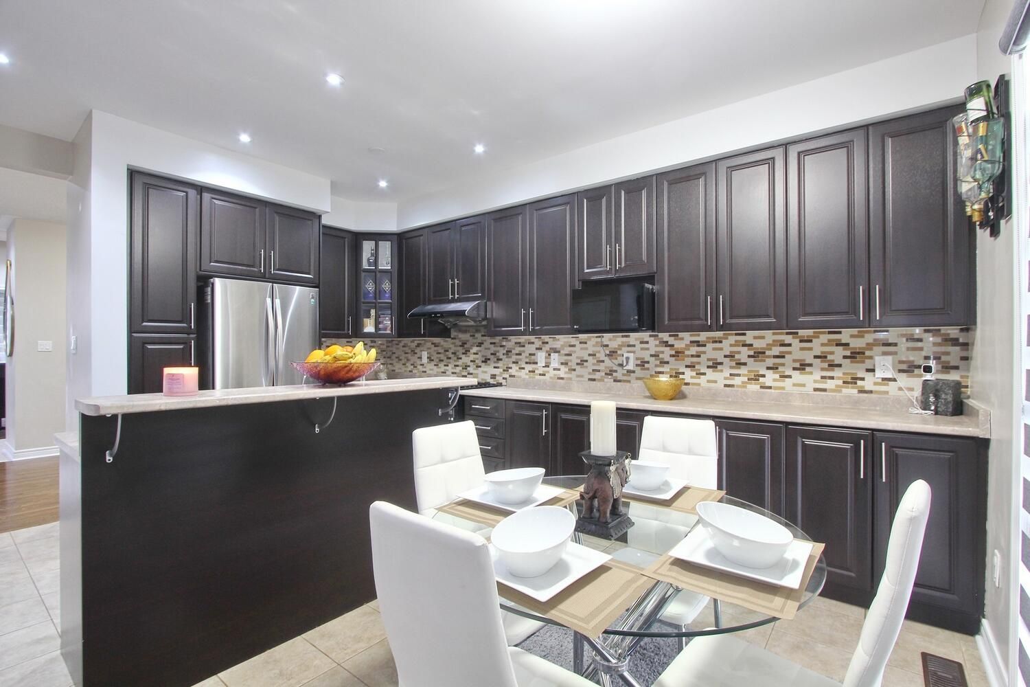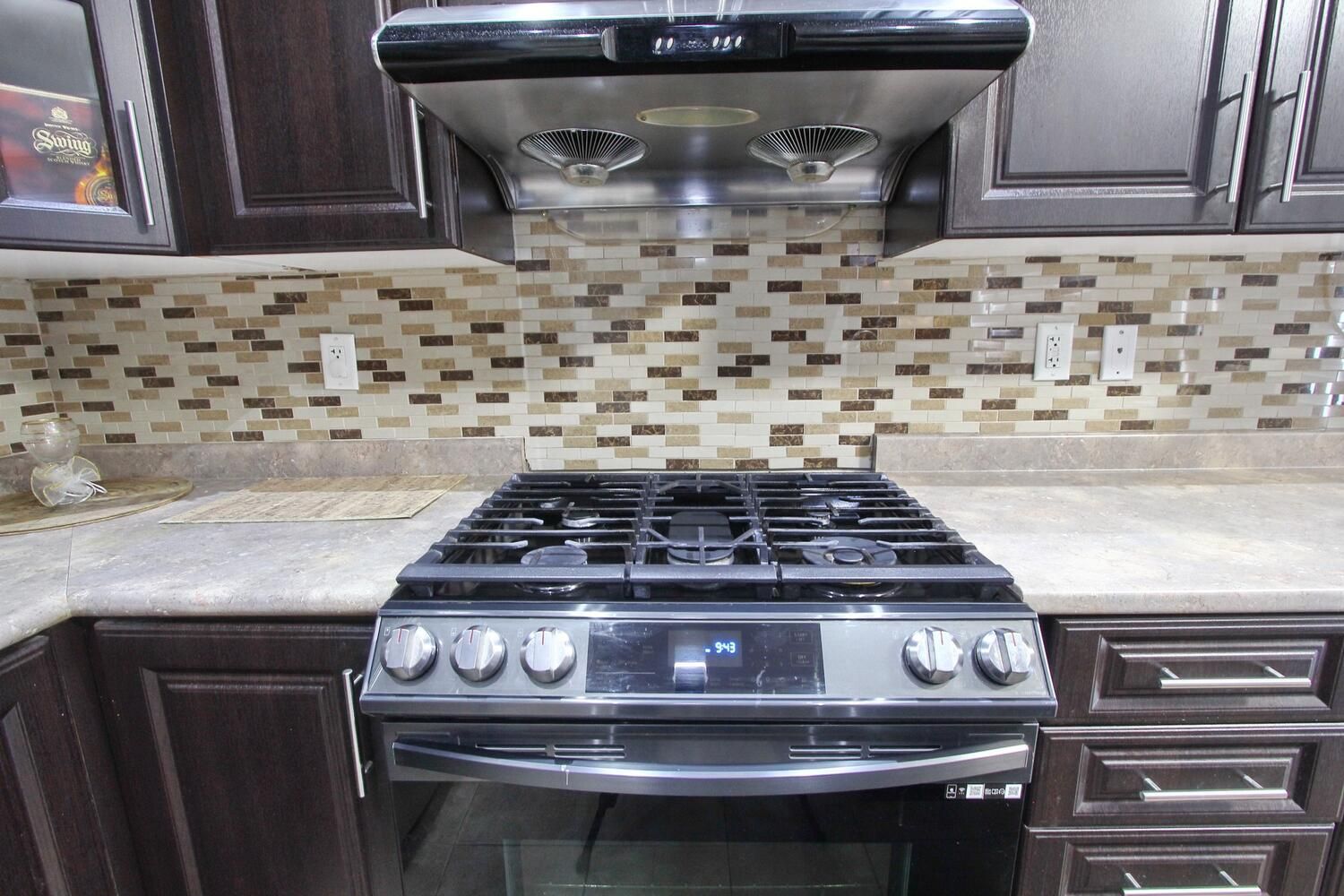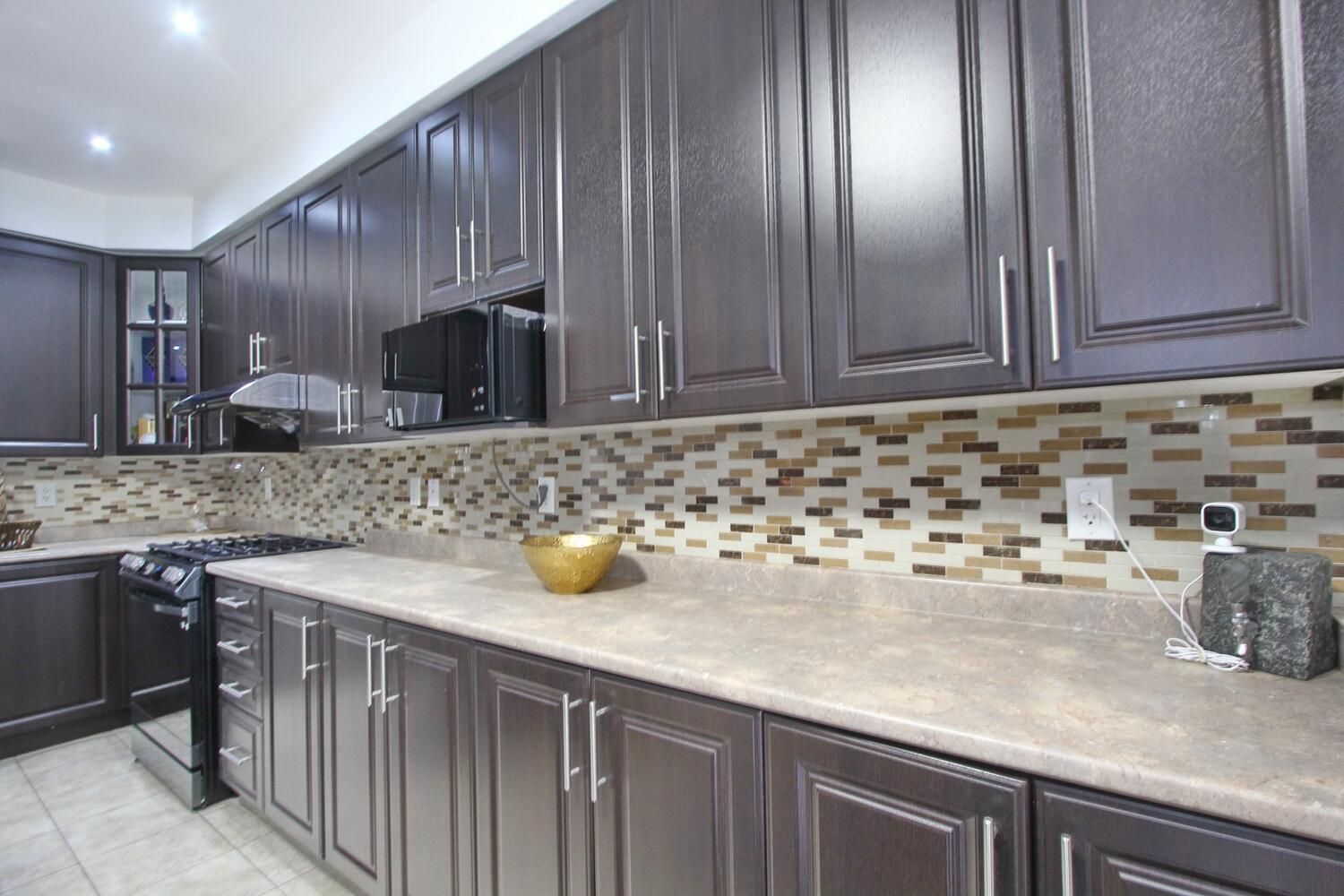 • Modern kitchen with stylish cabinets and backsplash, plus stainless steel appliances.