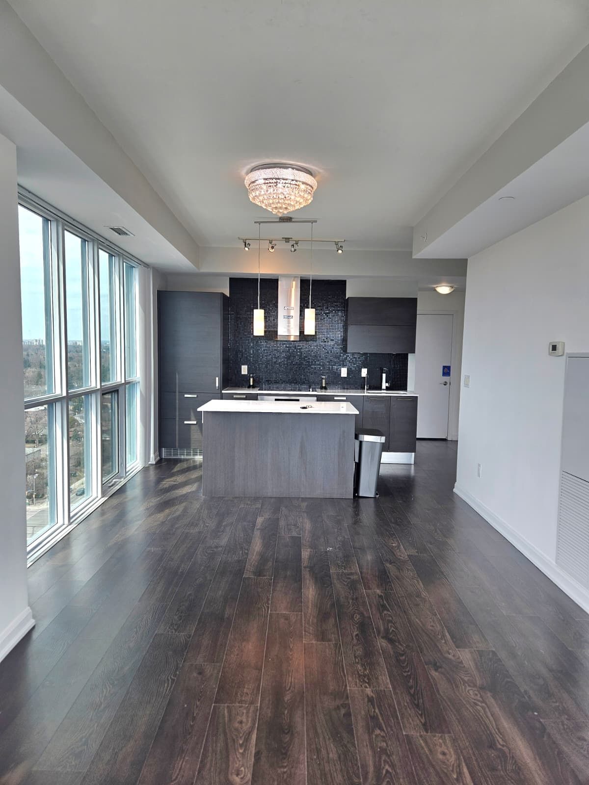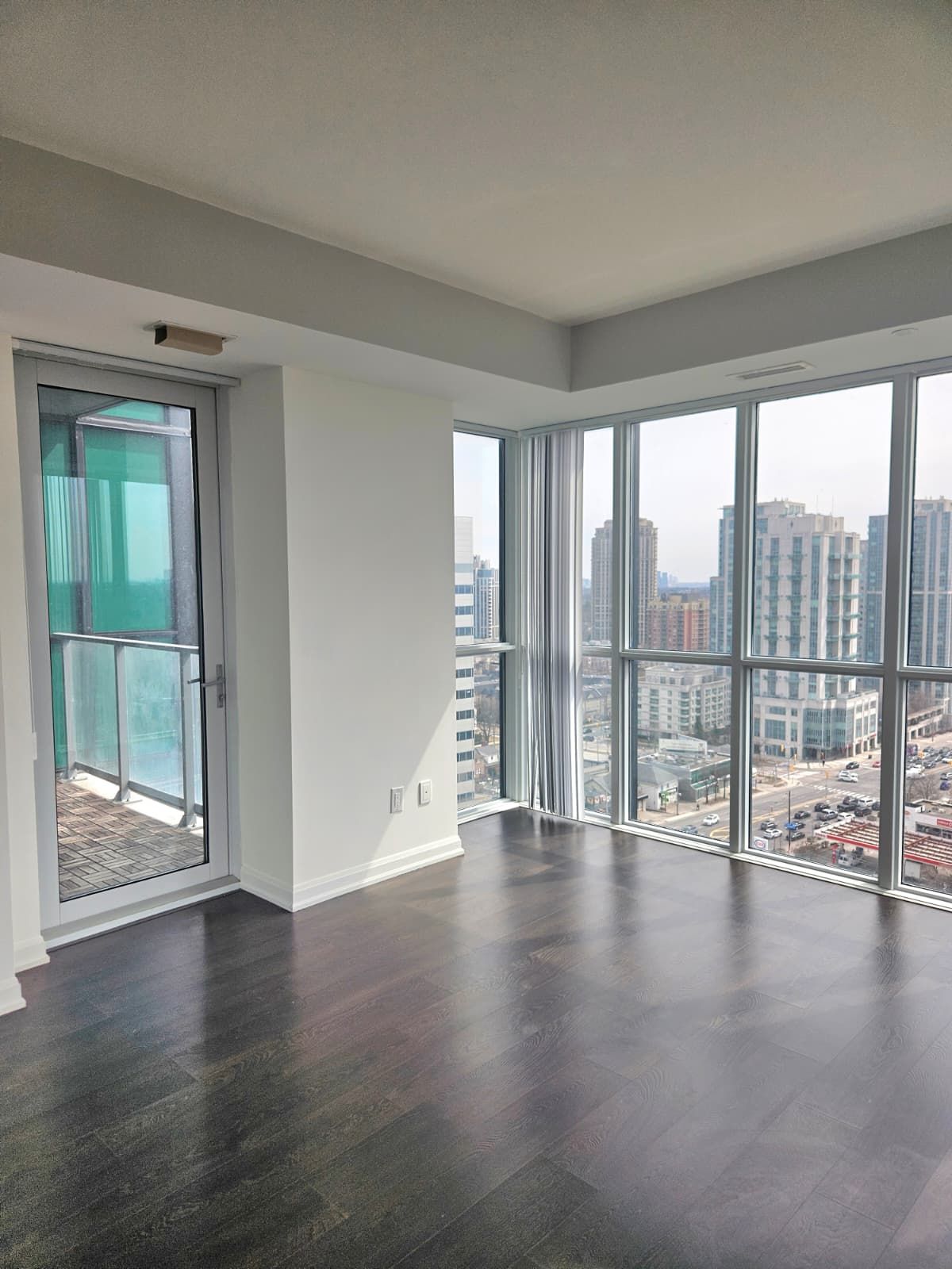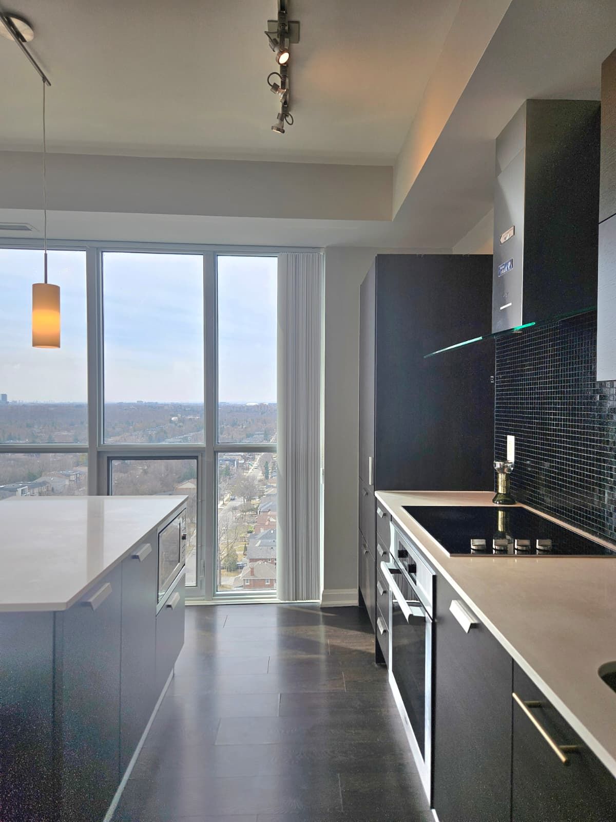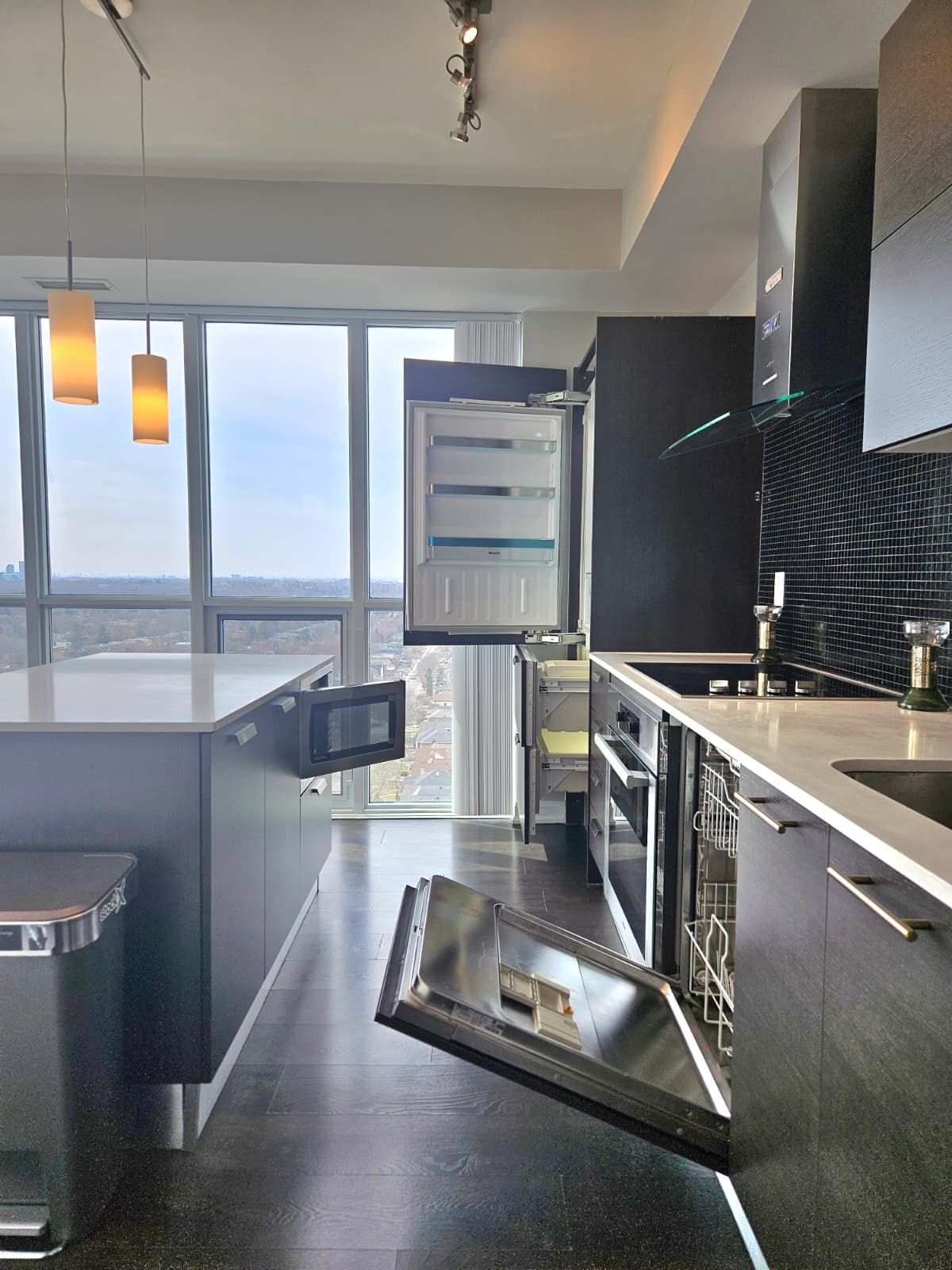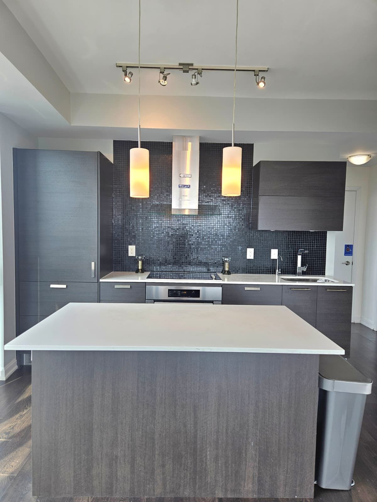 Corner unit 2 bedroom + dent for lease at emerald park. South and west corner suite. 9 ft. Ceiling. Floor to ceiling windows w/ unobstructed open city and sunset view. Open concept with large centre island w/ built-in microwave. Modern finishings w/ built-in oven, cooktop, fridge, dishwasher. Ensuite front load washer & dryer. 1 parking space & 1 locker included. Underground direct access to subway and ttc bus station. Quick access to 401, shops, supermarkets, restaurants, parks & school.