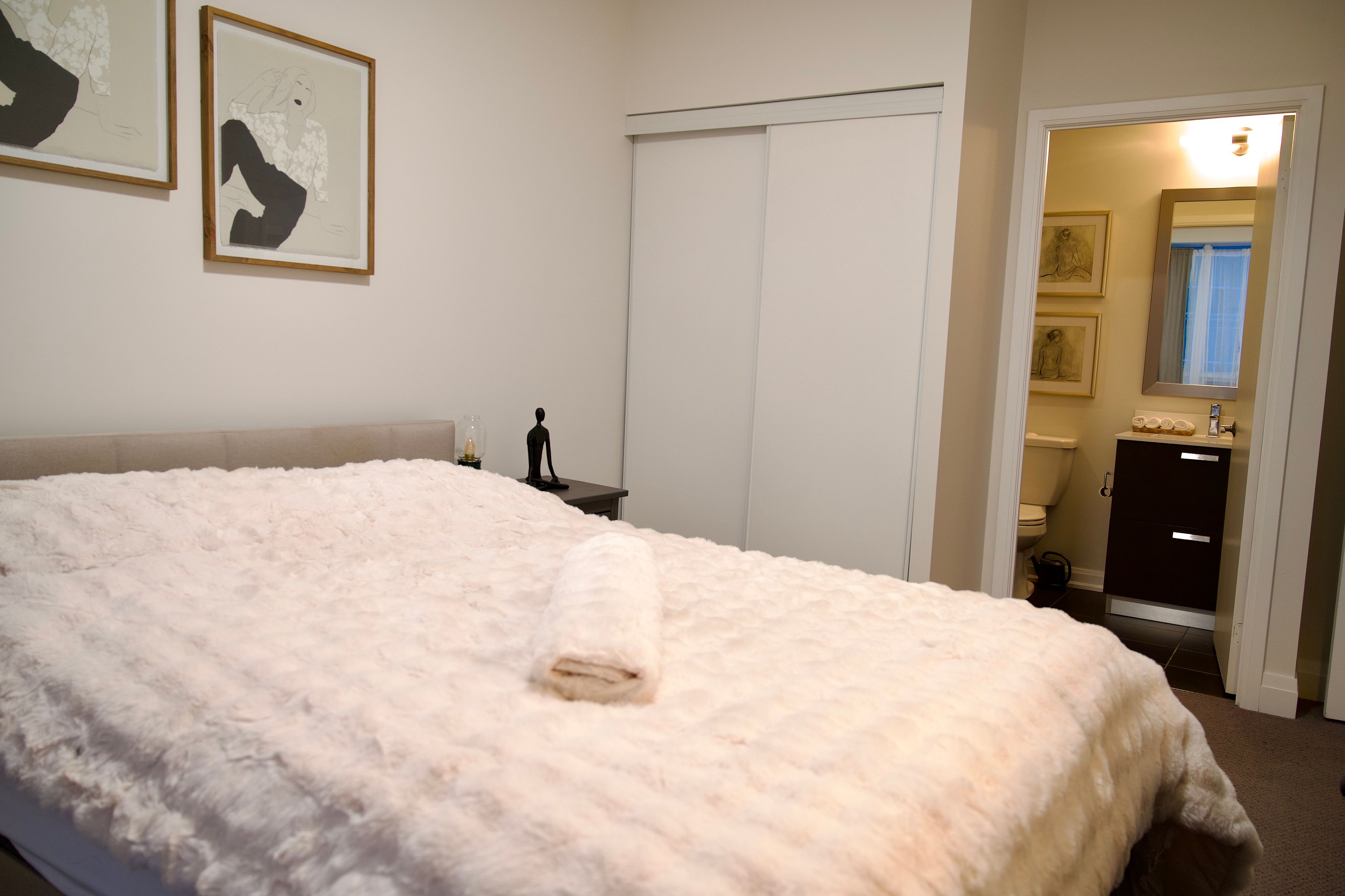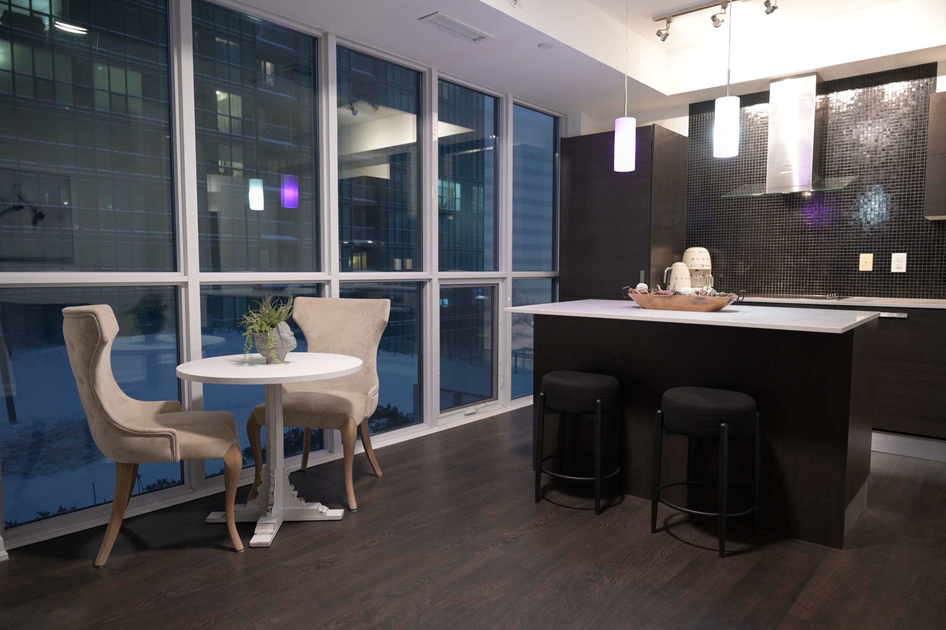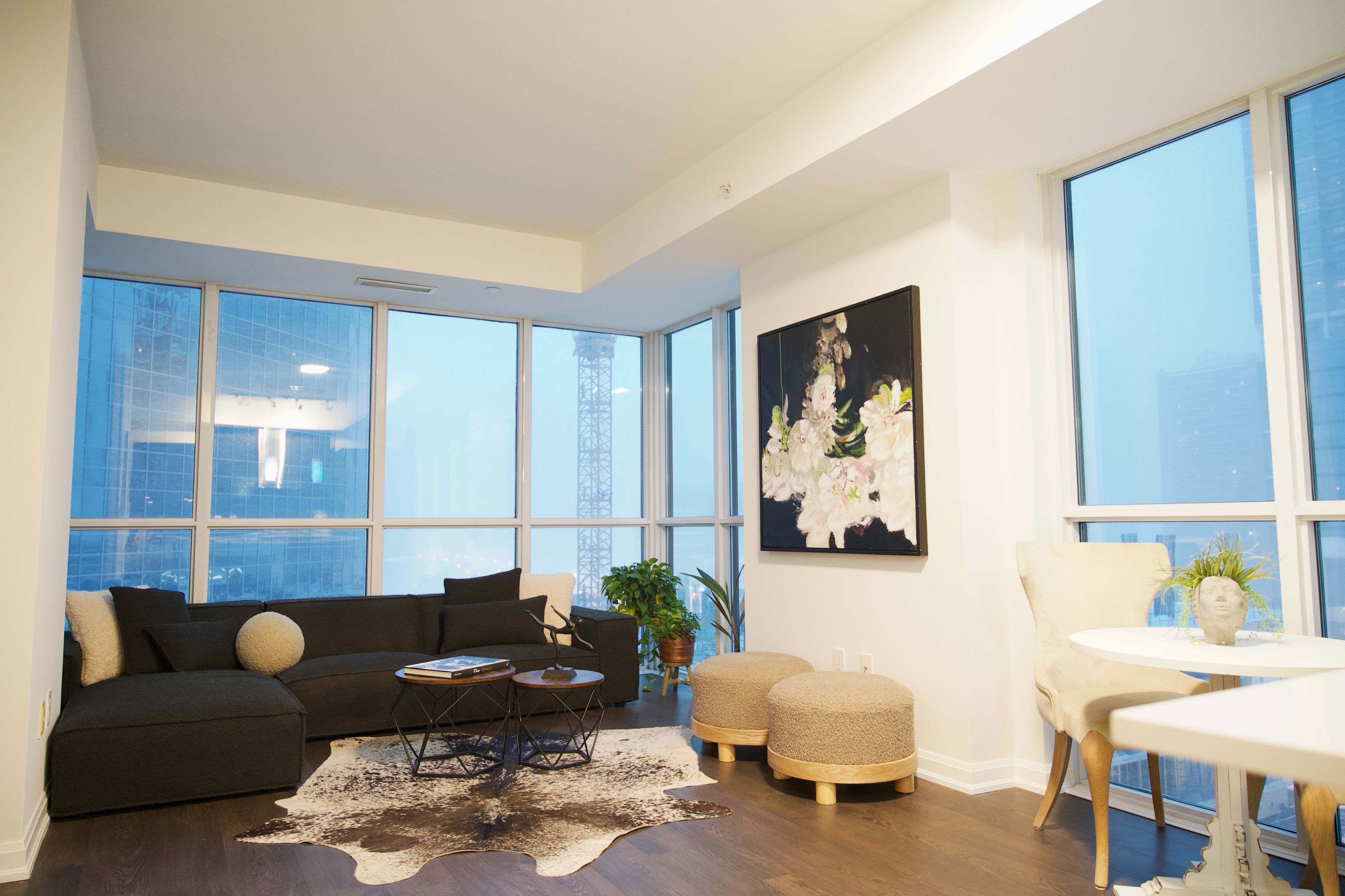 • Elegant corner suite with floor-to-ceiling windows and city views.