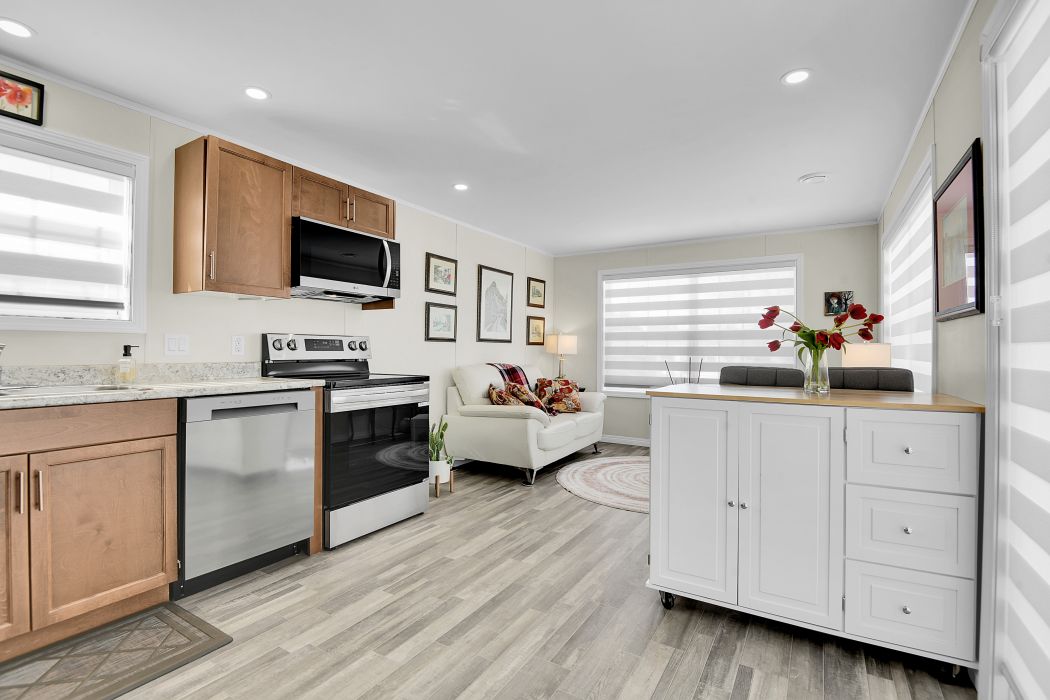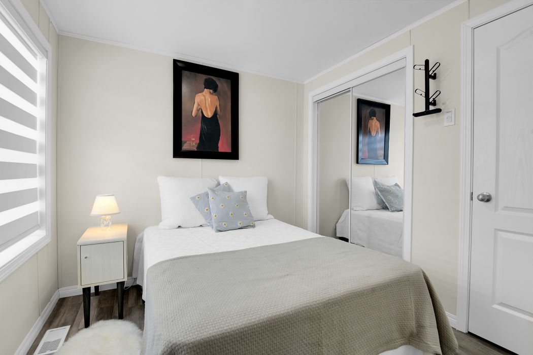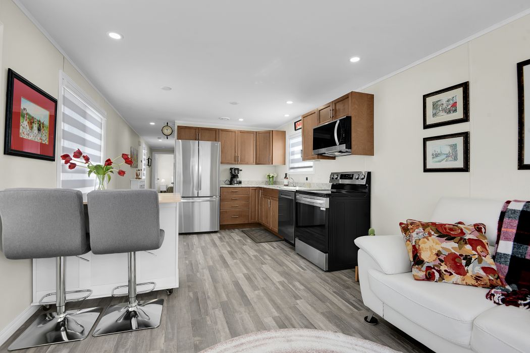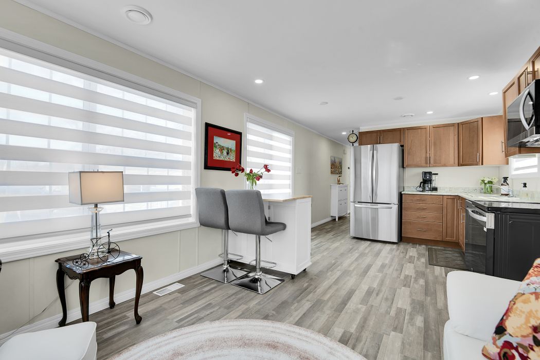 Like new condition - built 2022, feels like a new construction while offering easy, affordable, low-maintenance living. Discover the perfect blend of comfort, practicality, and value with this canadian-built mobile home, ideal for first-time buyers or downsizers looking for all the conveniences of a newer home without the high price tag, with the added benefit of single-level, bungalow-style living for maximum convenience. Located in the convenient bellwood community, you're just minutes from shopping and transit, making everyday living easy and accessible. Inside, enjoy a bright open-concept layout filled with natural light, enhanced by newly installed led pot lights for modern lighting throughout, along with custom high-quality blinds fitted on all windows for optimal convenience and privacy. The eat-in kitchen features upgraded wood cabinetry and a sliding patio door leading to a spacious deck spanning the entire length of the home -perfect for relaxing and entertaining. The versatile second bedroom works well for guests or a home office, while the primary bedroom offers plenty of natural light. A well-appointed full bathroom and convenient laundry nook add to the home's functionality. Monthly fees of $743 cover land lease, property taxes, and common area maintenance, making this an excellent option for those seeking simple, worry-free living. Whether you're entering the market or looking to downsize, this home delivers modern comfort at an unbeatable value - inquire to book your showing today!