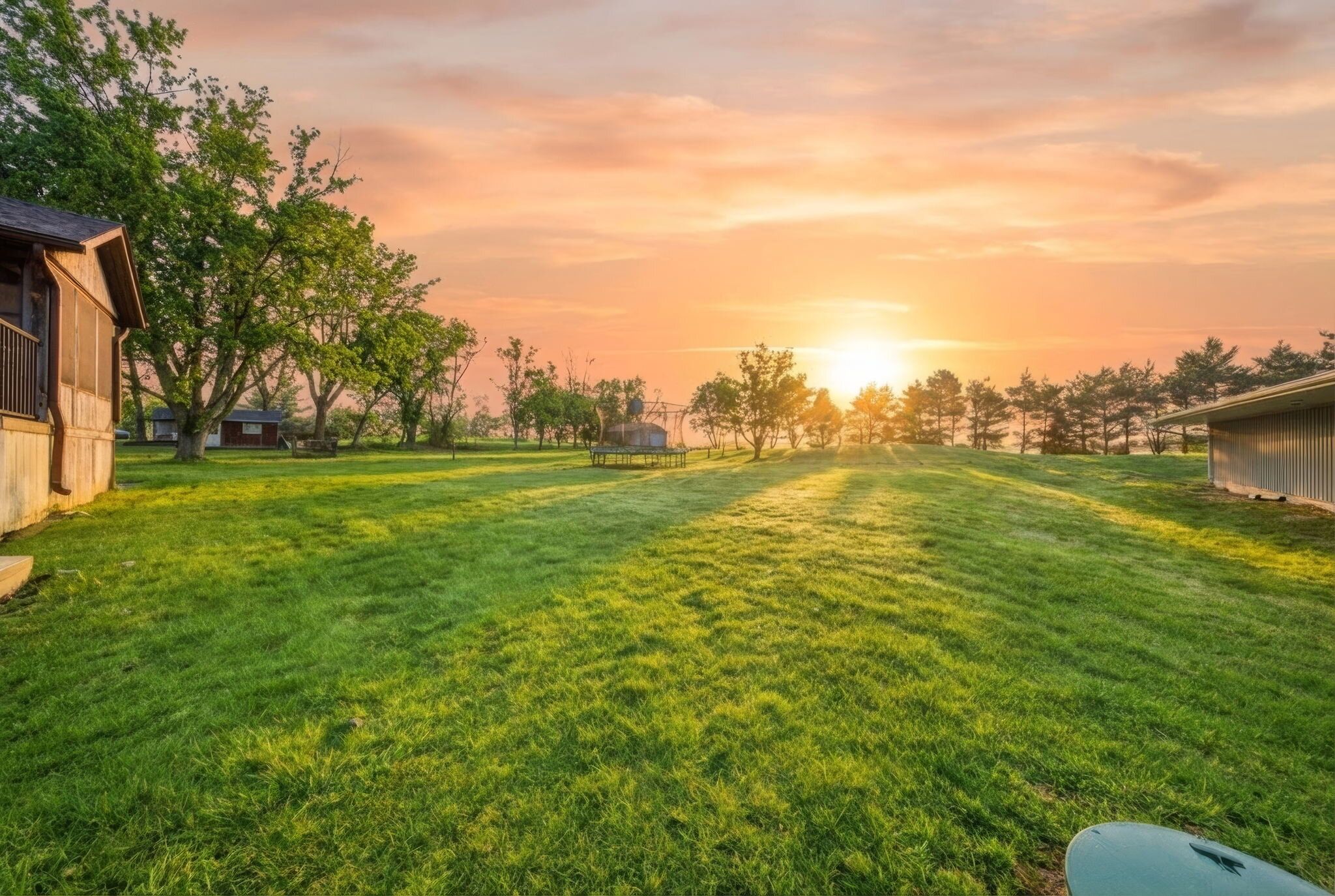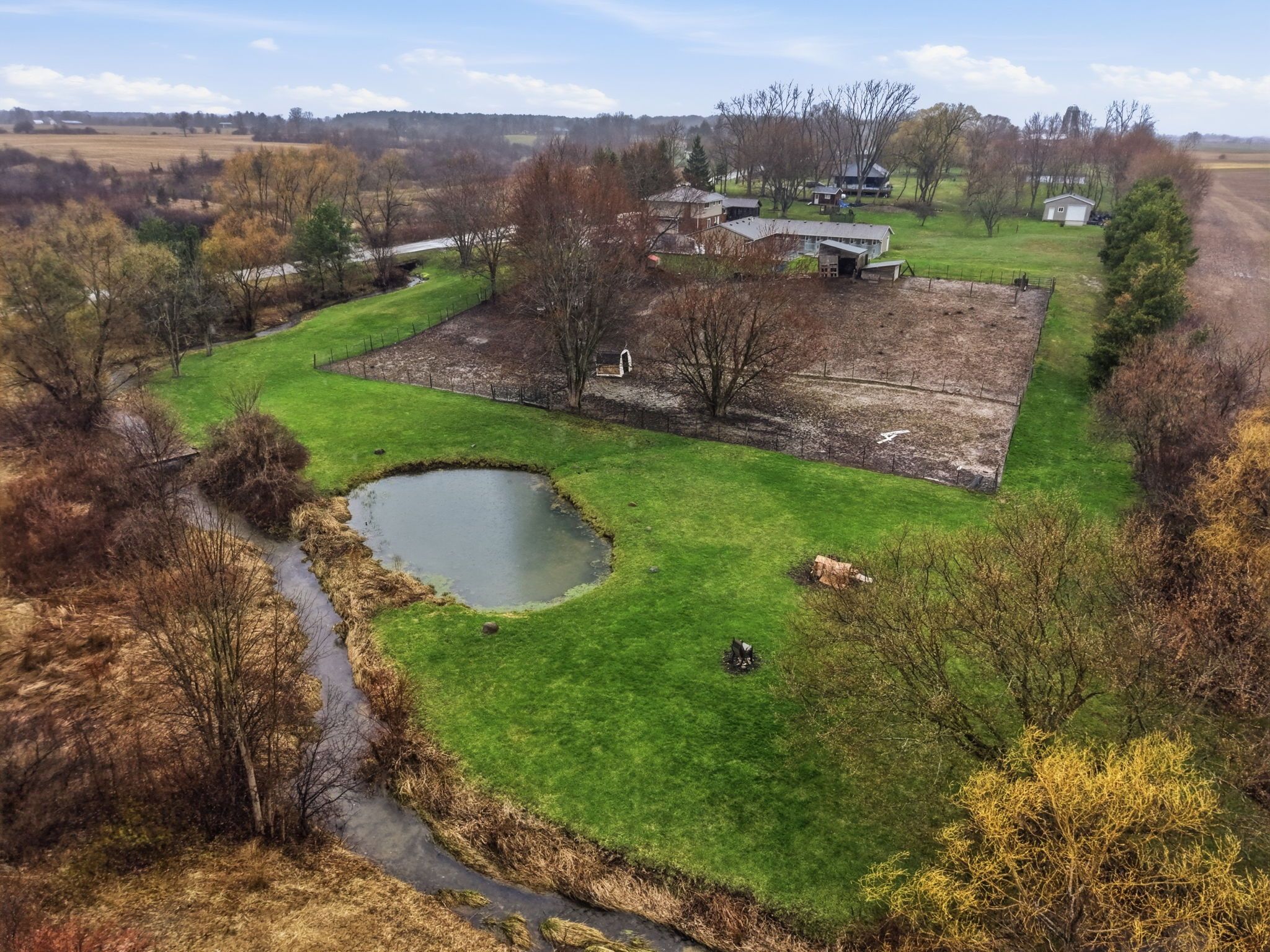 • Private outdoor space with creek, pond, and room for hobby farming.