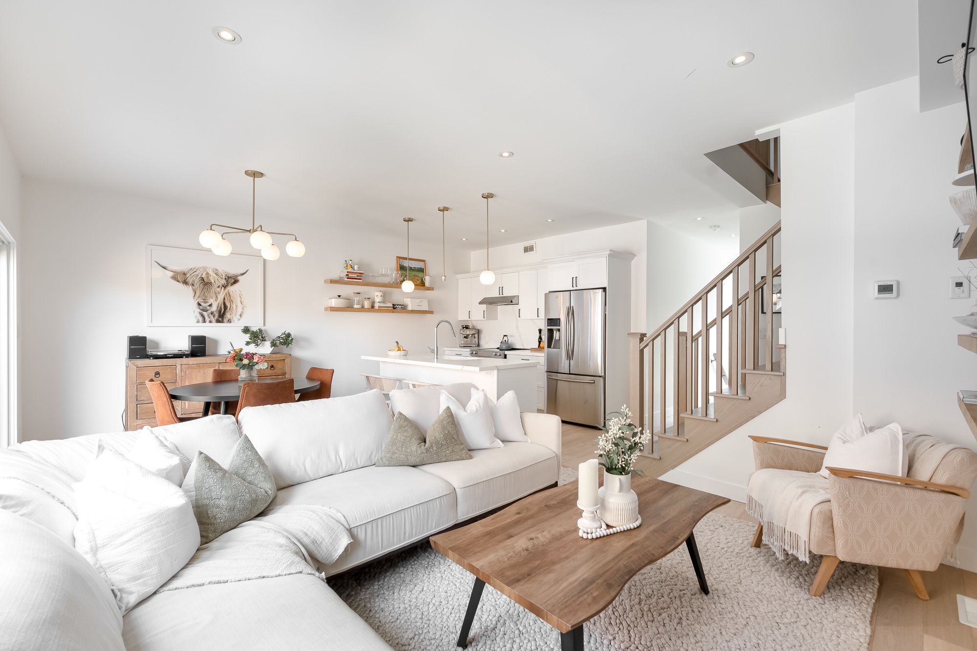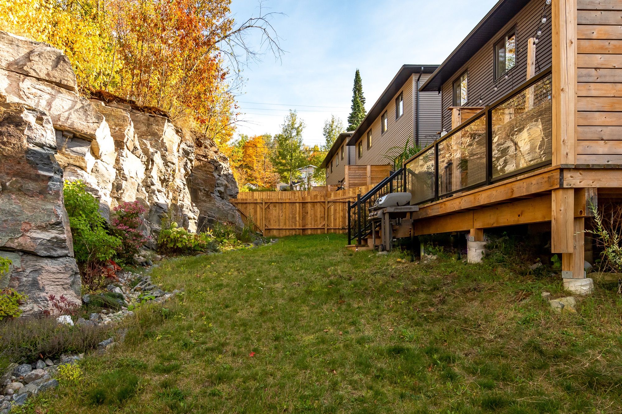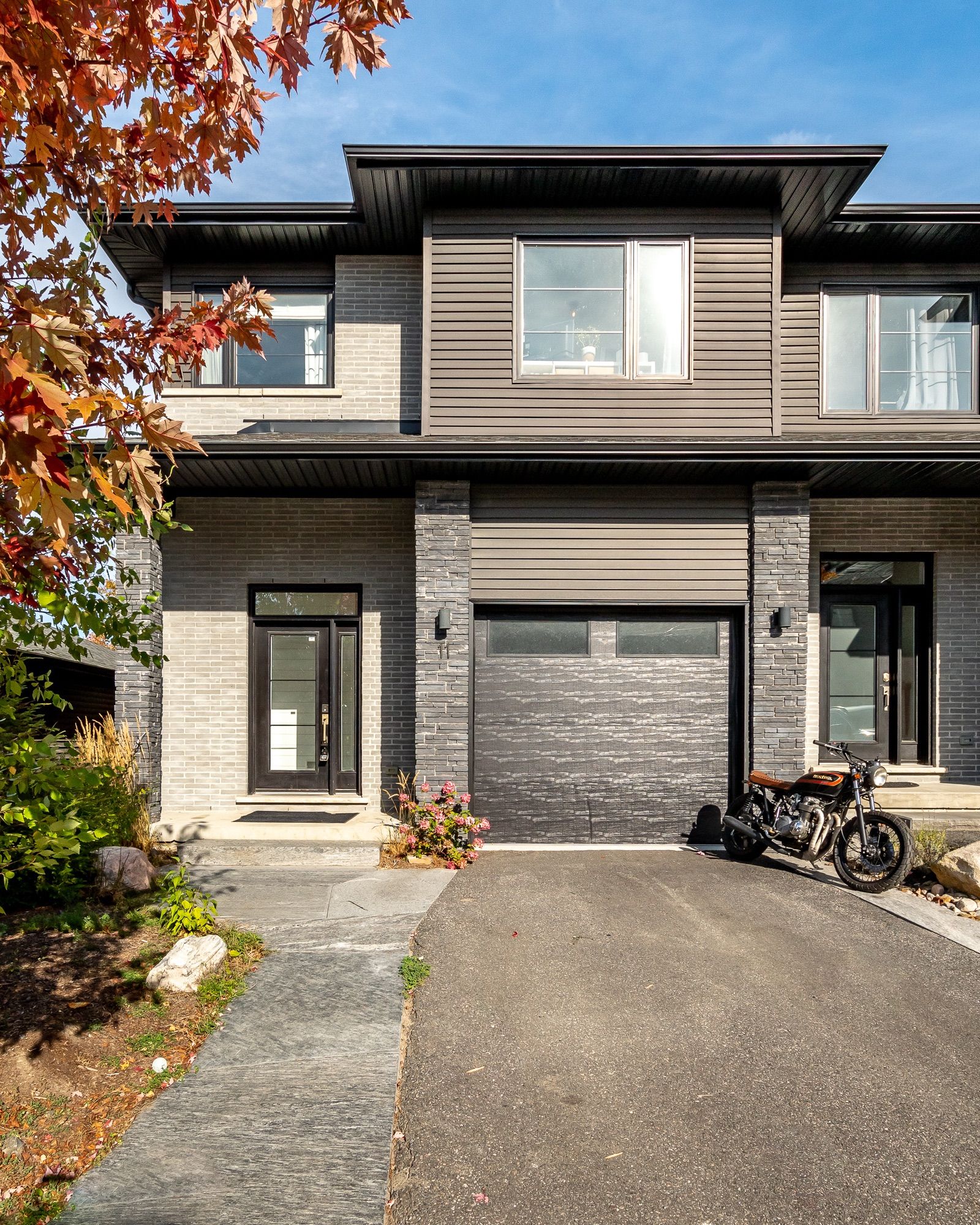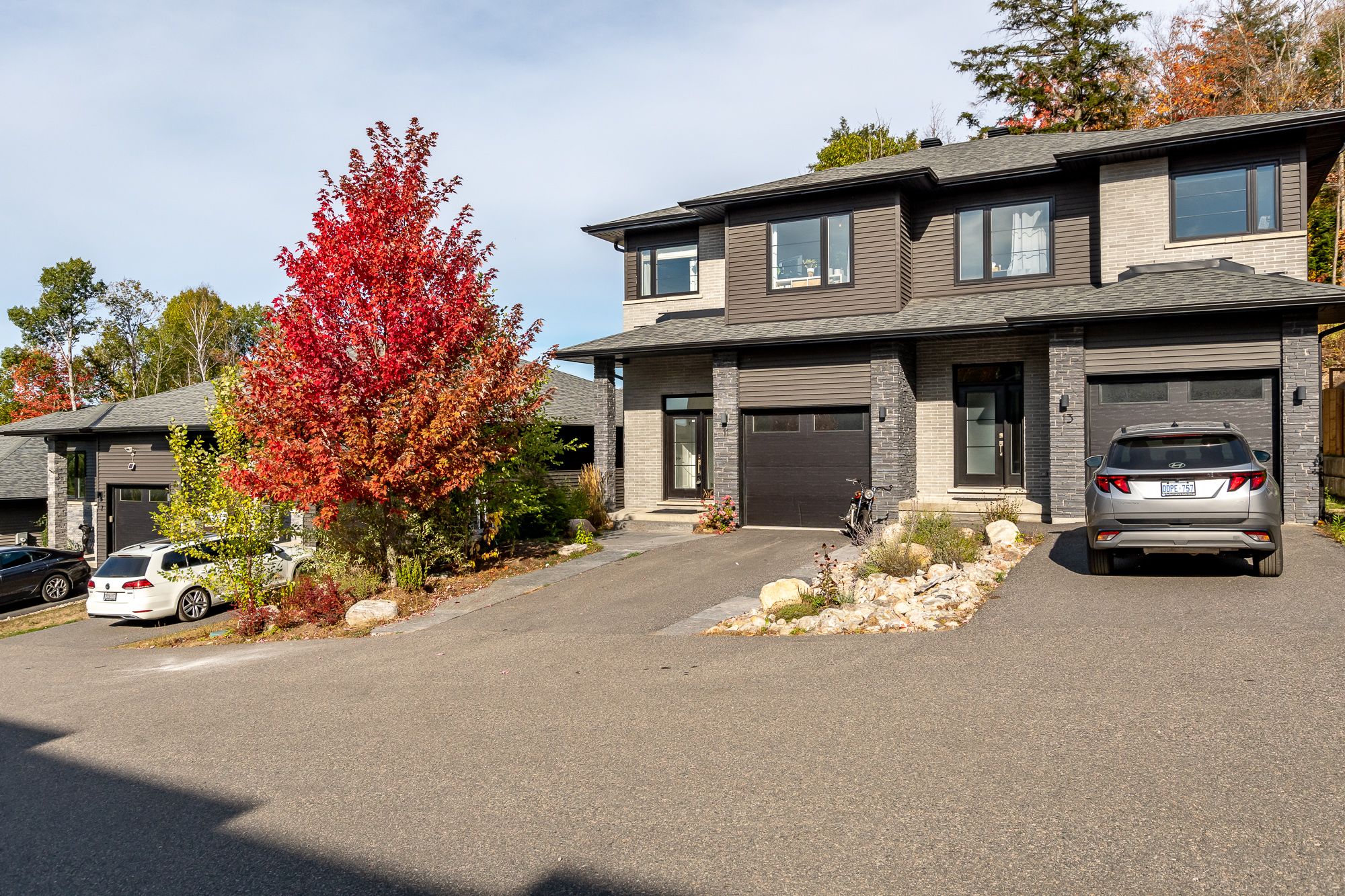 This end-unit townhouse combines comfort, style, and convenience in a sought-after location. A private paved driveway and covered porch entry welcome you, with the neutral exterior palette of stone and vinyl adding timeless curb appeal. Inside, a spacious foyer with a large closet and direct access from the single-car garage creates a practical entry point. The open-concept main floor blends living, dining, and kitchen spaces, designed for everyday living and entertaining. The kitchen features quartz countertops, a generous island with breakfast bar seating, floating shelves, and shiplap accents that continues in the living room for a modern touch. Sliding doors lead to a spacious deck overlooking the beautiful rockscape behind the home, offering a peaceful and private outdoor retreat. Upstairs are three bedrooms, including a primary suite with walk-in closet and a 4-piece ensuite complete with a soaker tub and separate glass shower. Two additional bedrooms share a well-appointed 4-piece bathroom, while the laundry is conveniently located on this level. The lower level provides great storage options for your needs. On full municipal services including natural gas, water, sewer, and high-speed internet, this home ensures convenience and efficiency. With quick access to highway 11 for commuting and just minutes to town for shops, and amenities, this property is an ideal blend of modern living and prime location.