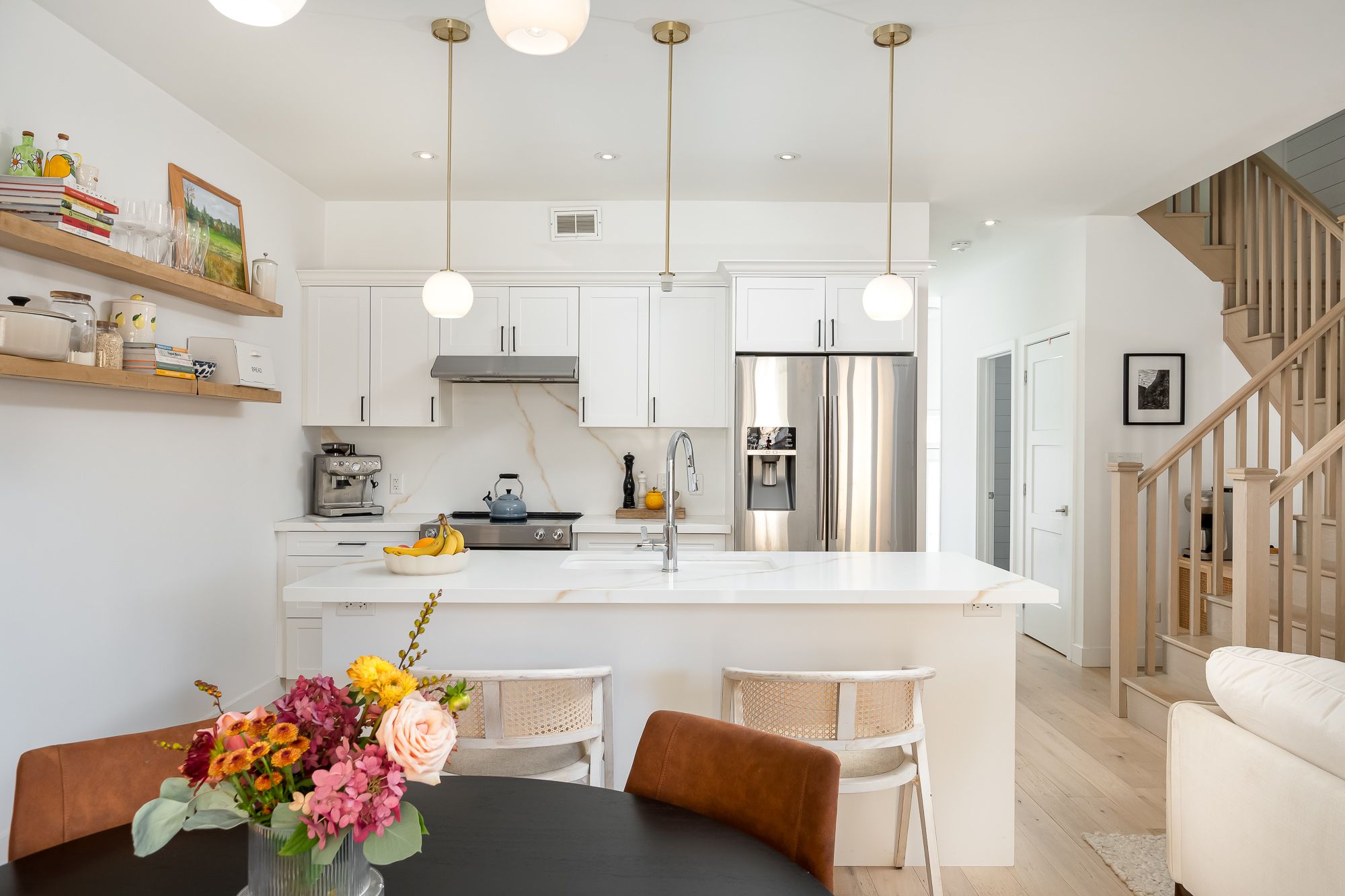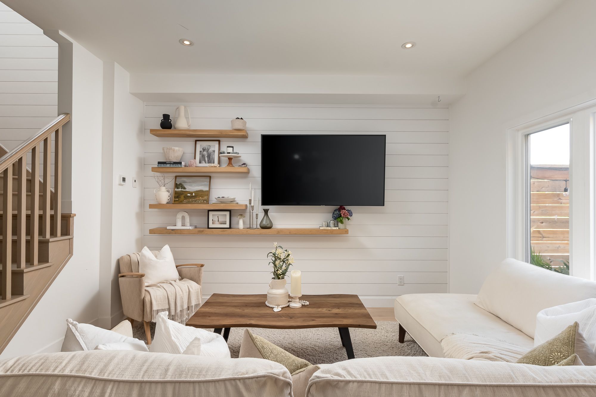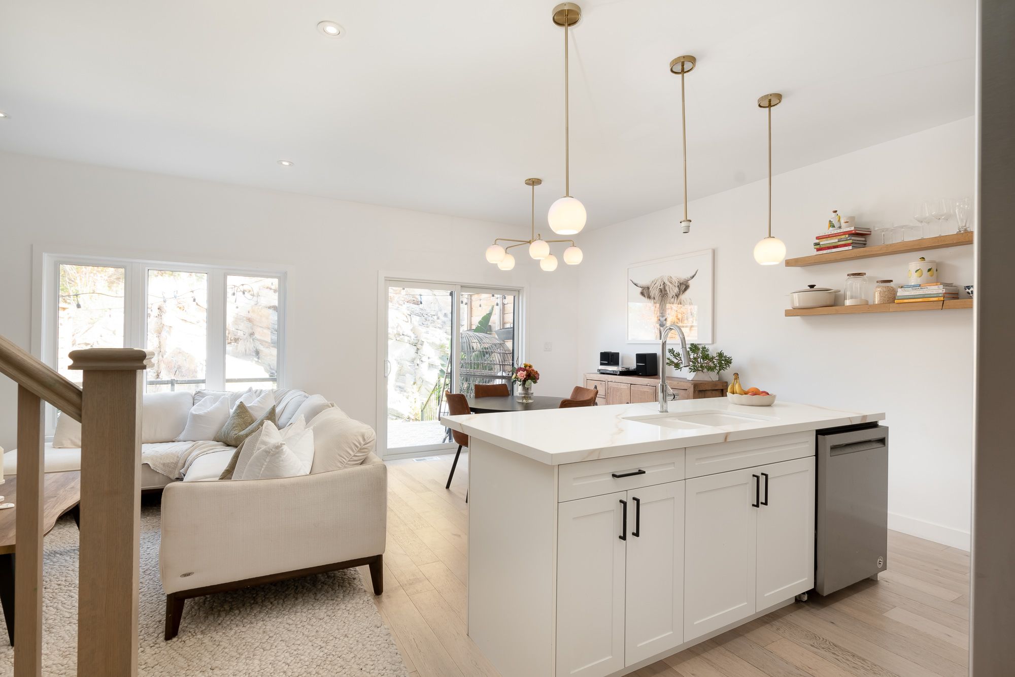 This end-unit townhouse combines comfort, style, and convenience in a sought-after location. A private paved driveway and covered porch entry welcome you, with the neutral exterior palette of stone and vinyl adding timeless curb appeal. Inside, a spacious foyer with a large closet and direct access from the single-car garage creates a practical entry point. The open-concept main floor blends living, dining, and kitchen spaces, designed for everyday living and entertaining. The kitchen features quartz countertops, a generous island with breakfast bar seating, floating shelves, and shiplap accents that continues in the living room for a modern touch. Sliding doors lead to a spacious deck overlooking the beautiful rockscape behind the home, offering a peaceful and private outdoor retreat. Upstairs are three bedrooms, including a primary suite with walk-in closet and a 4-piece ensuite complete with a soaker tub and separate glass shower. Two additional bedrooms share a well-appointed 4-piece bathroom, while the laundry is conveniently located on this level. The lower level provides great storage options for your needs. On full municipal services including natural gas, water, sewer, and high-speed internet, this home ensures convenience and efficiency. With quick access to highway 11 for commuting and just minutes to town for shops, and amenities, this property is an ideal blend of modern living and prime location.