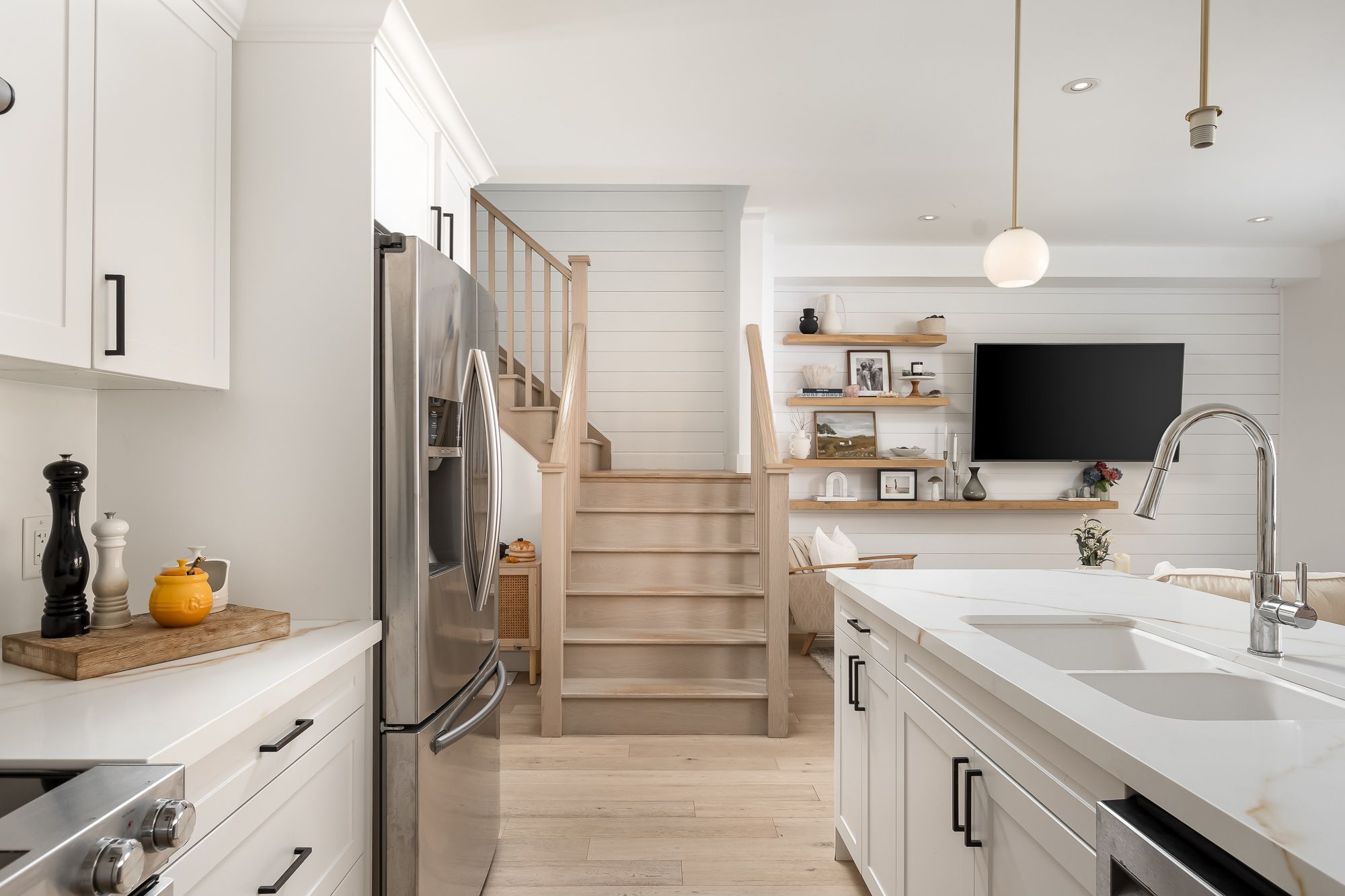 • Modern kitchen with quartz countertops and an island for casual dining.