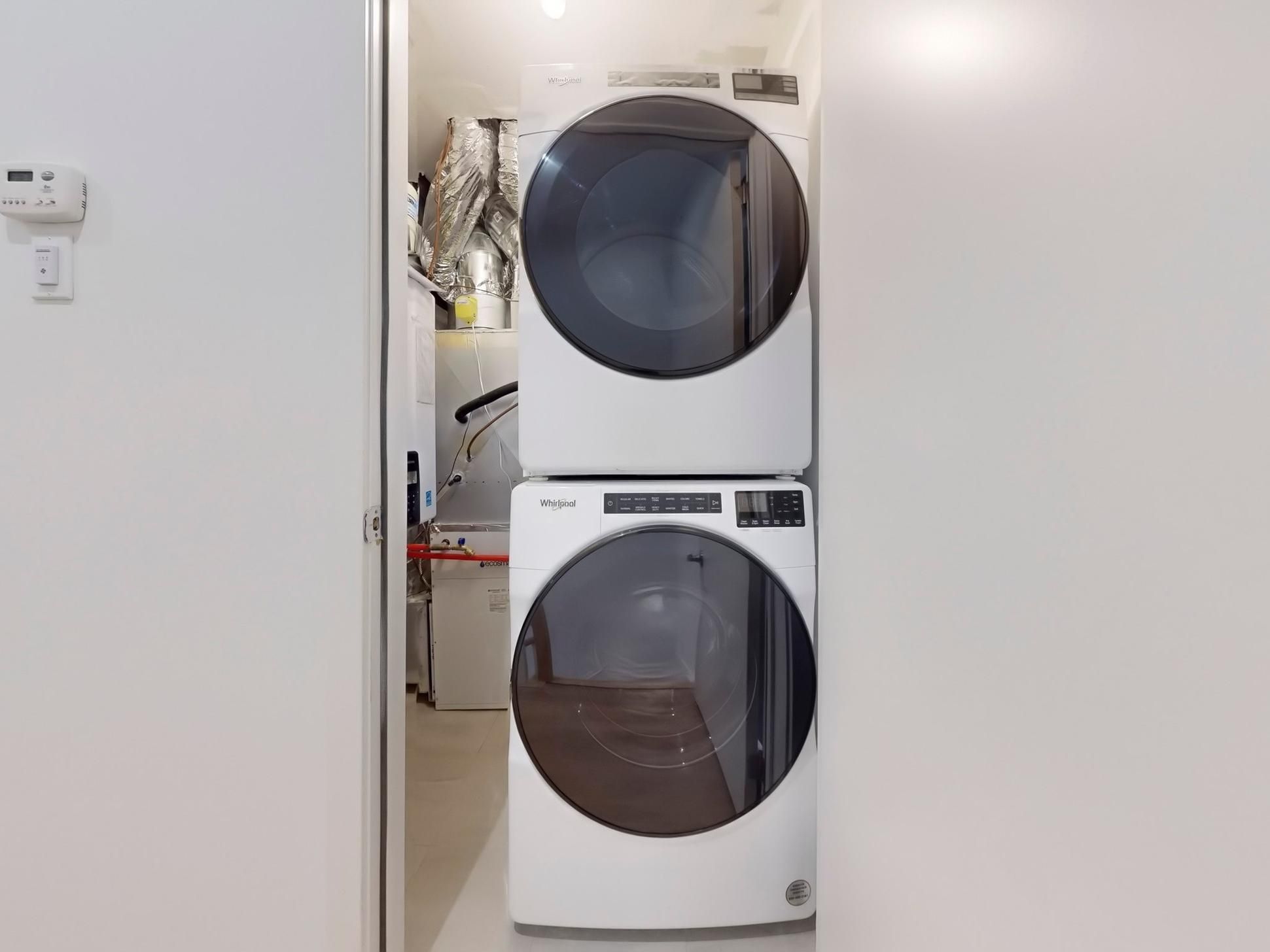 • Modern kitchen features stainless steel appliances and quartz countertop.