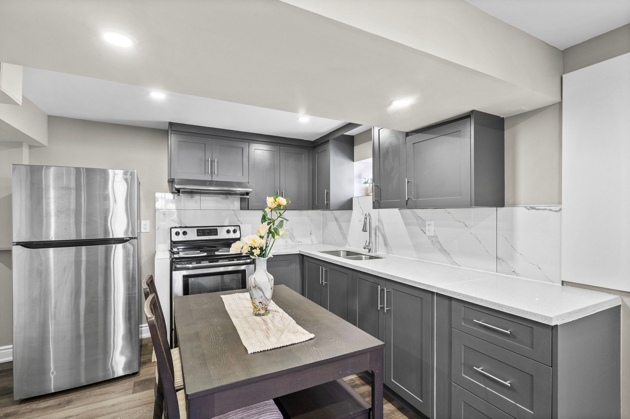 • Modern kitchen with stainless steel appliances and quartz countertops.
