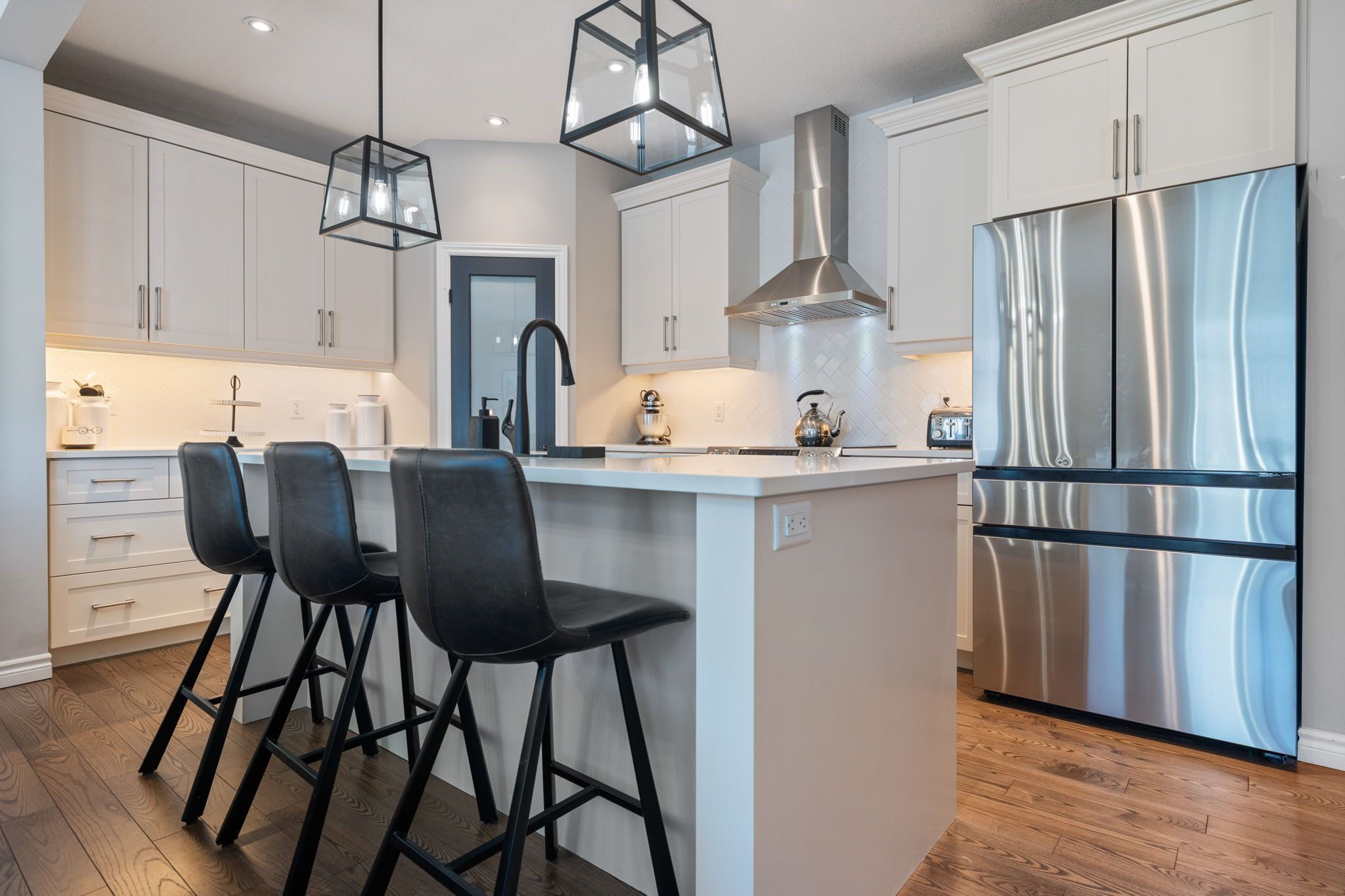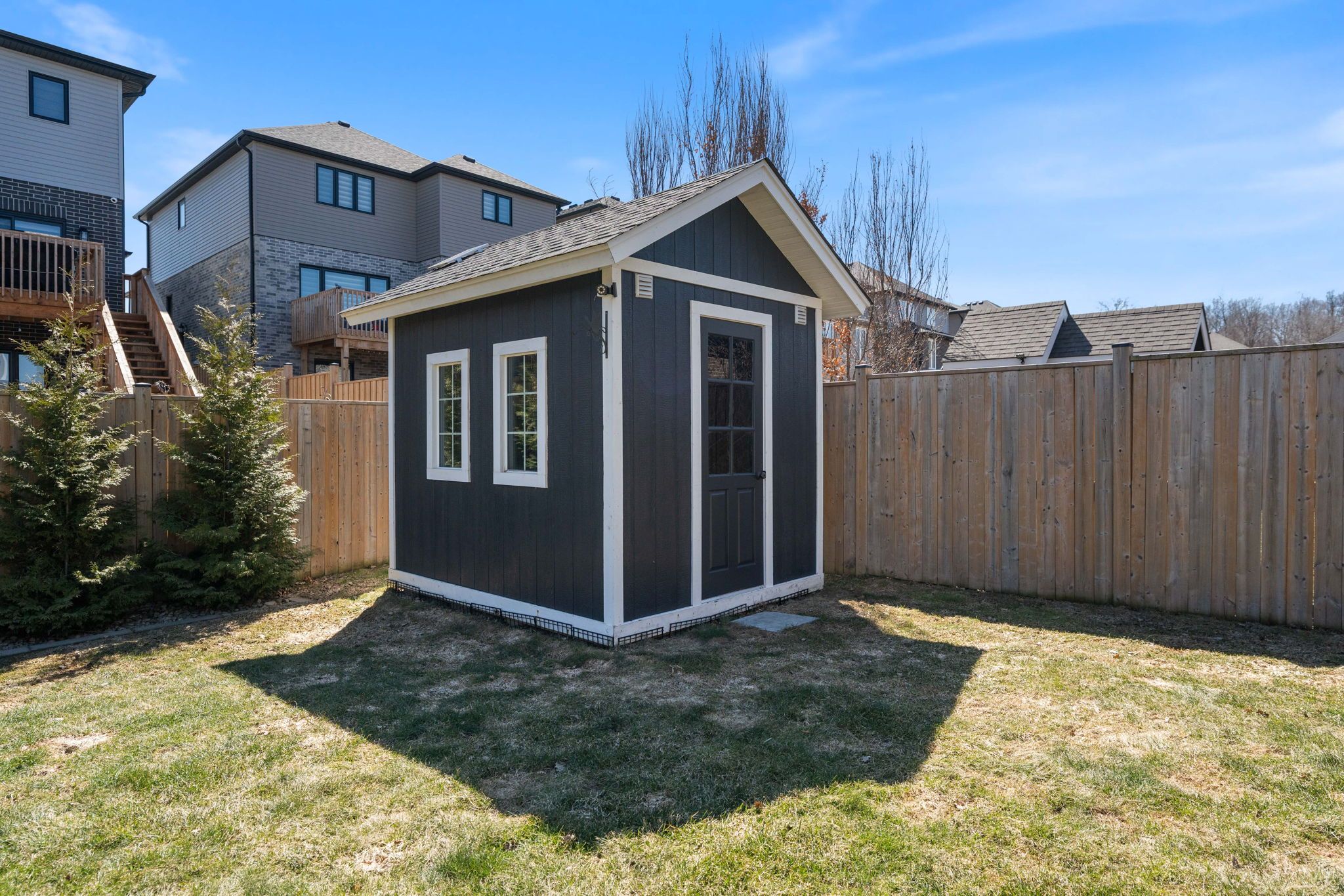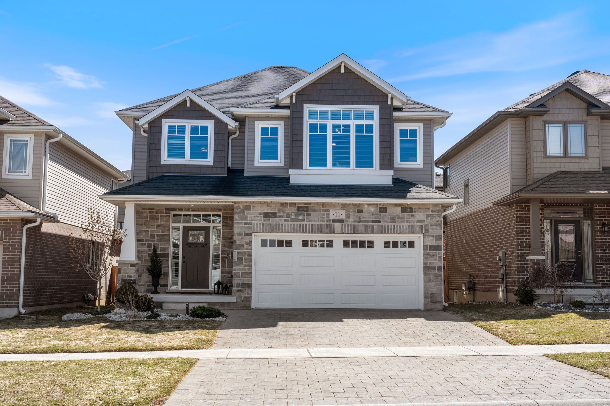 This home has it all... Impeccable curb appeal, impressive mainfloor, and one of the largest primary suites i've seen.... Welcome to 11 chamberlain avenue! Beautiful craftsman styled exterior with stone front, stunning main floor with 9' ceilings, bright and spacious kitchen featuring corner pantry, huge island with seating, quartz countertops and herringbone pattern tiled backspash. The large livingroom has built-in cabinets and shelving, lots of natural light and a great layout for entertaining, the dining area features banquette seating with storage. From the dining area there is a sliding door to the covered deck overlooking the fully fenced yard. Upstairs there are 3 bedrooms, 2 bathrooms and laundry room, the spacious primary bedroom has a 'spa-like' 5pc ensuite with soaker tub & tile/glass shower. The basement is finished with a stylish familyroom, bedroom with walk-in closet, 3-pc bathroom and storage. Additional features include, mudroom with bench, closet and 2-pc powder room, upgraded lighting throughout, california shutters and a cute shed out back. This home will not disappoint.