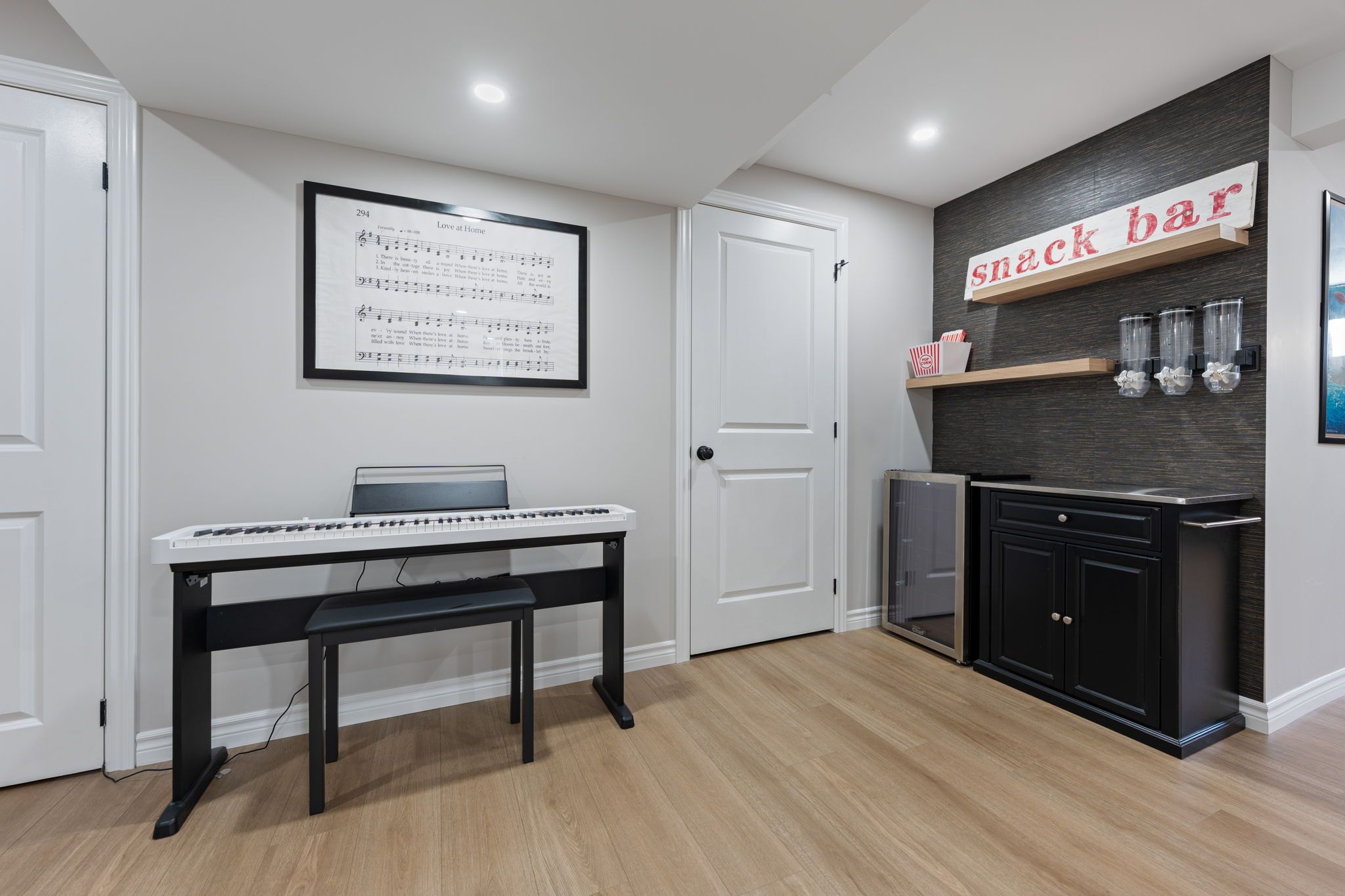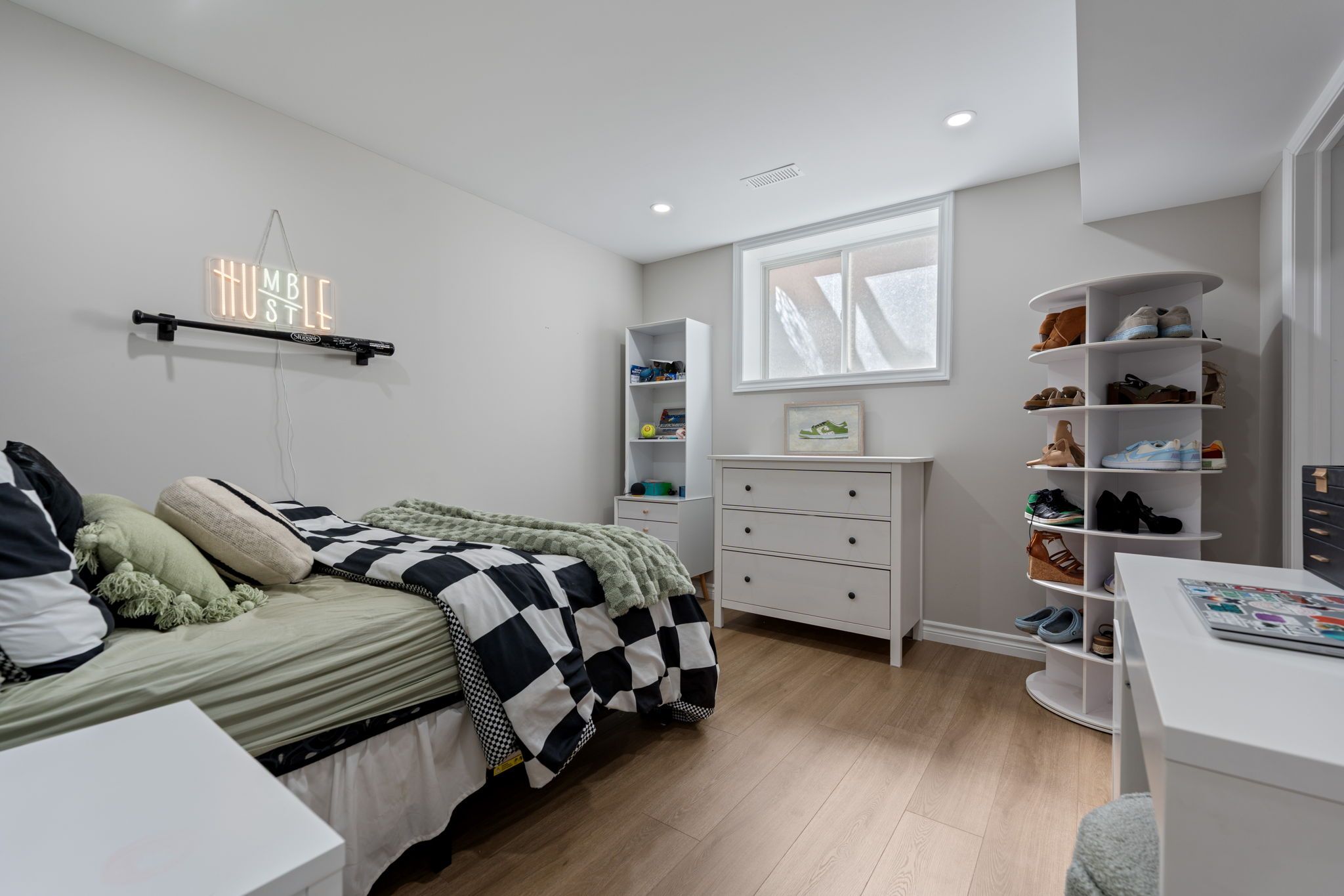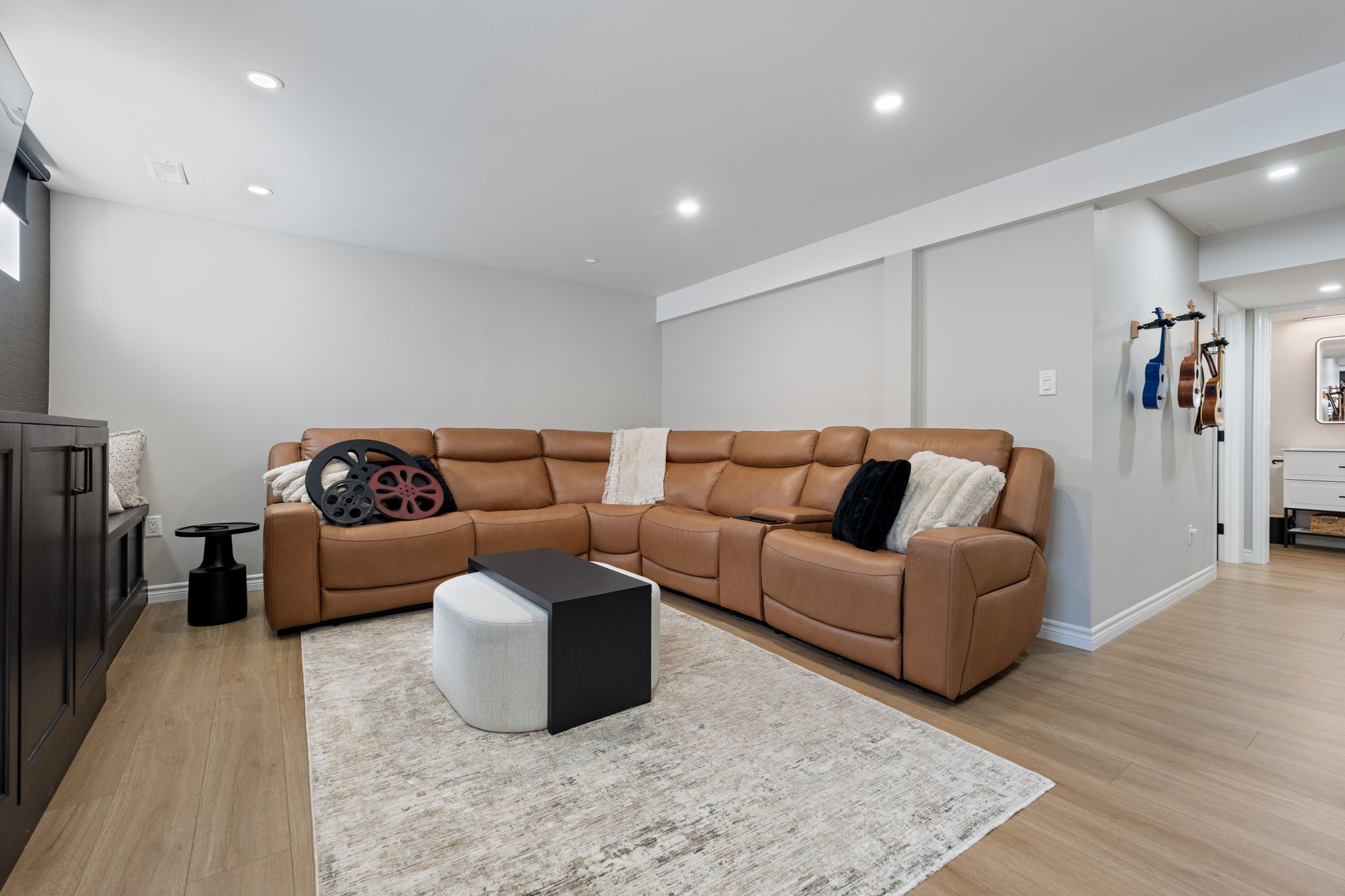 • Finished basement with family room, bedroom, and extra storage space.