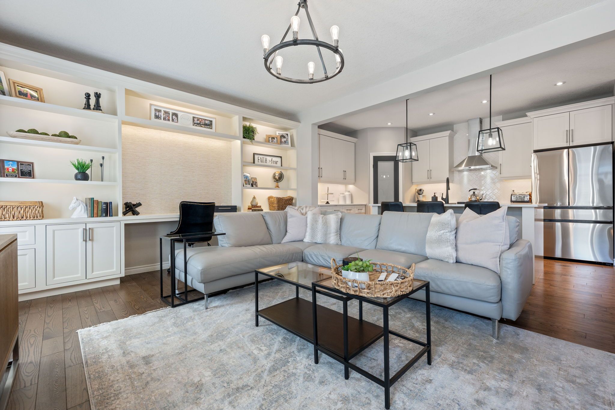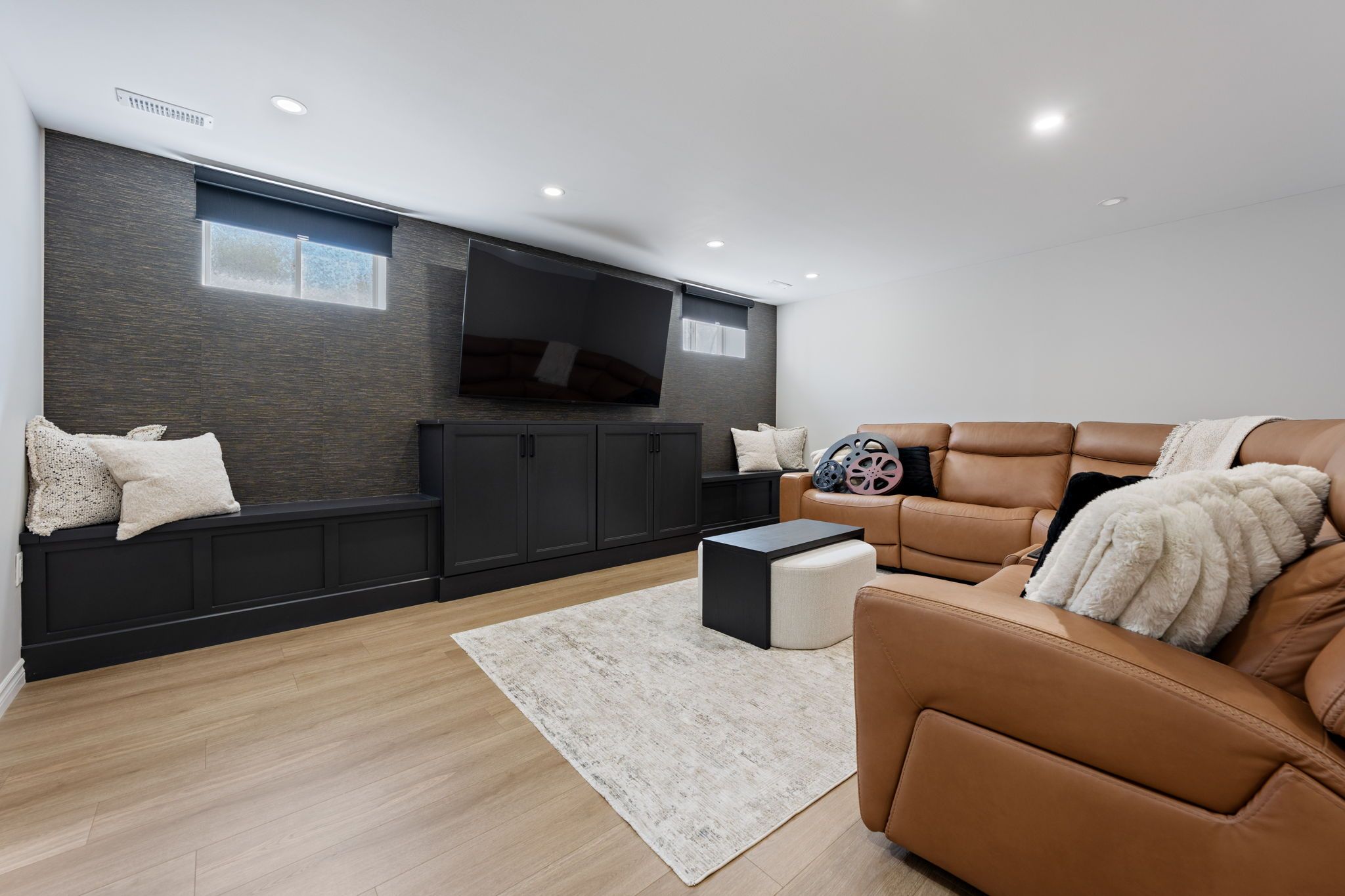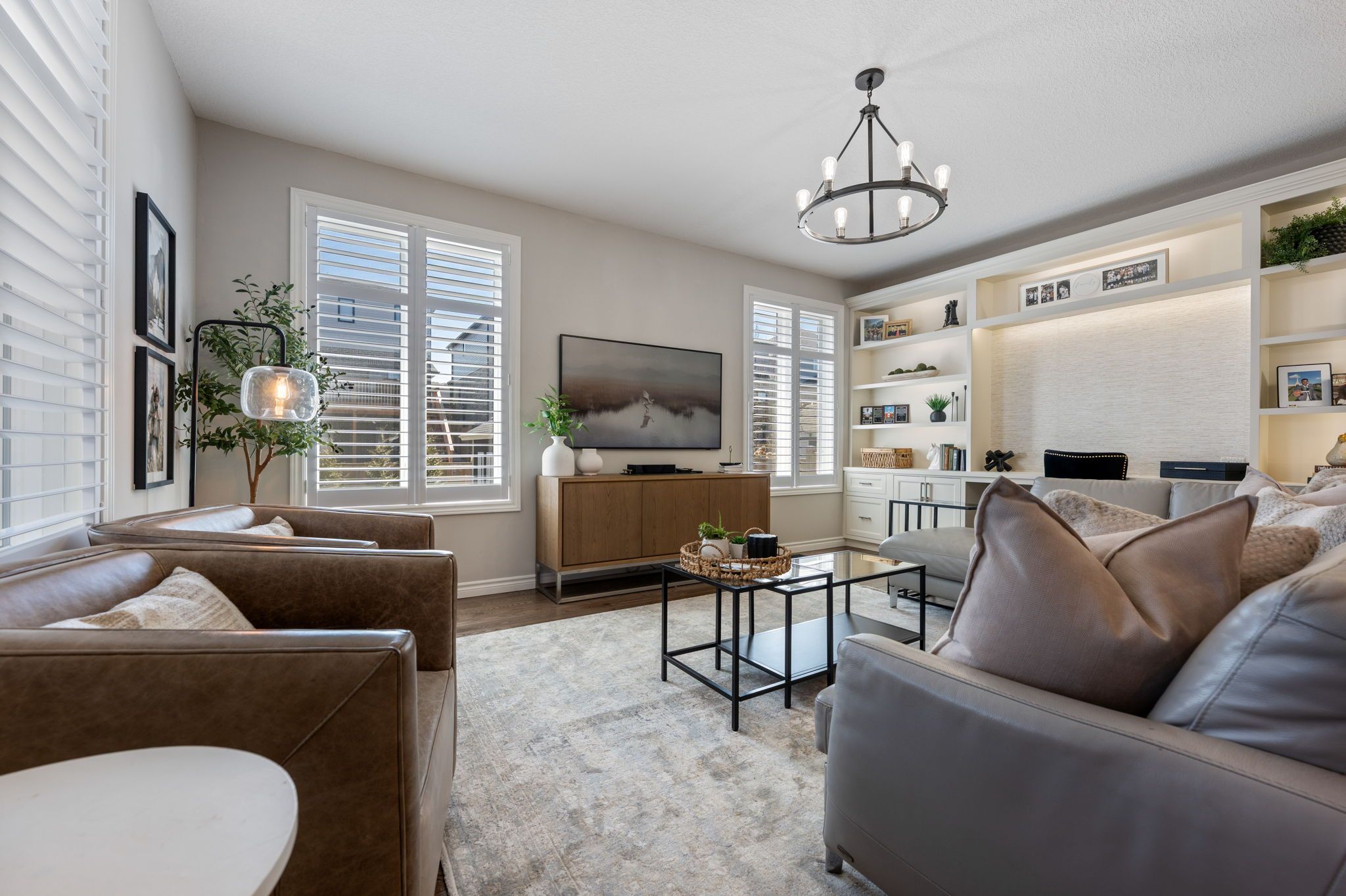 • Large living room with built-in cabinets and lots of natural light.