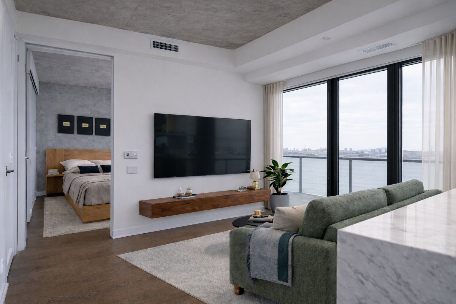 • Unique design features like floor-to-ceiling windows and exposed concrete.