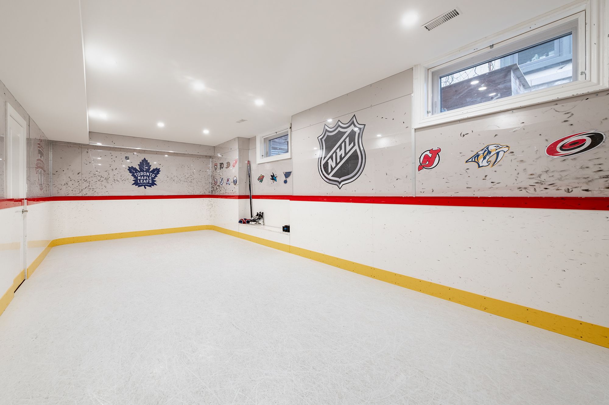 • Lower level features a gym, wet bar, and unique indoor hockey rink.