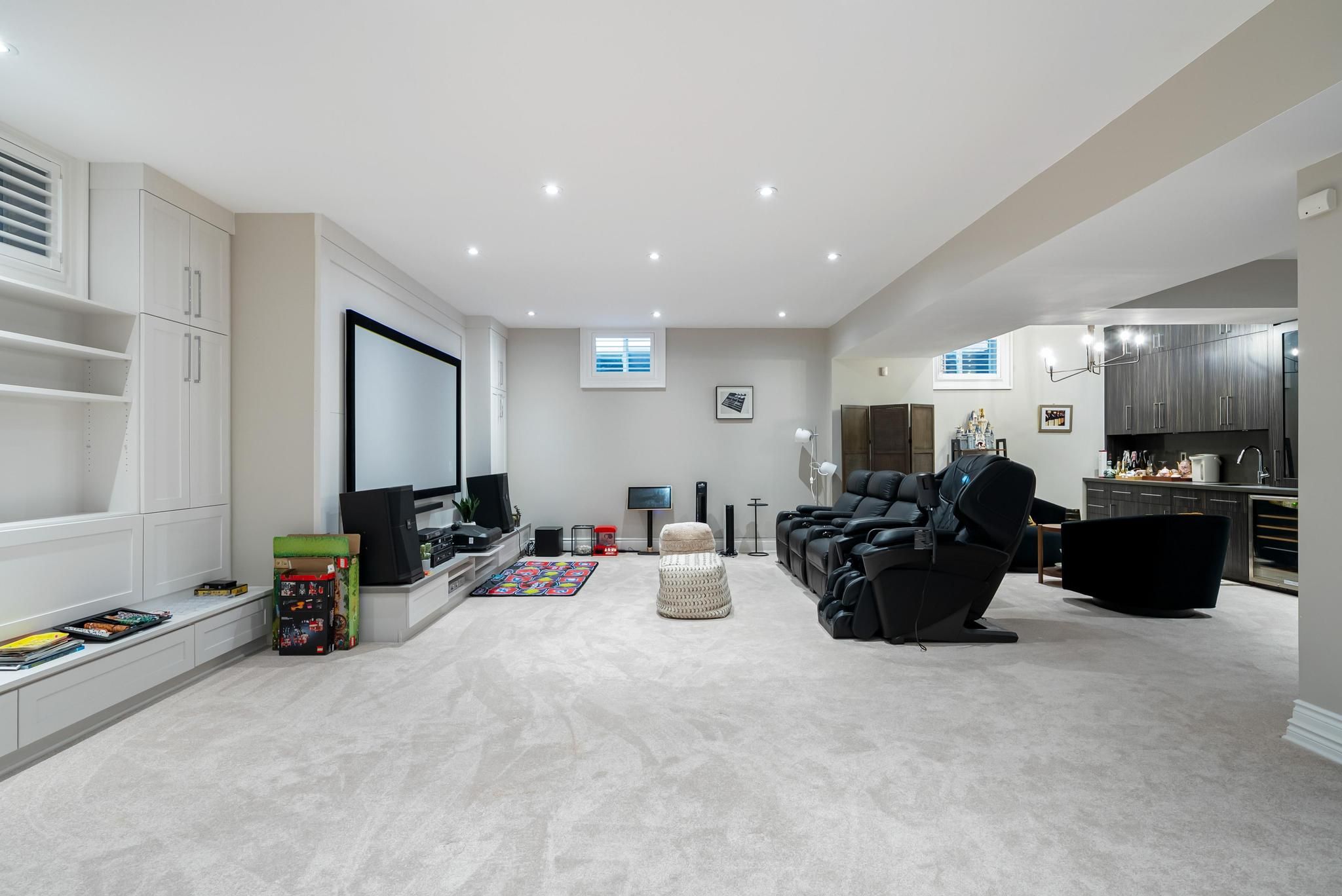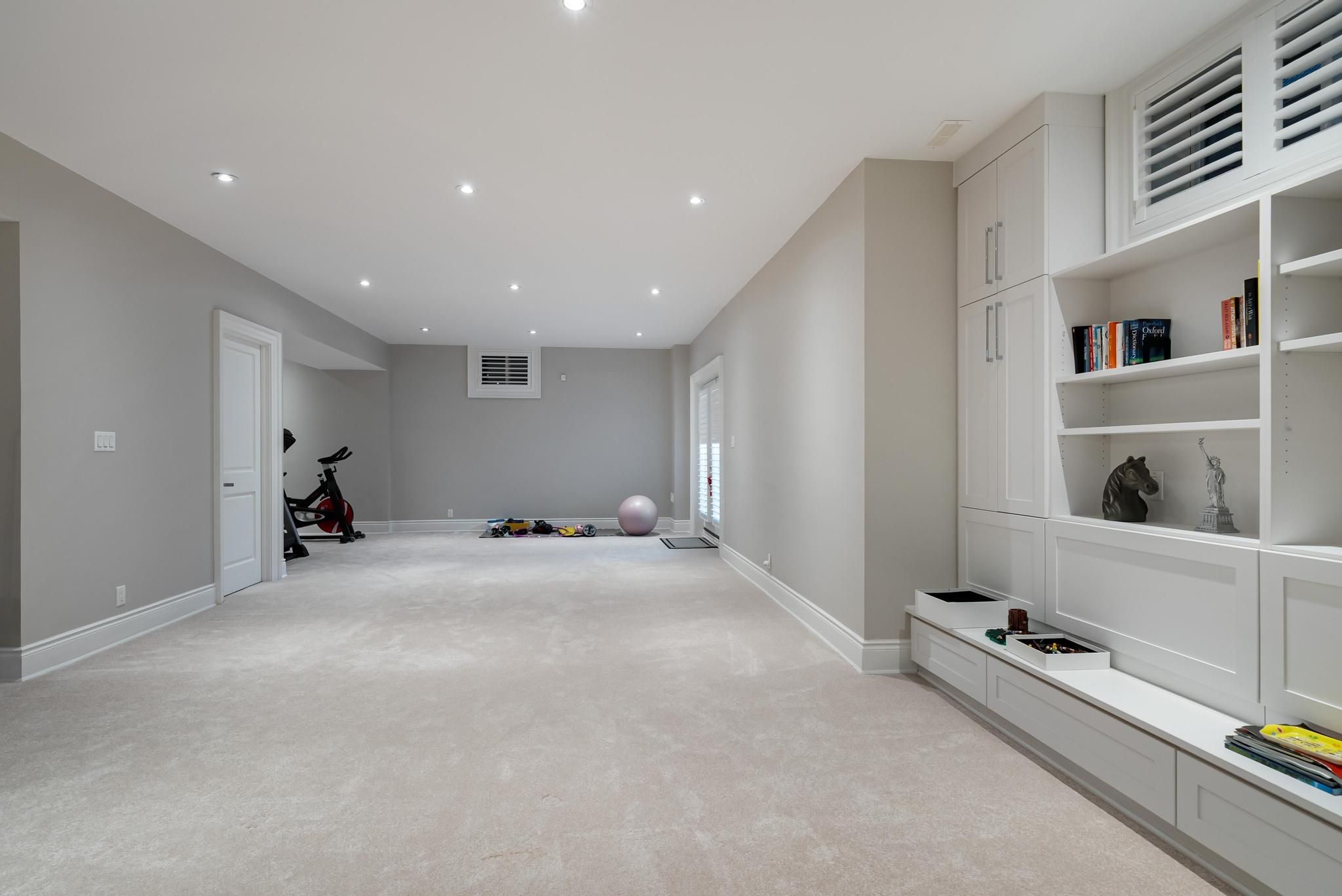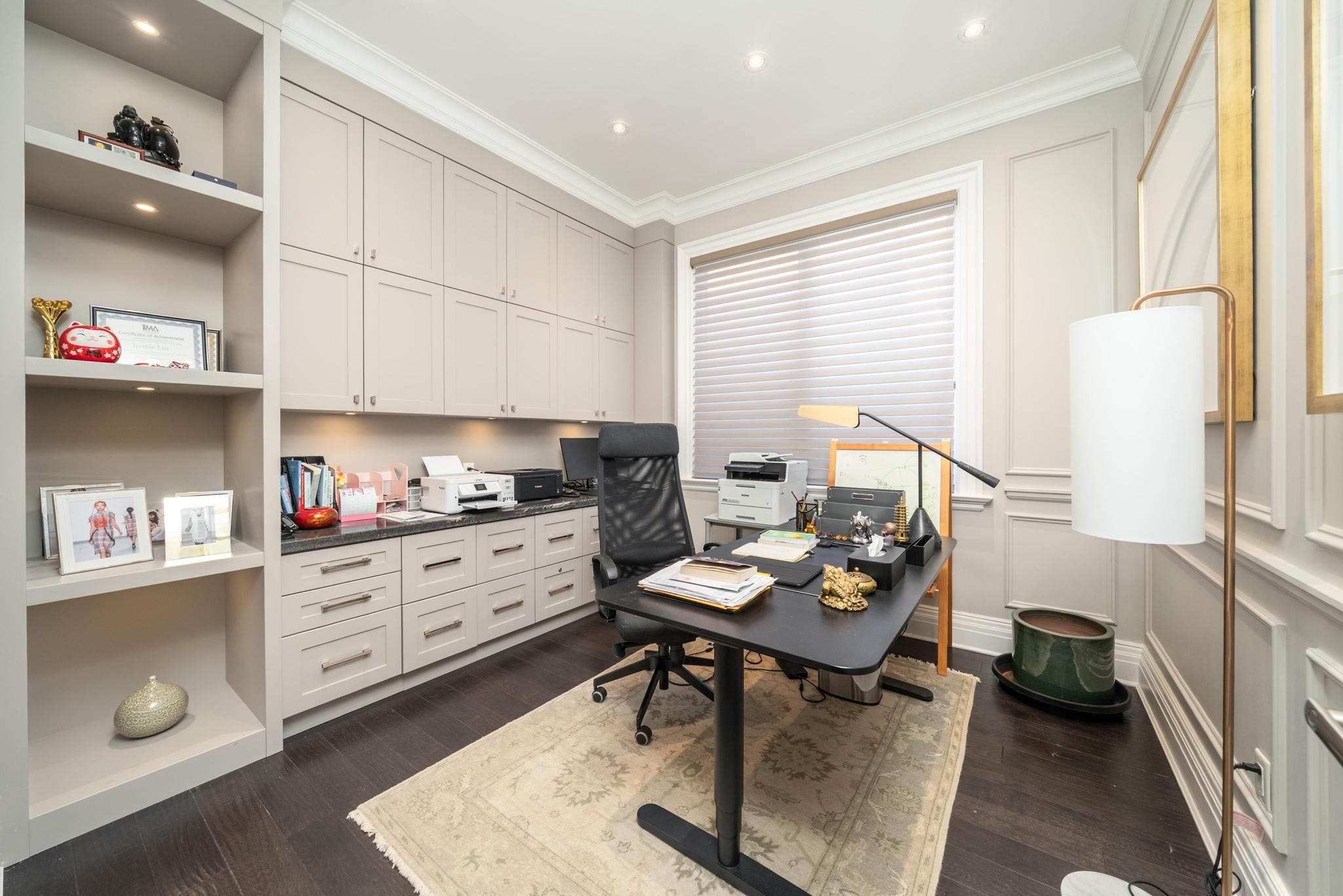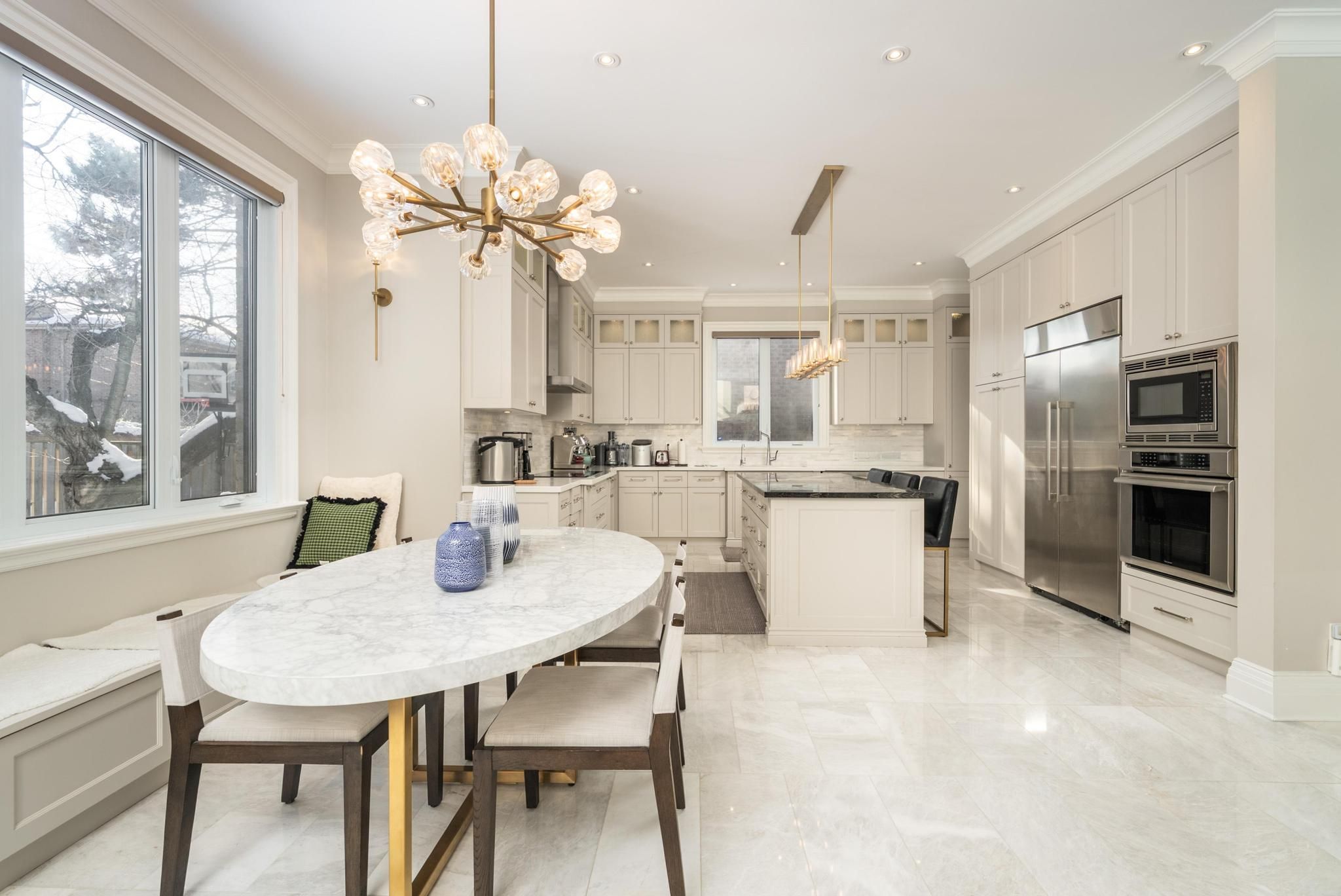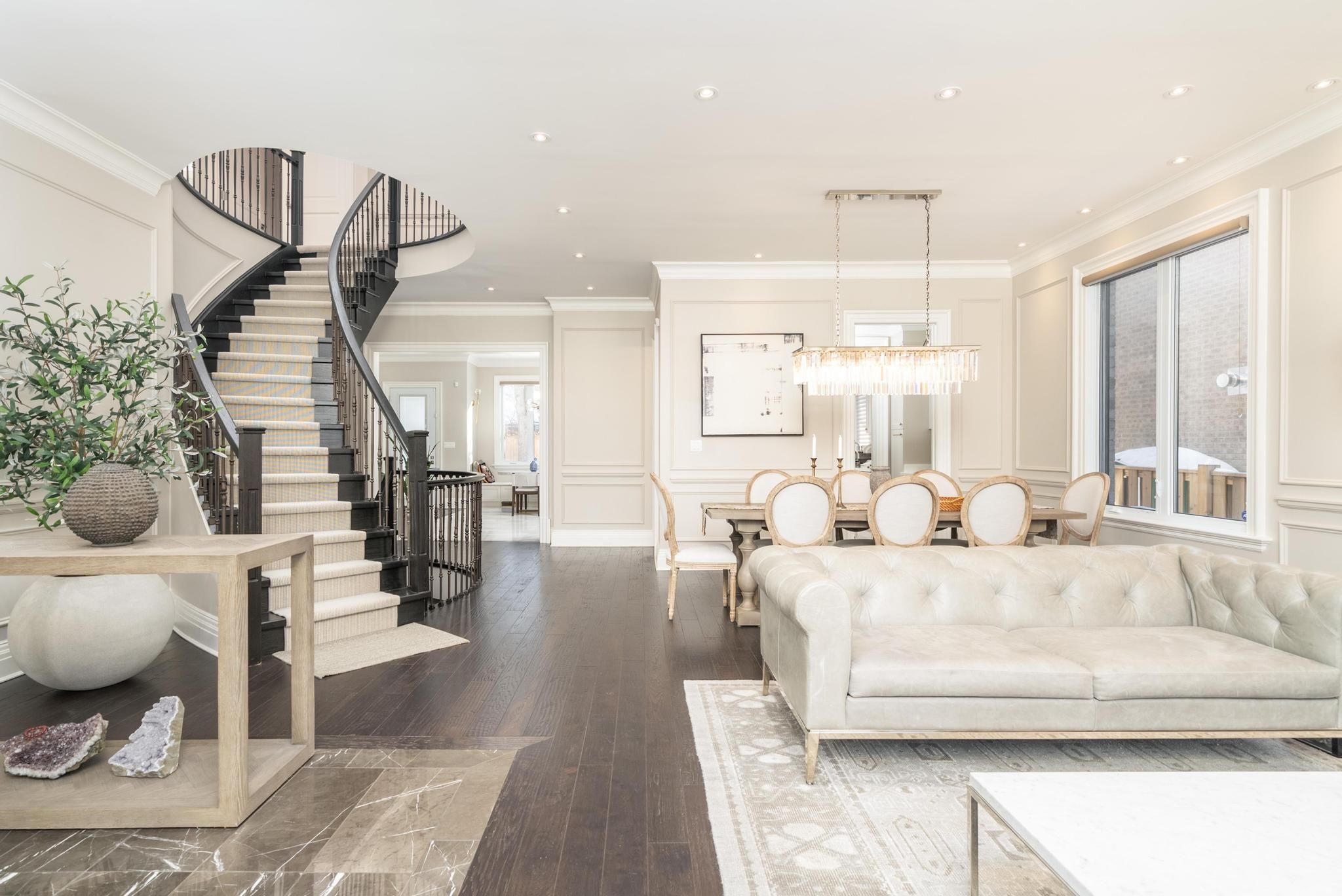 Exceptional custom-built 4+1 bedroom, 6-bath residence on a quiet, tree-lined street in prestigious york mills. Soaring 10' ceilings on the main floor and 9' ceilings on the second and lower levels create a bright, open feel, highlighted by dramatic two-storey (20') full-height glass windows overlooking a private backyard with automated shades. The grand family room features a two-storey bookmatched slab fireplace, coffered ceiling, and skylight, while the chef's kitchen boasts high-end appliances, oversized island, and custom cabinetry. Elegant marble and natural stone finishes, refined mouldings, and built-in millwork elevate every space. The primary suite offers a spa-inspired ensuite and generous walk-in closets. Beautiful professionally landscaped grounds complete the home's private oasis. Located within the highly sought-after denlow school district and close to top private schools including crescent school, the toronto french school, and havergal college, this home combines luxury, style, and exceptional location.
