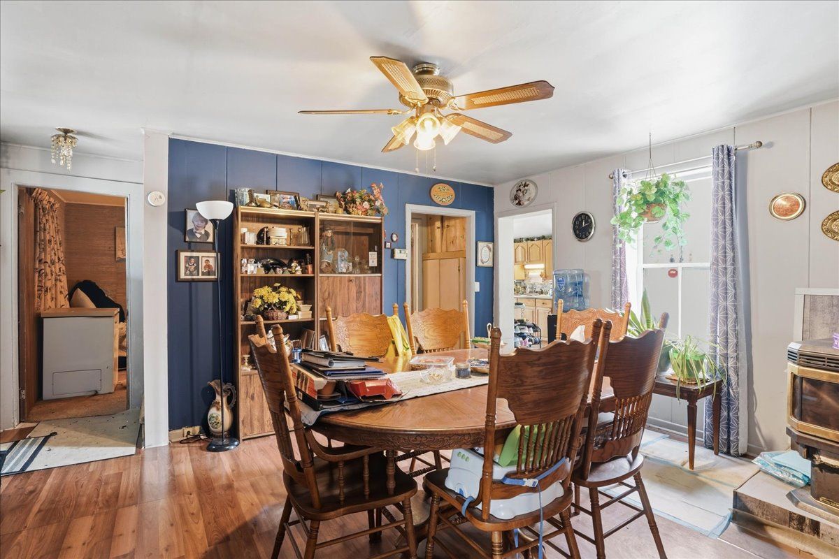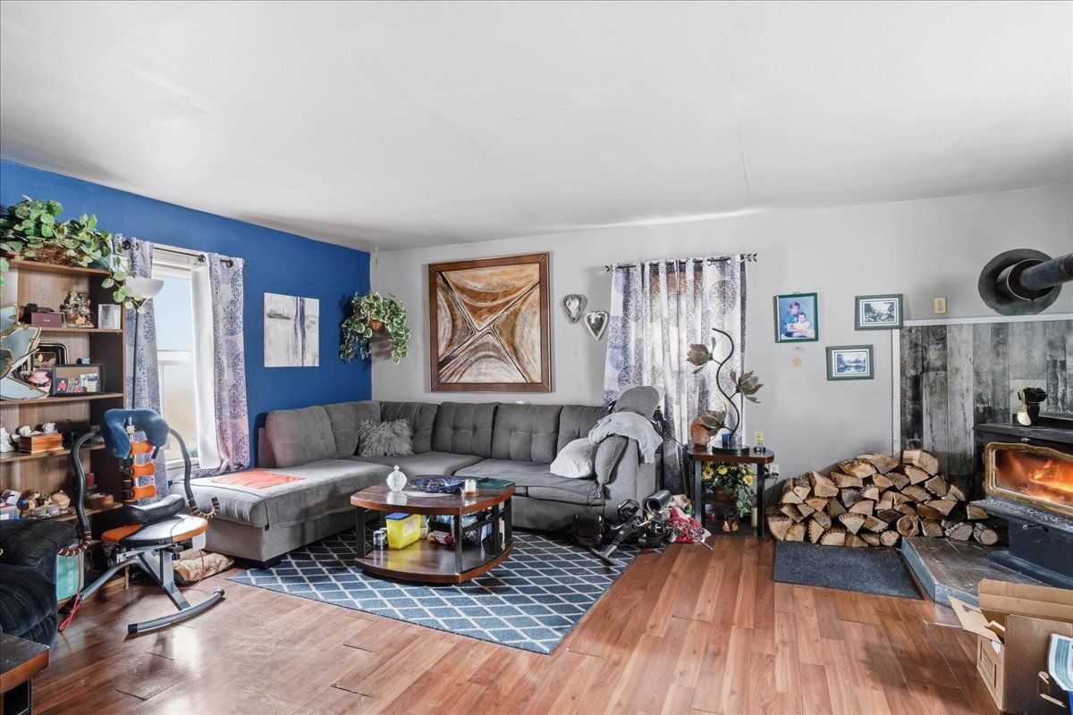 • Cozy living room with wood stove and dining area with pellet stove.