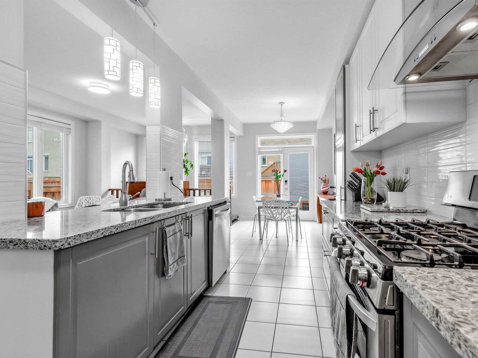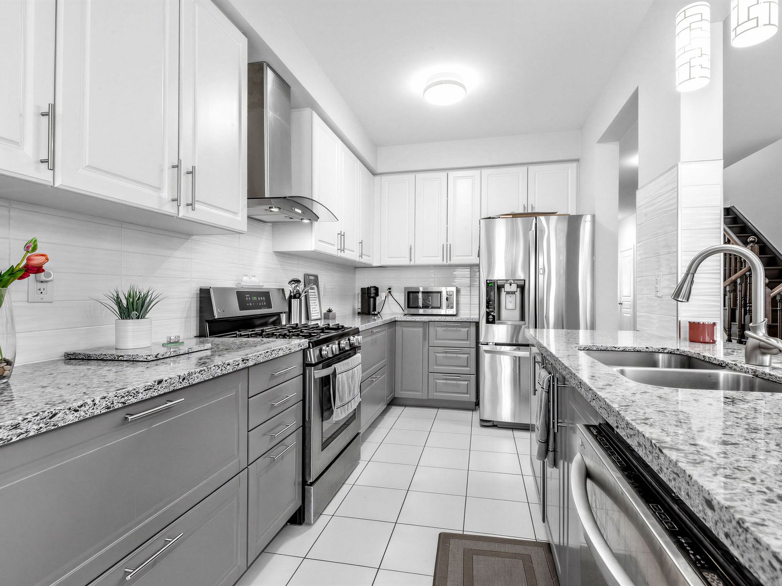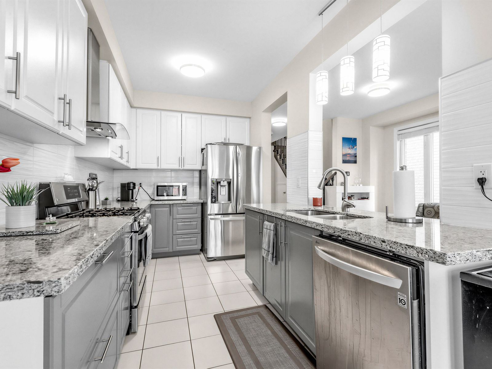• Modern open concept kitchen with upgraded quartz counters and full-size appliances.
