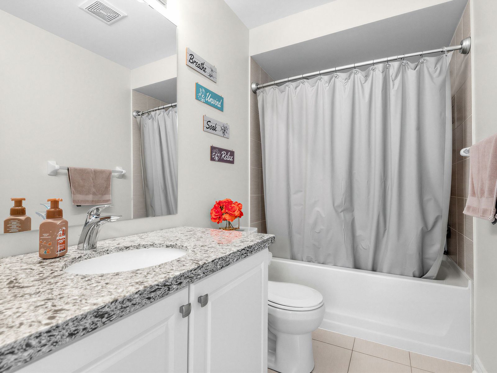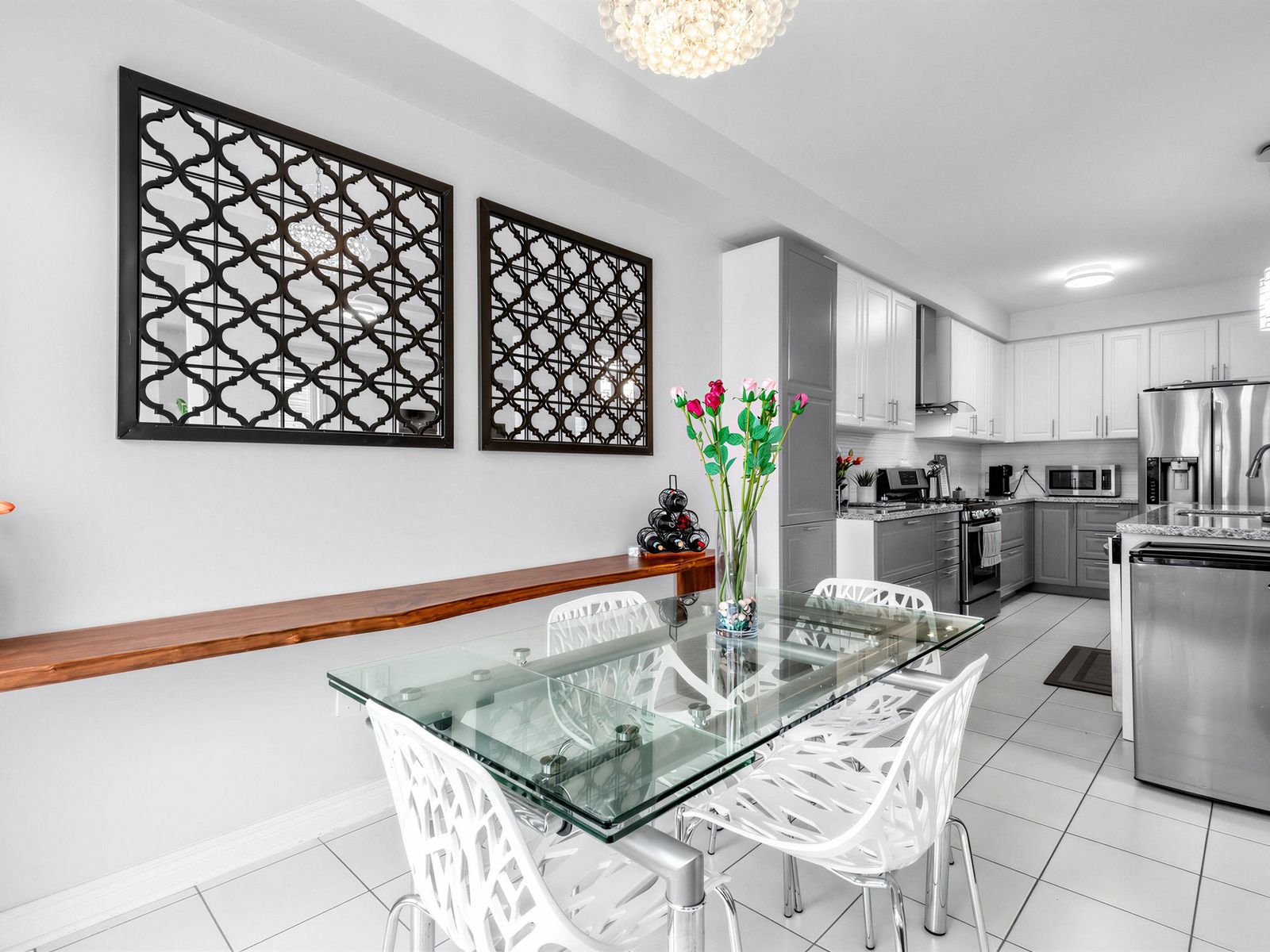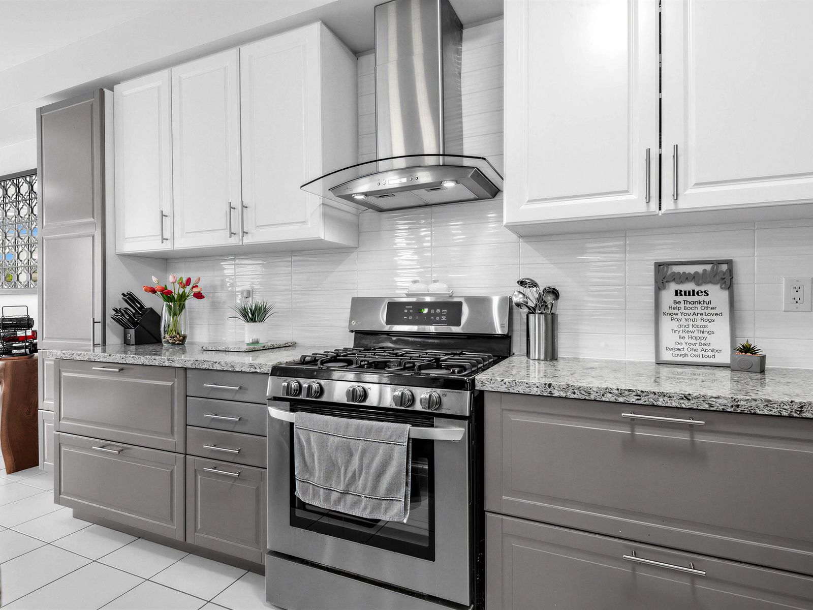 • Modern open concept kitchen with upgraded quartz counters and full-size appliances.
