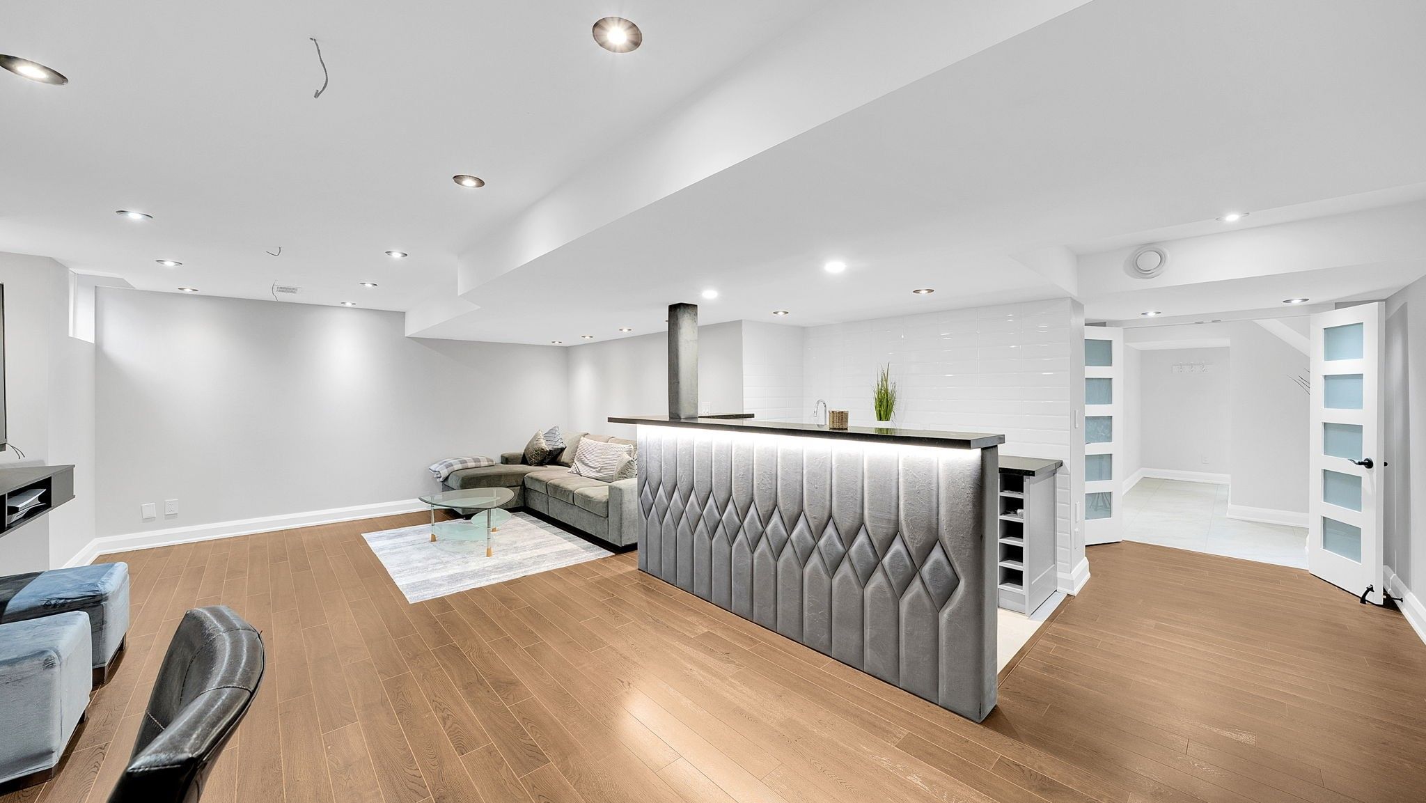 • Finished basement offers a stylish bar and dedicated exercise zone.