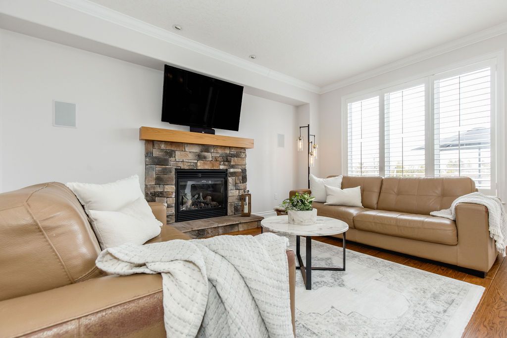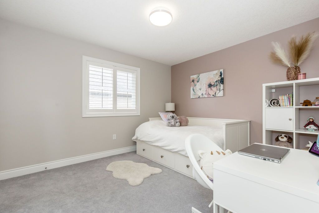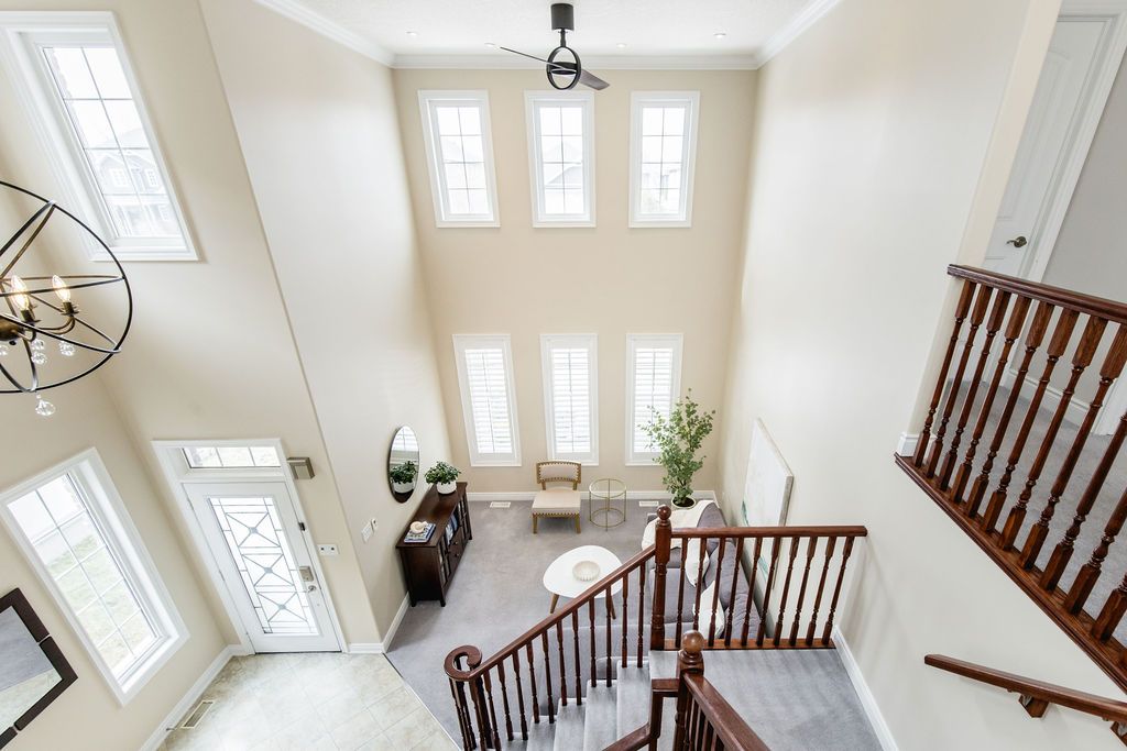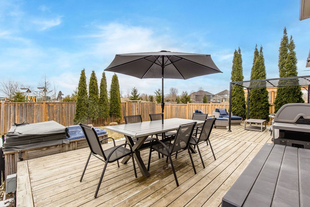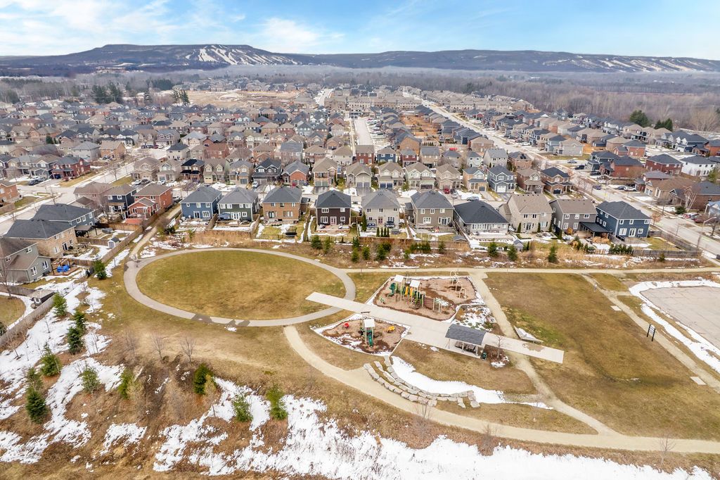 This exceptional 4,000 sq/ft family home offers grandeur, comfort and an unbeatable location perfect for families seeking space and lifestyle. Situated on a 50 ft lot, this all-brick home backs directly onto a beautiful four season park, providing privacy and the ultimate backyard for kids to play and explore. The pretty curb appeal sets the tone, while the elegant formal entrance welcomes you with a grand staircase and a dramatic two-storey living room featuring floor-to-ceiling windows that flood the space with natural light. The dining room is perfect for hosting family gatherings and special occasions. The kitchen offers timeless white cabinetry, double pantry and built-in appliances and flows into the family room complete with custom stone fireplace and built-in speaker system. Step outside to a generous 31' x 14' deck overlooking the tree-lined backyard with hot tub and direct gated access to the park, ideal for entertaining while keeping an eye on the kids at the playground. Upstairs, the primary suite is a serene retreat featuring an ensuite with large soaker tub and walk-in closet. A versatile adjoining bedroom can function as a nursery, home office or playroom. The additional bedrooms are spacious and share a full bath making this layout ideal for families. The laundry room doubles as a mudroom with convenient garage and side entrance access. The double car garage offers excellent storage, a work area and parking for two vehicles. The finished basement provides more living space with a home office, cozy rec room with gas fireplace, a full bathroom and an abundance of storage. Additional highlights include california shutters, central vac and an abundance of pot lights. Enjoy beautiful escarpment views from the front of the home along with stunning sunsets. Located on family-friendly dance street where children play and neighbours connect, this is a rare opportunity to own a truly grand home in an exceptional setting designed for everyday living.