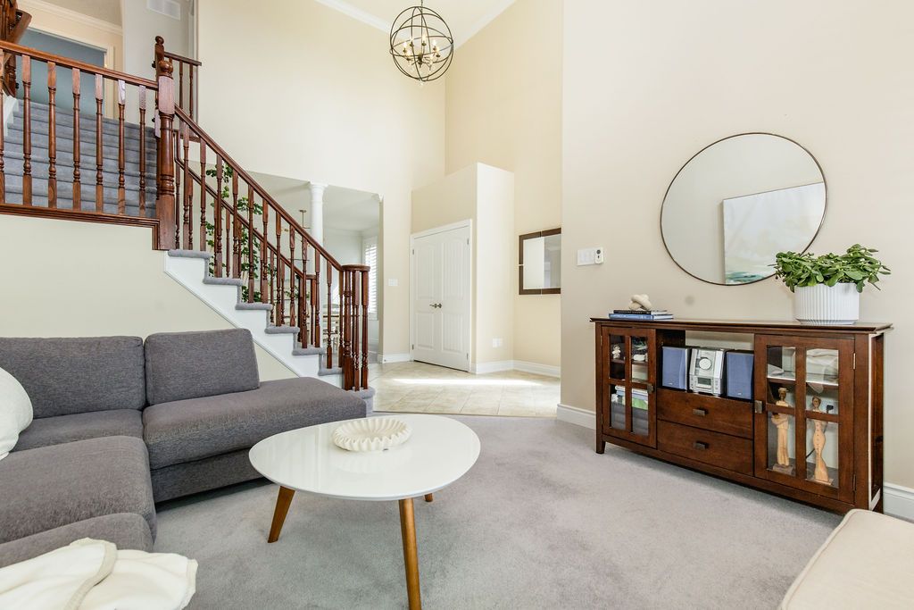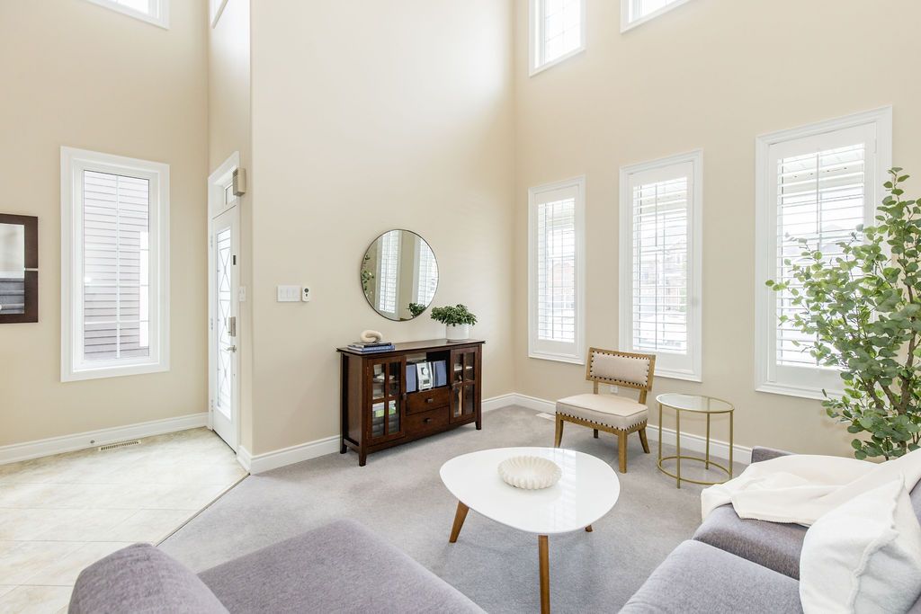 • Elegant entrance with grand staircase and floor-to-ceiling windows.