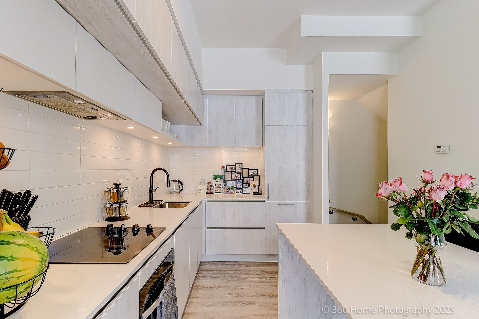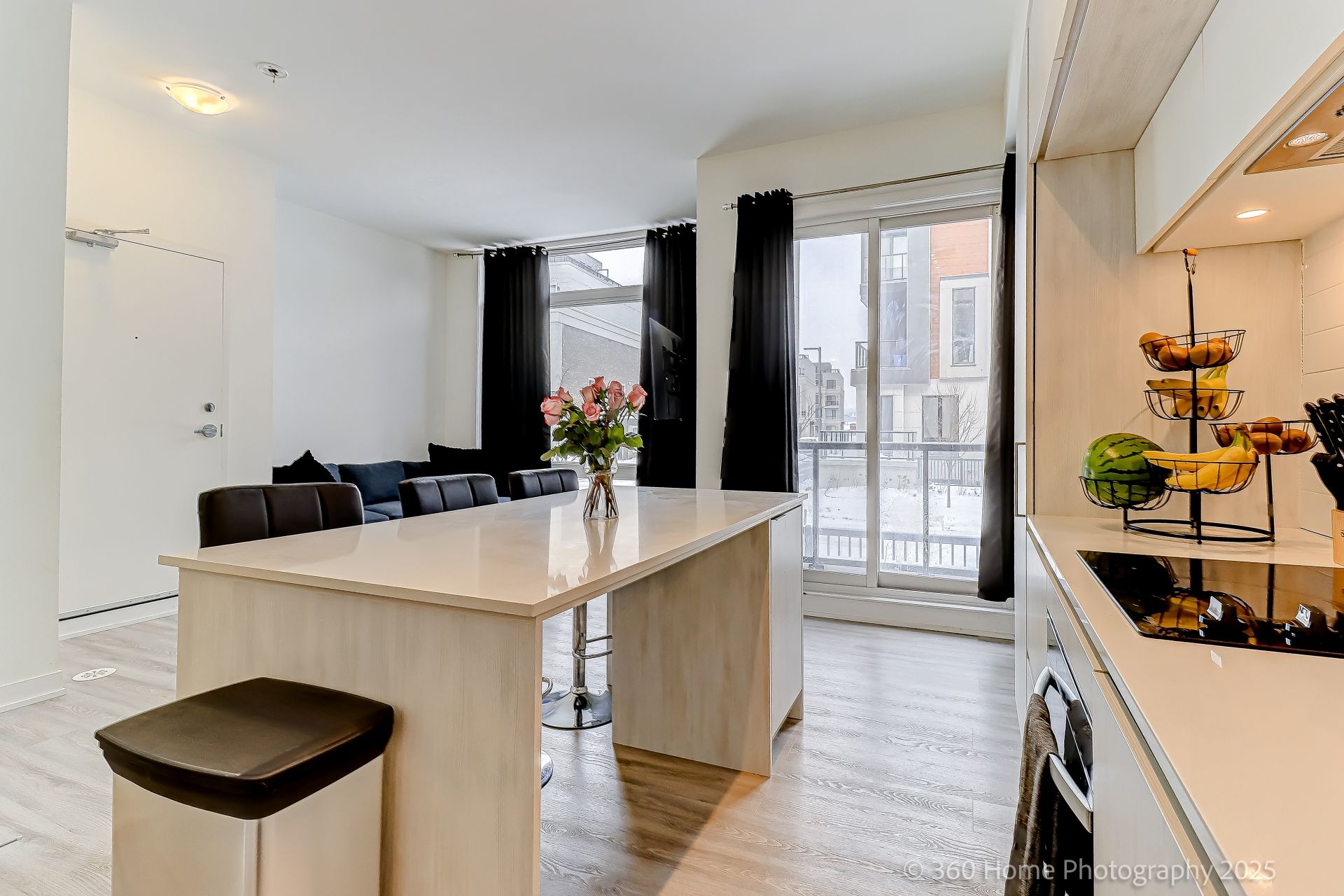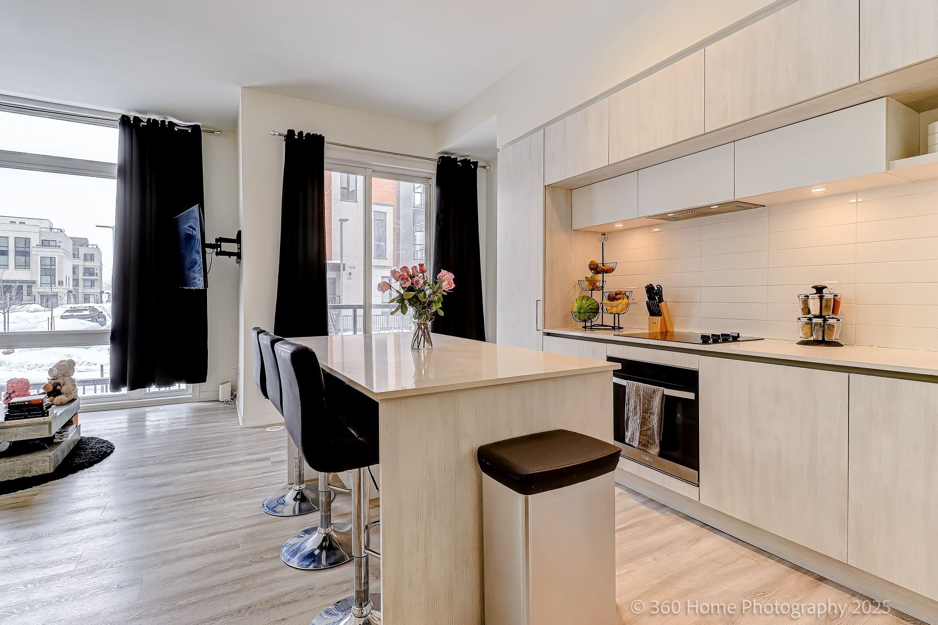 • Modern kitchen flows into living and dining areas, great for entertaining.