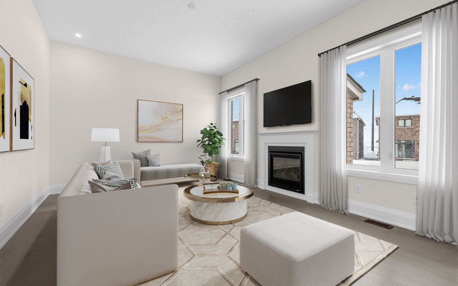 • Bright family room with oversized windows and 10-foot ceilings.