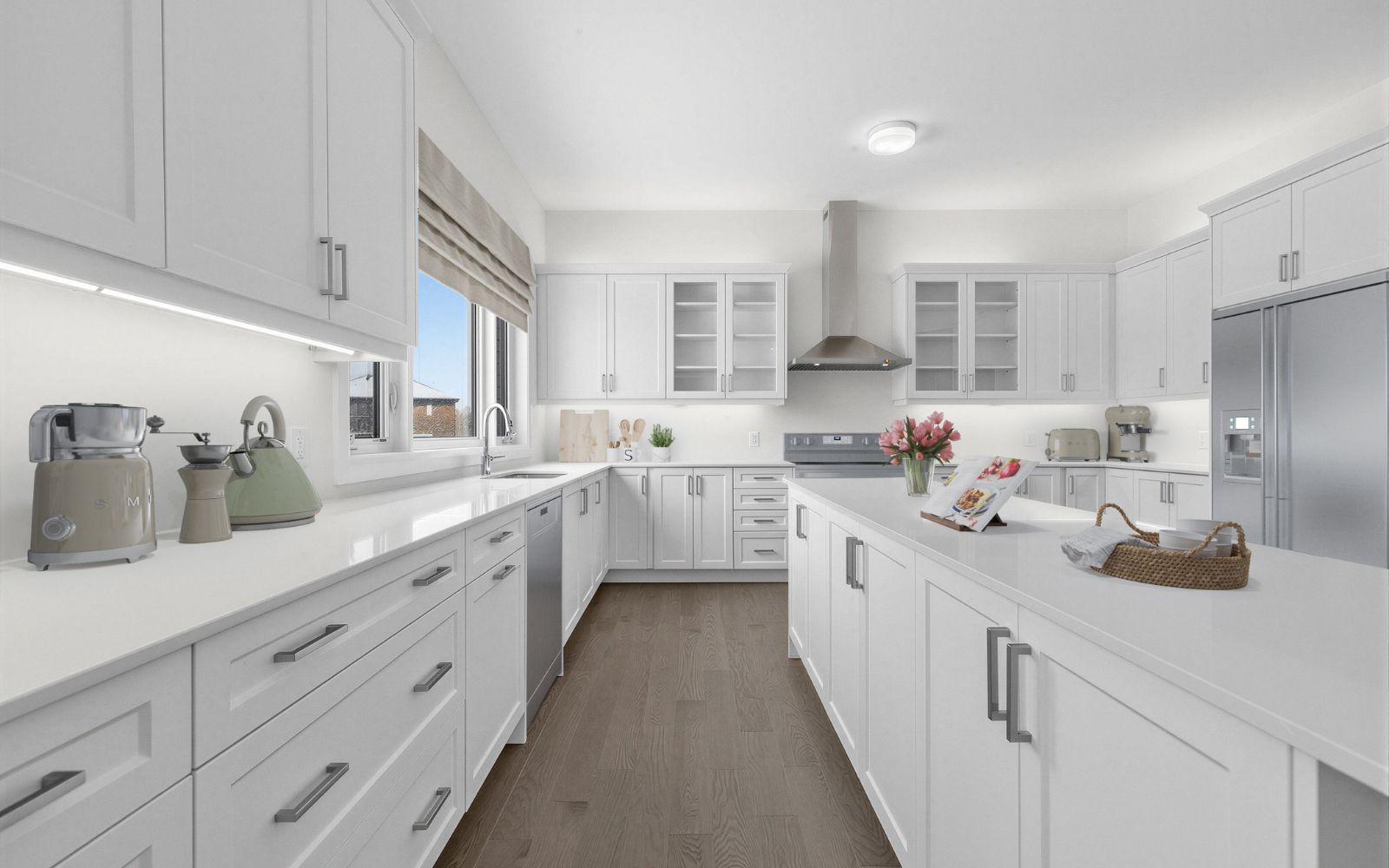 • Chef-inspired kitchen with quartz countertops and ample space for appliances.