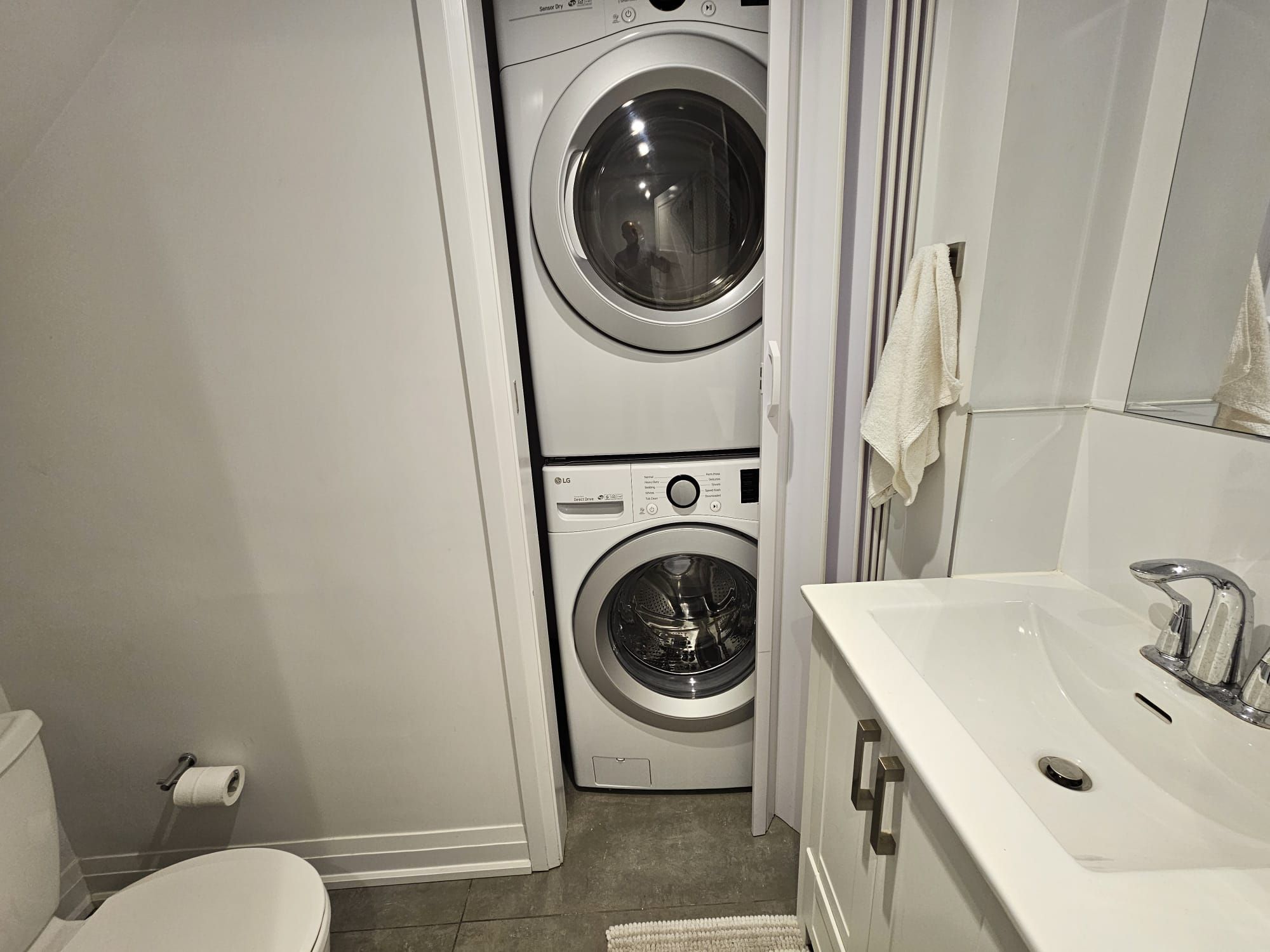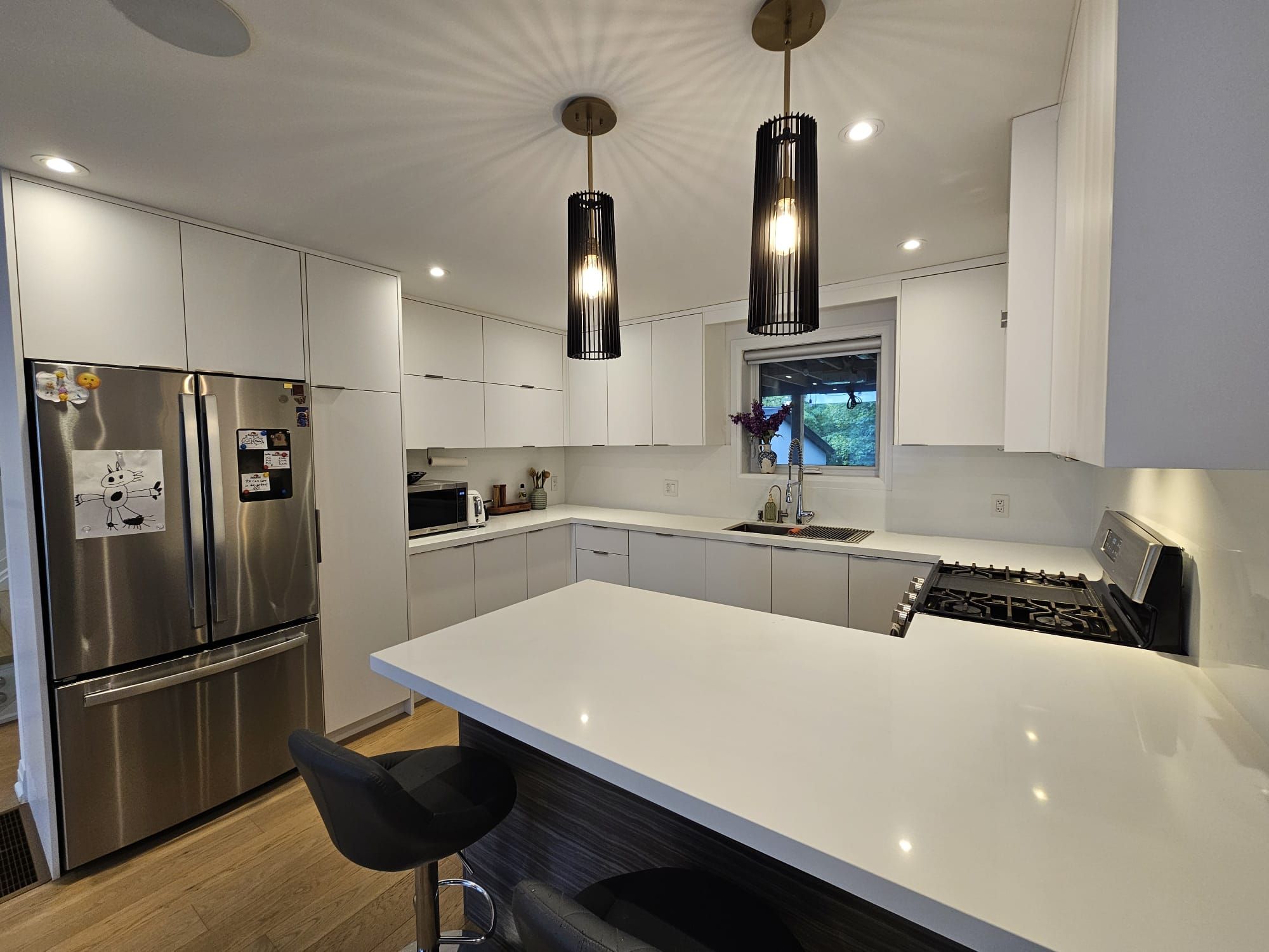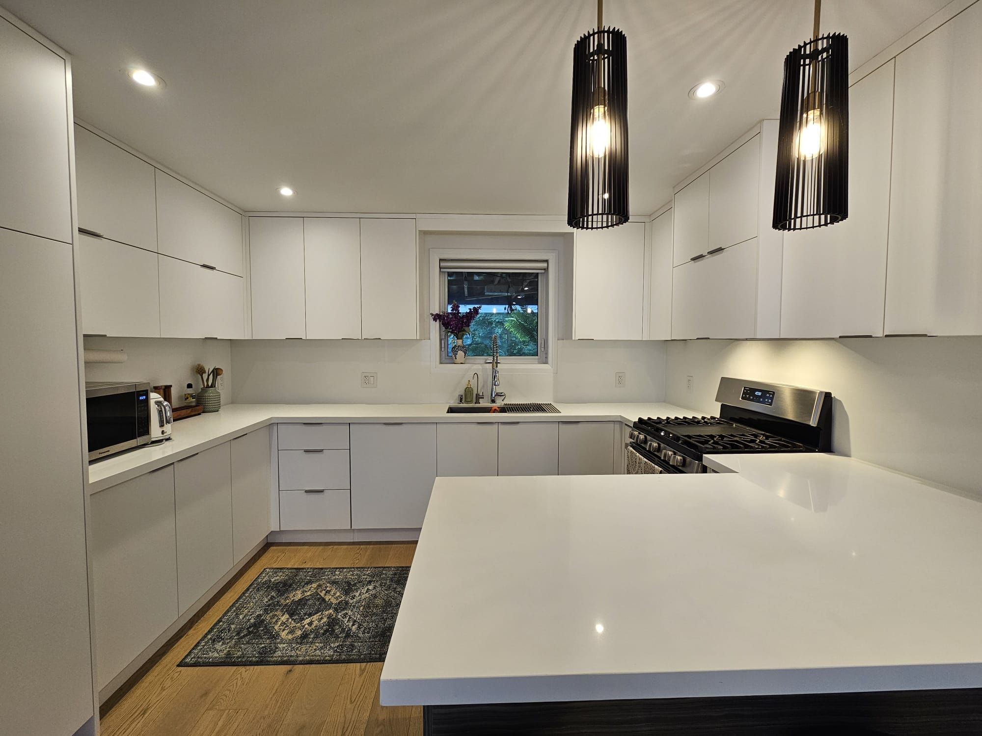 • Large kitchen with quartz countertops and stainless steel appliances.