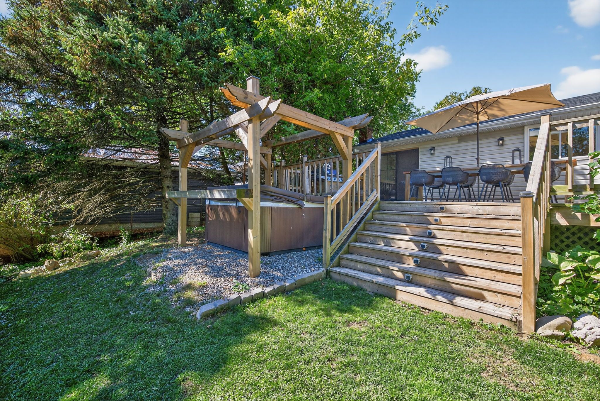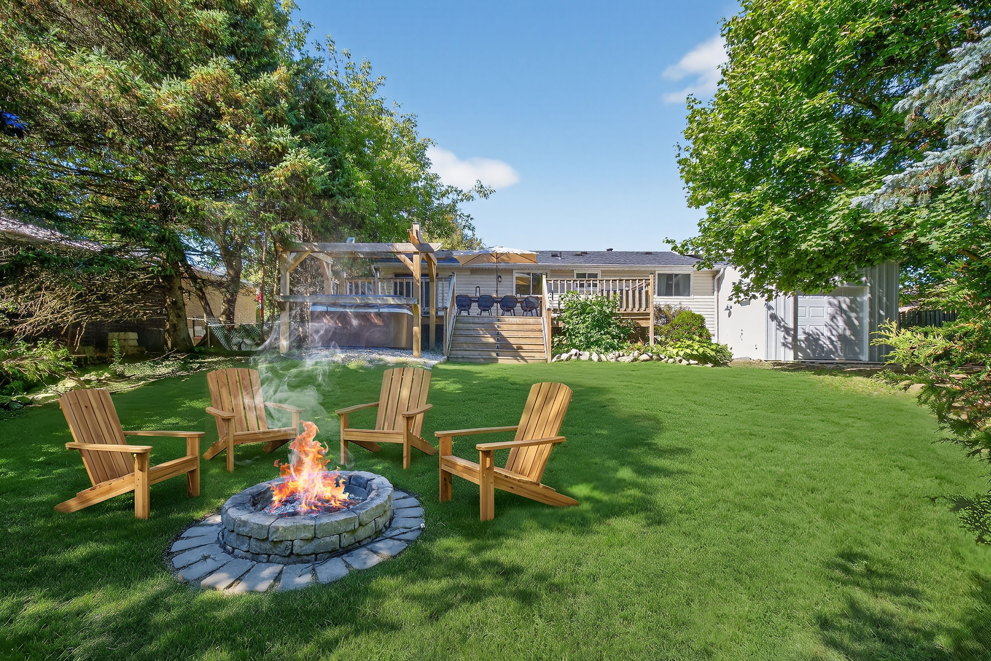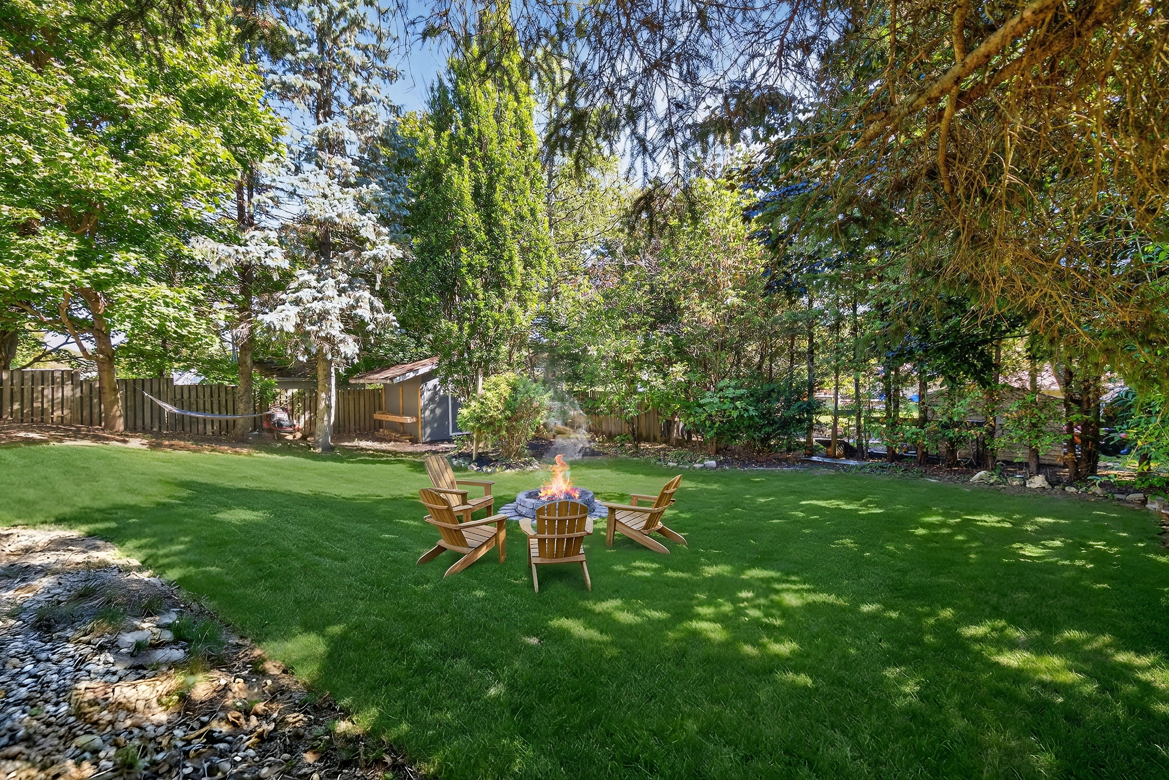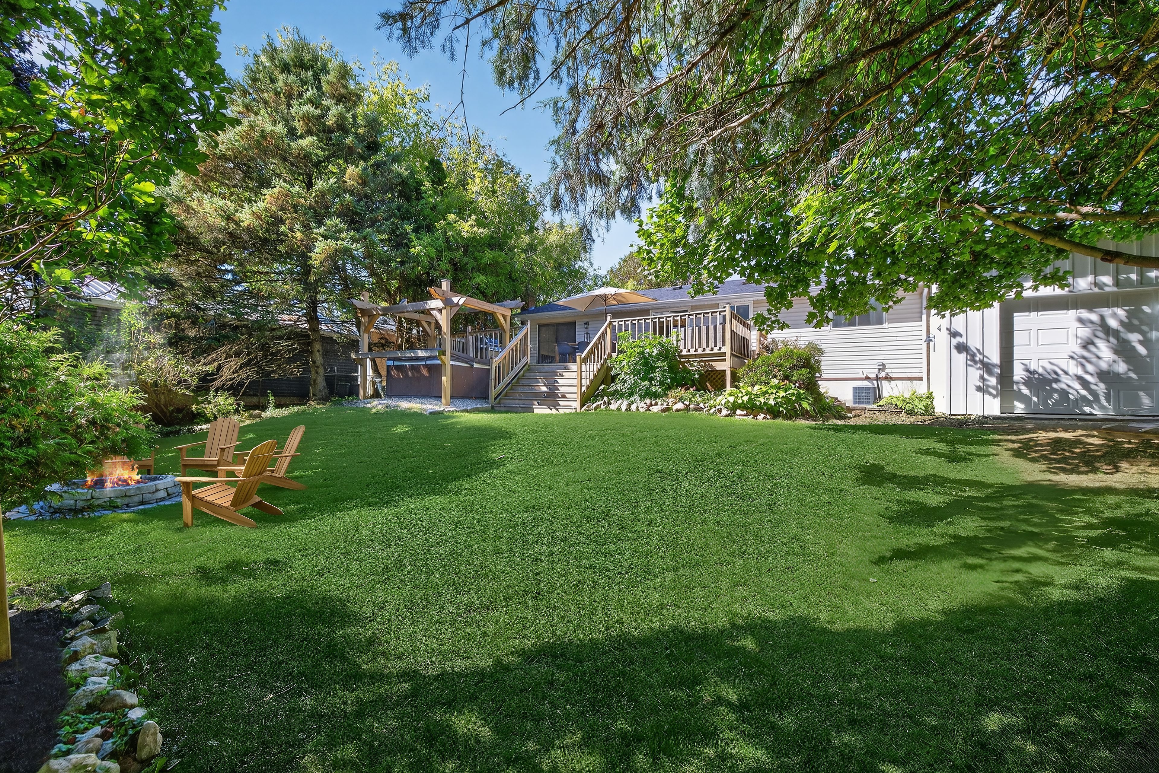 • Massive fenced backyard with a deck, hot tub, and fire pit.