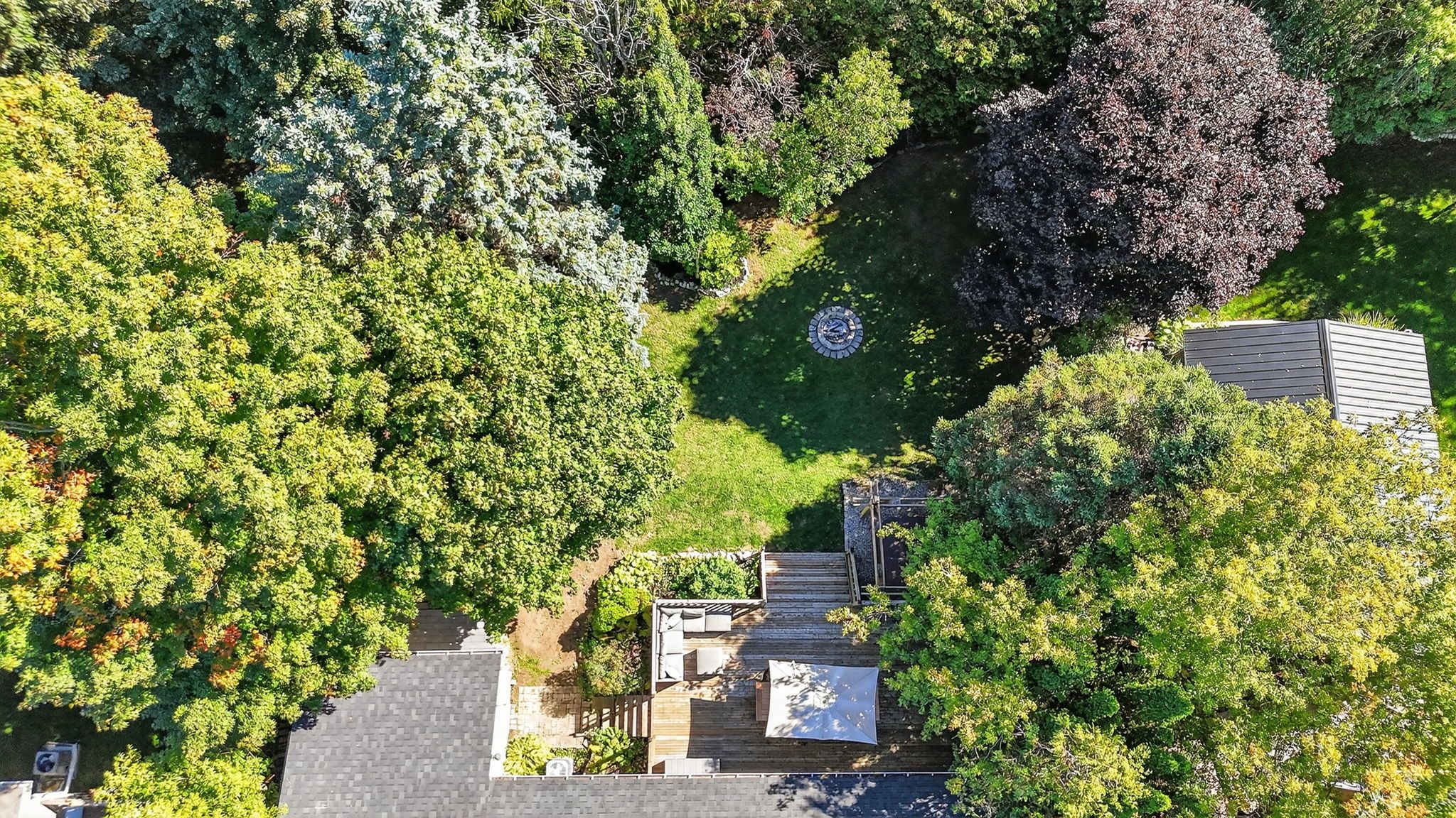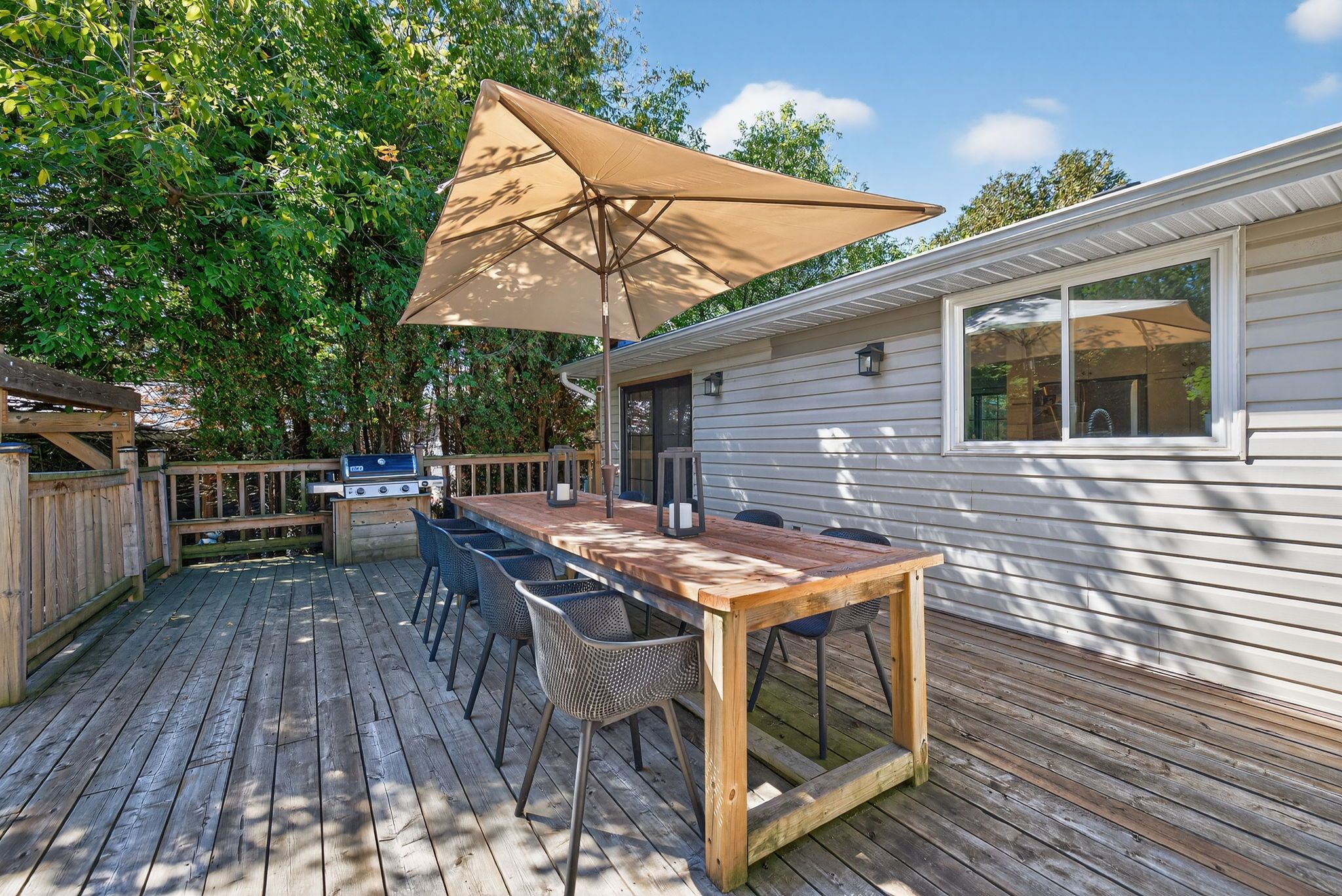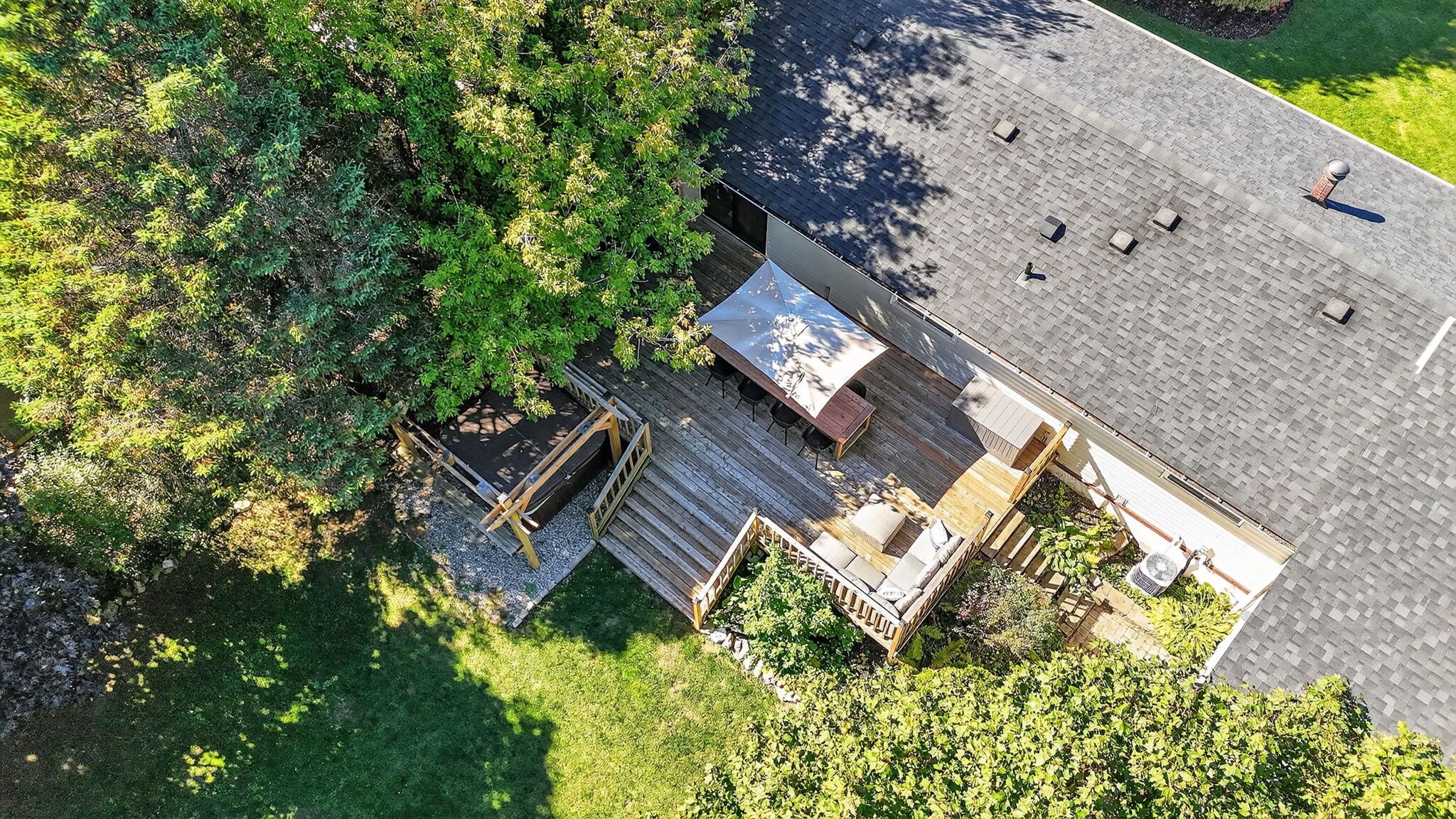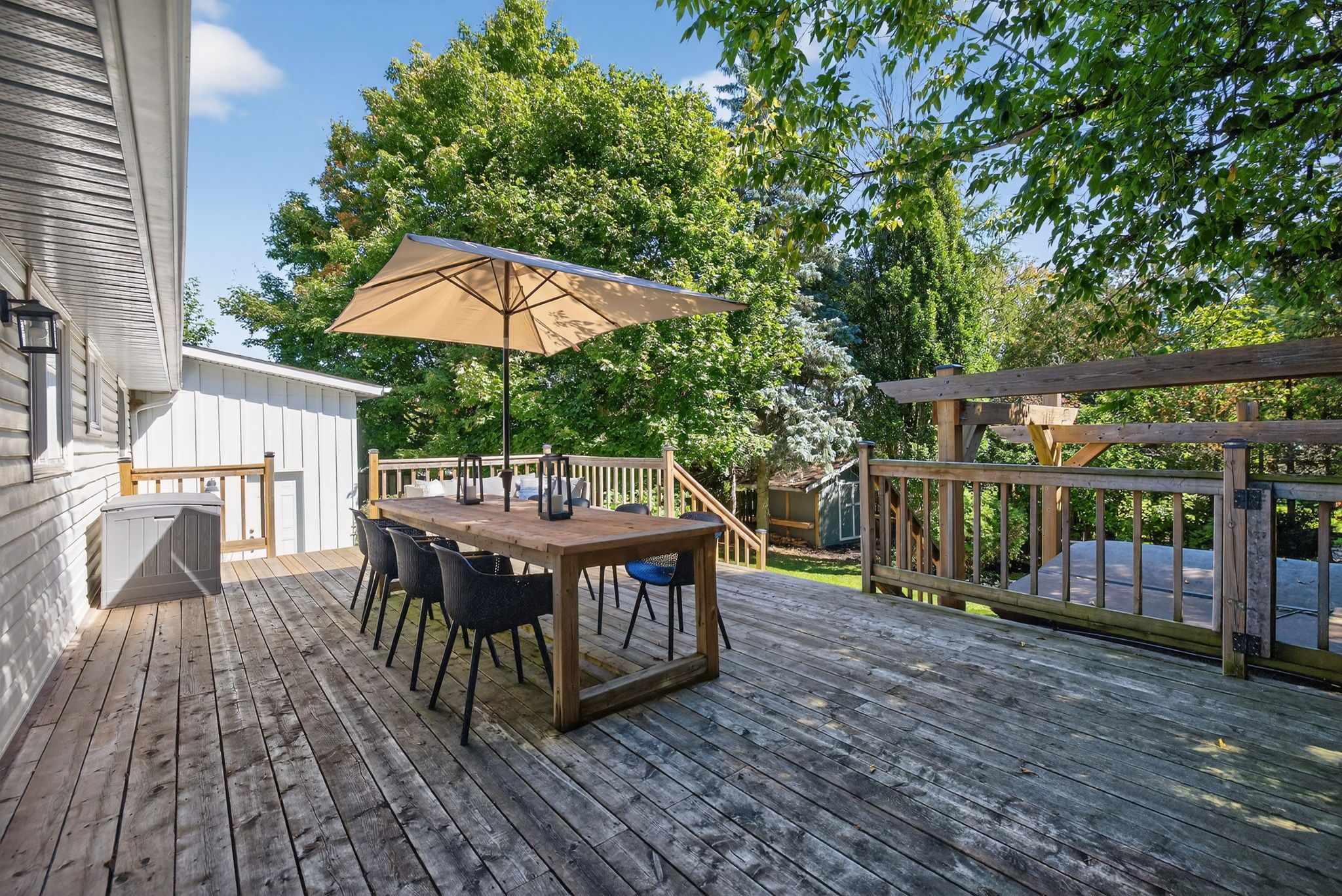 • Massive fenced backyard with a deck, hot tub, and fire pit.