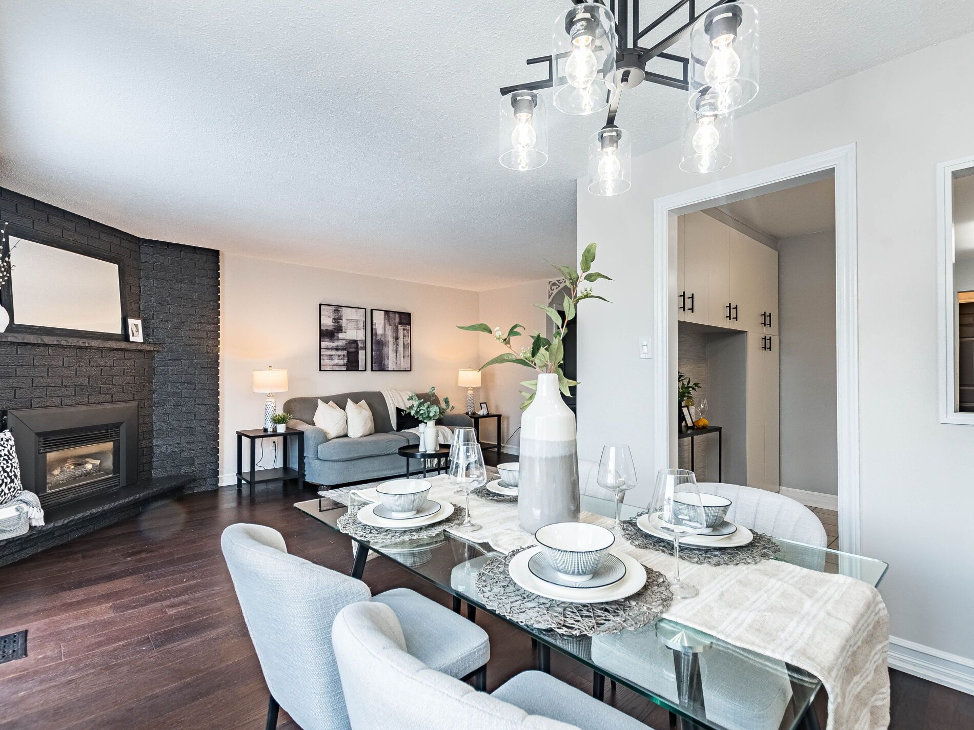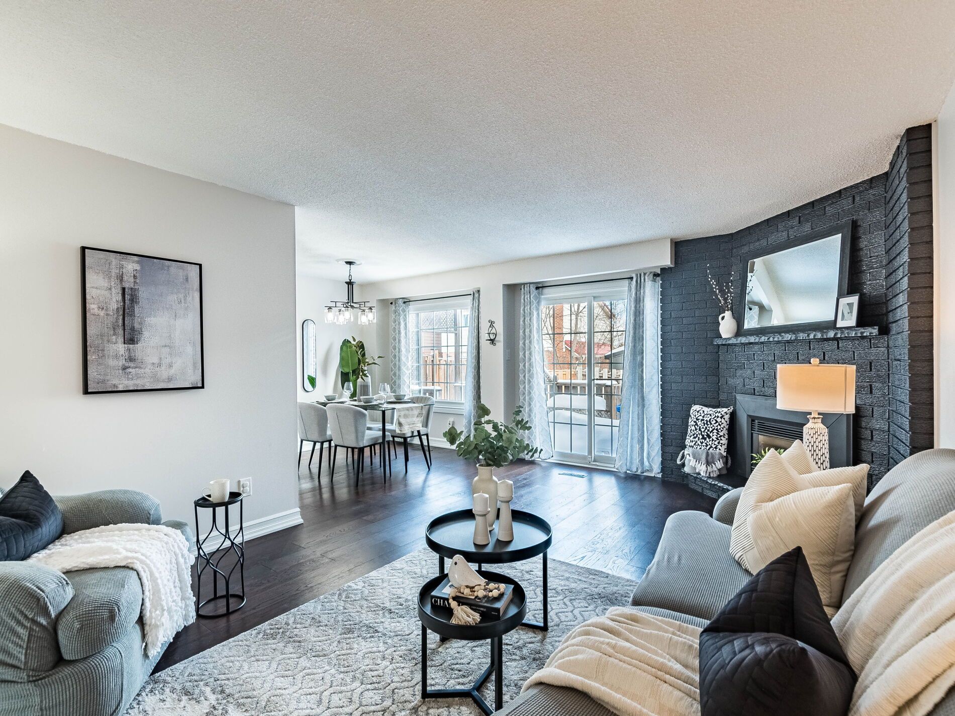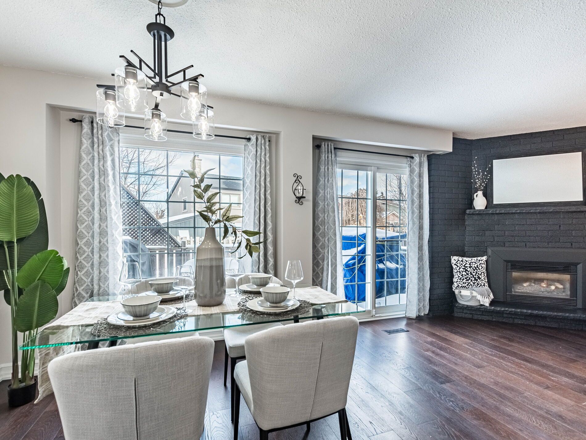 • Bright open-concept living and dining area with a cozy gas fireplace.