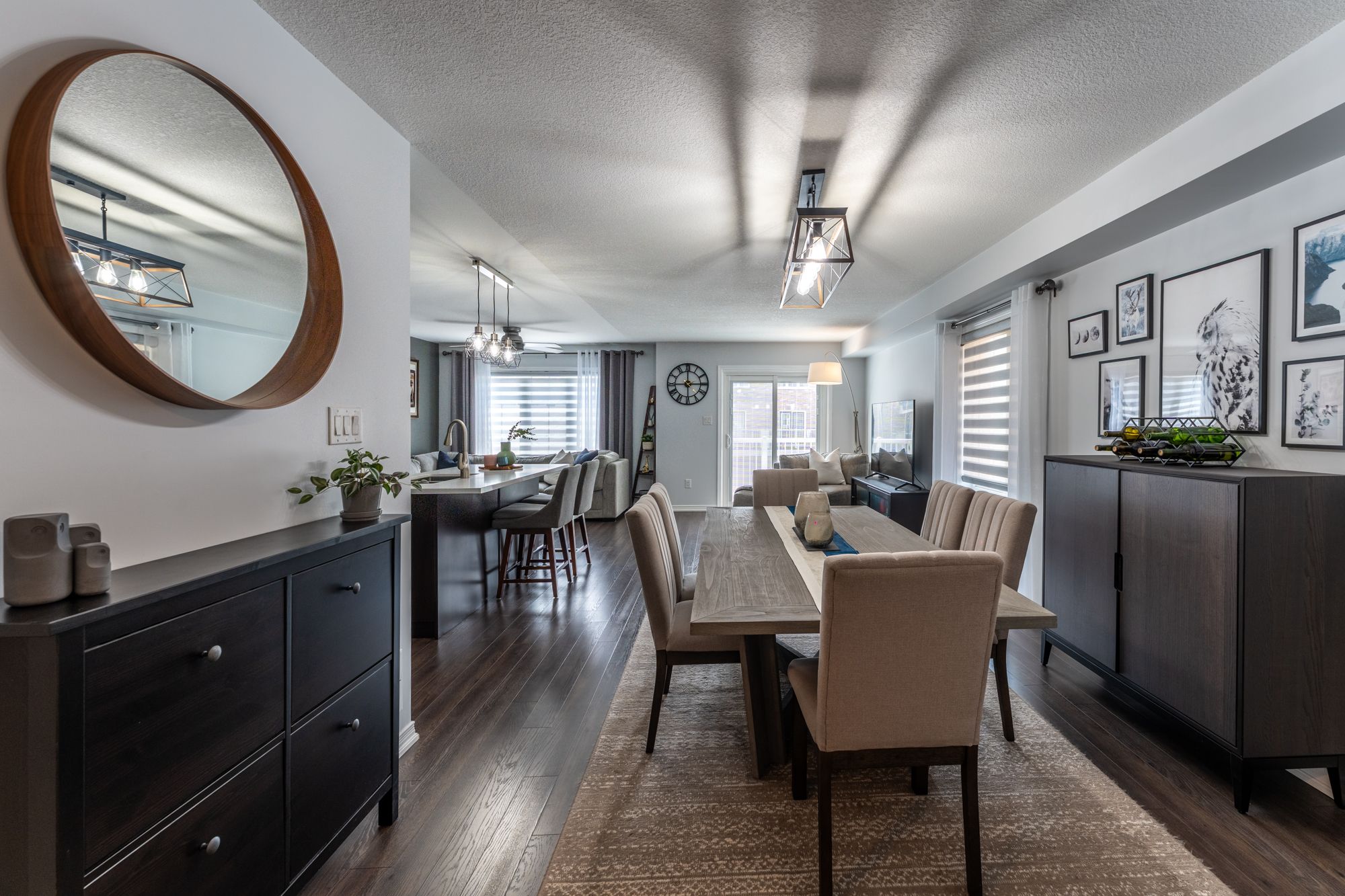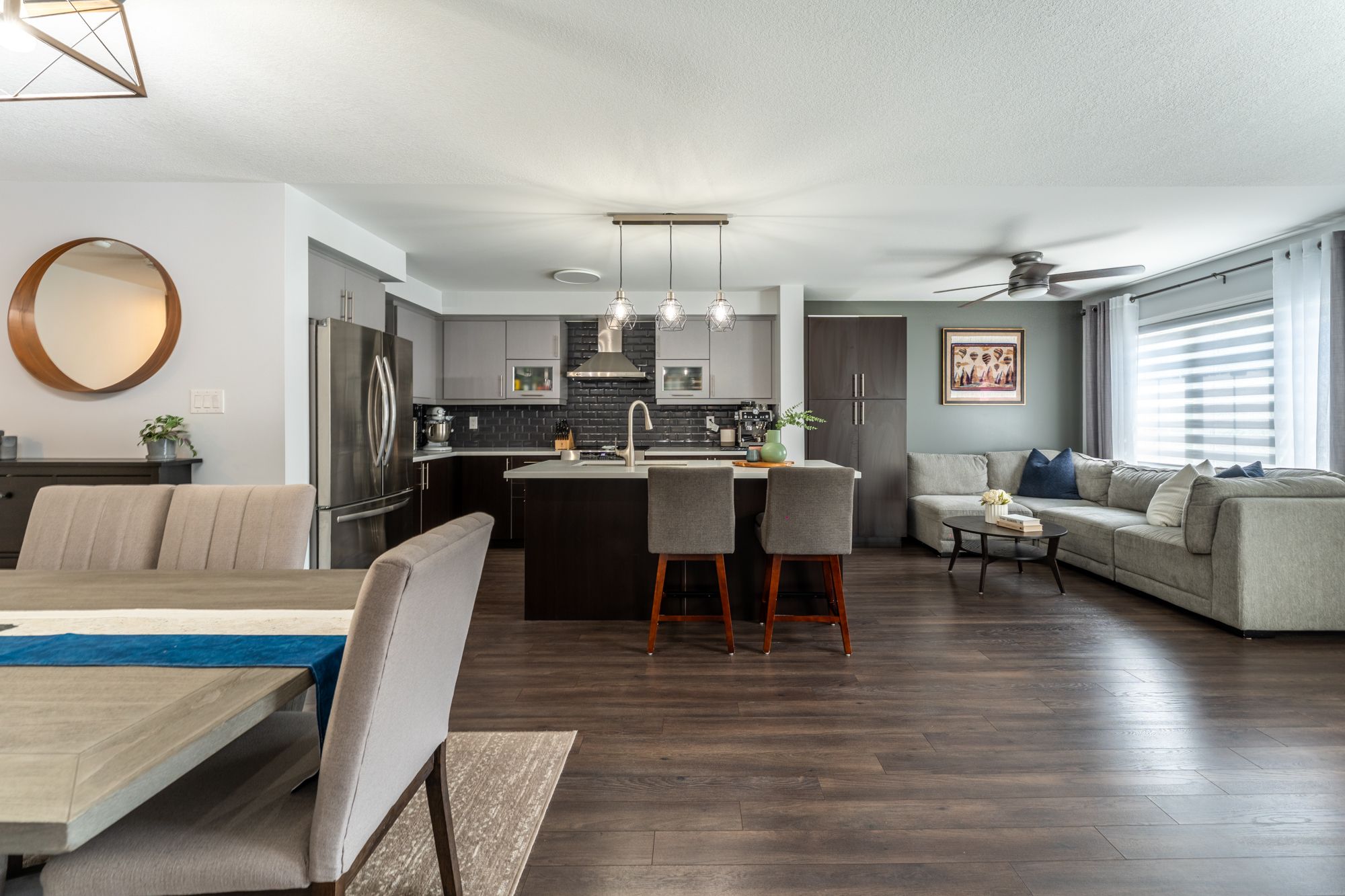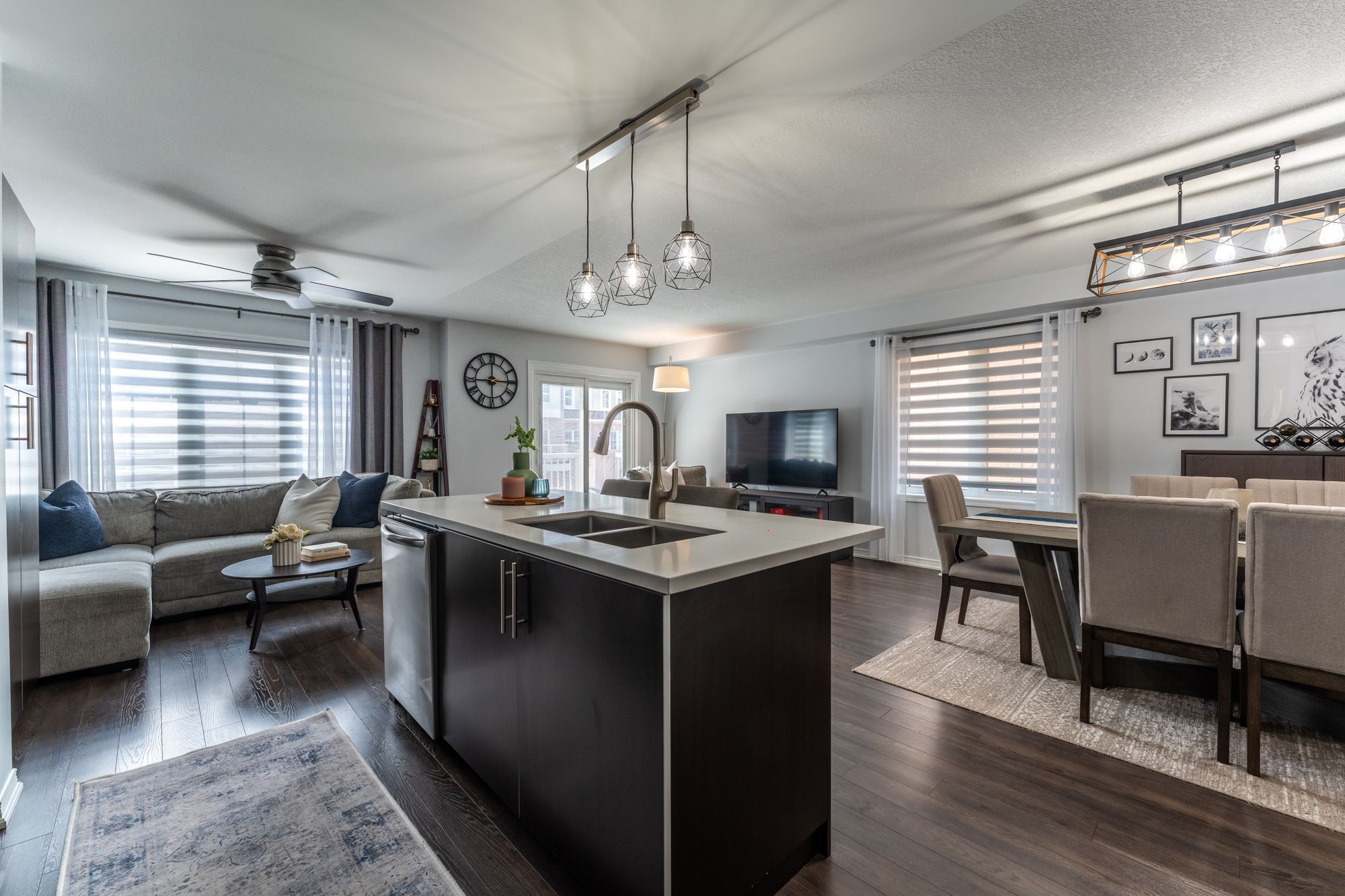 • Spacious open concept living, dining, and kitchen areas.