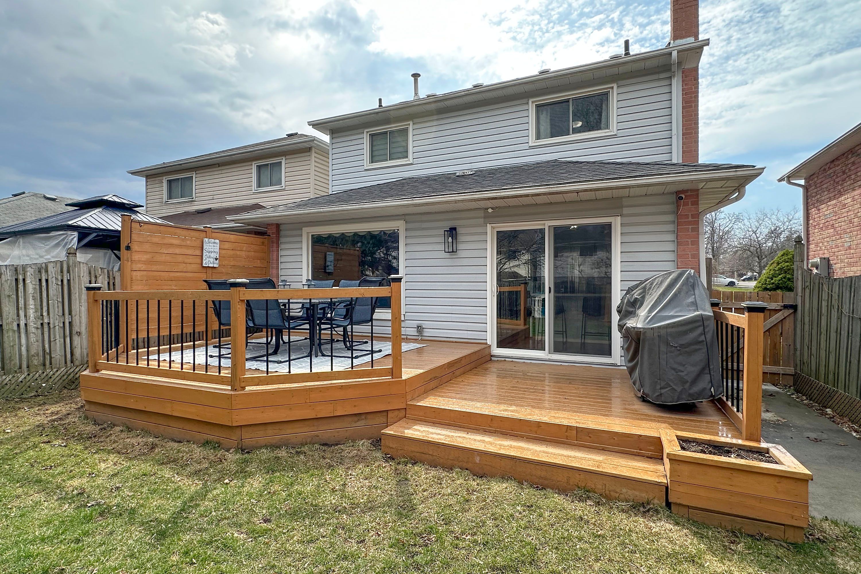 Welcome to this beautiful, move-in-ready, renovated home in a family-focused bowmanville neighbourhood walking distance to downtown bowmanville, schools, parks and amenities. This 3-bed, 3-bath property features many upgrades. An updated kitchen (2020) with new cabinets, quartz counters, and ceramic backsplash and newer ss appliances with laminate flooring throughout the main level. Livingroom/diningroom has been upgraded with crown moulding and pot lights. Bathrooms have been renovated with clean, modern finishes. Newer carpet on the stairs to upper and lower level. A finished basement with pot lights adds extra living space with a 2pc powder room. Newer sliding doors open to a deep fenced backyard with a new large deck (2023) and garden shed, perfect for easy outdoor living. With newer gas furnace,central air conditioner and roof, and brand new garage door opener, there is nothing to do but move in! It's a gem not to be missed!
