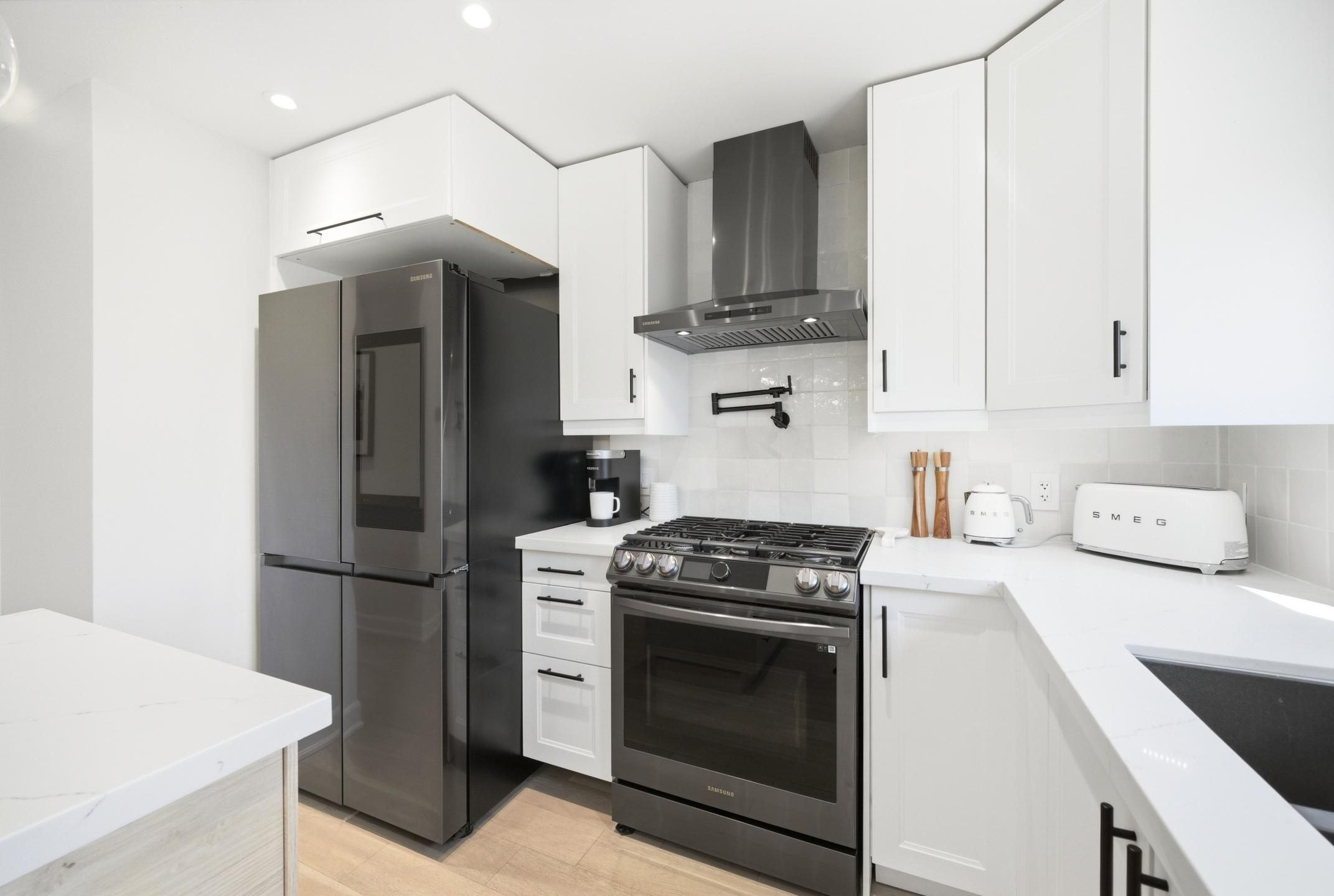 • Gourmet kitchen equipped with black Samsung Smart Appliances and quartz counters.