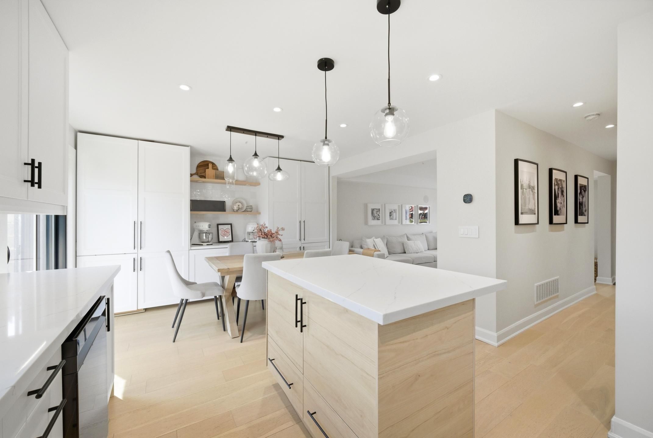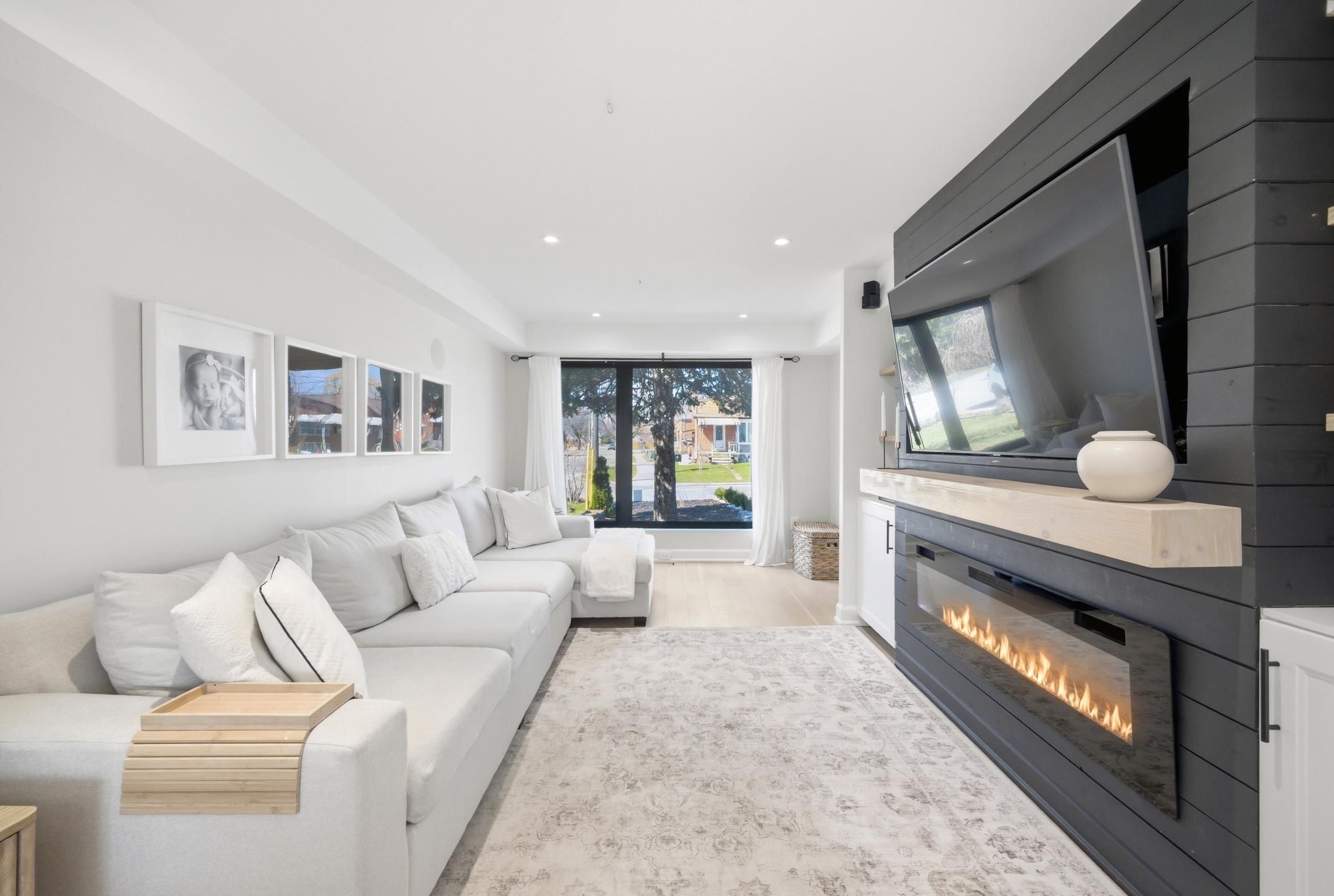 • Modern open concept living with a feature TV/fireplace wall.