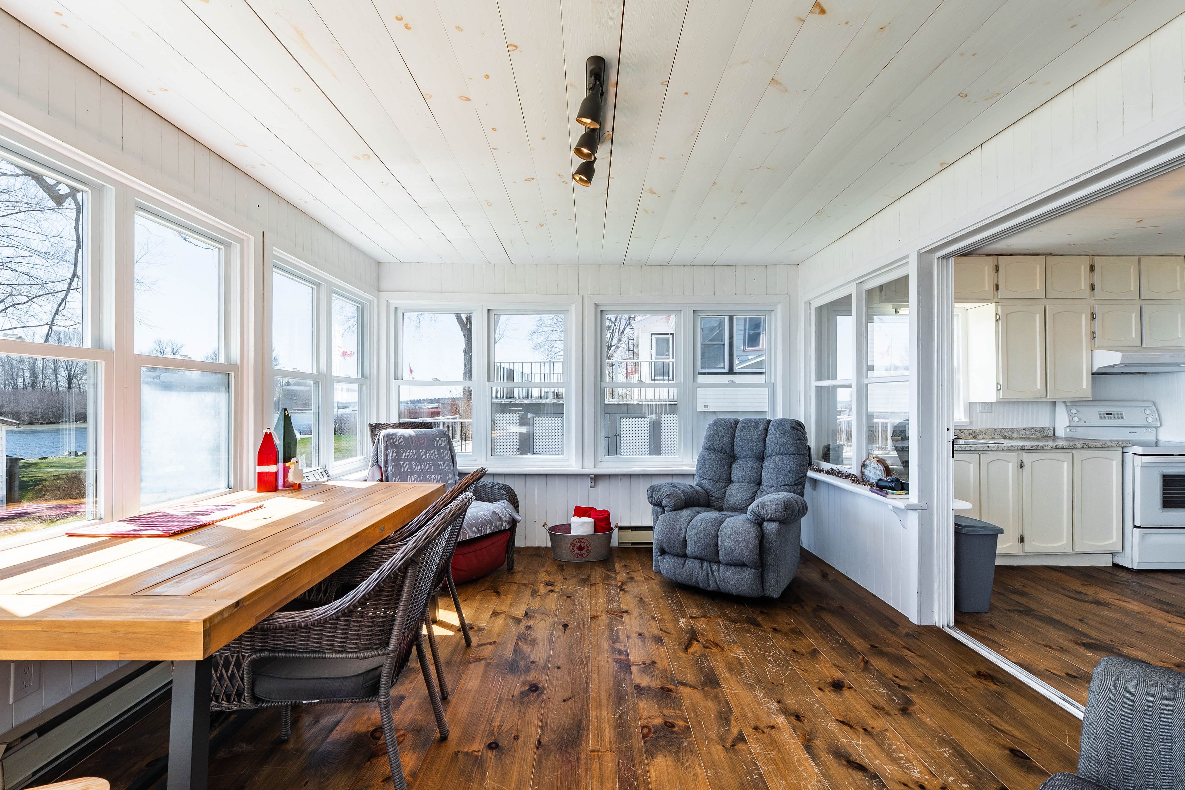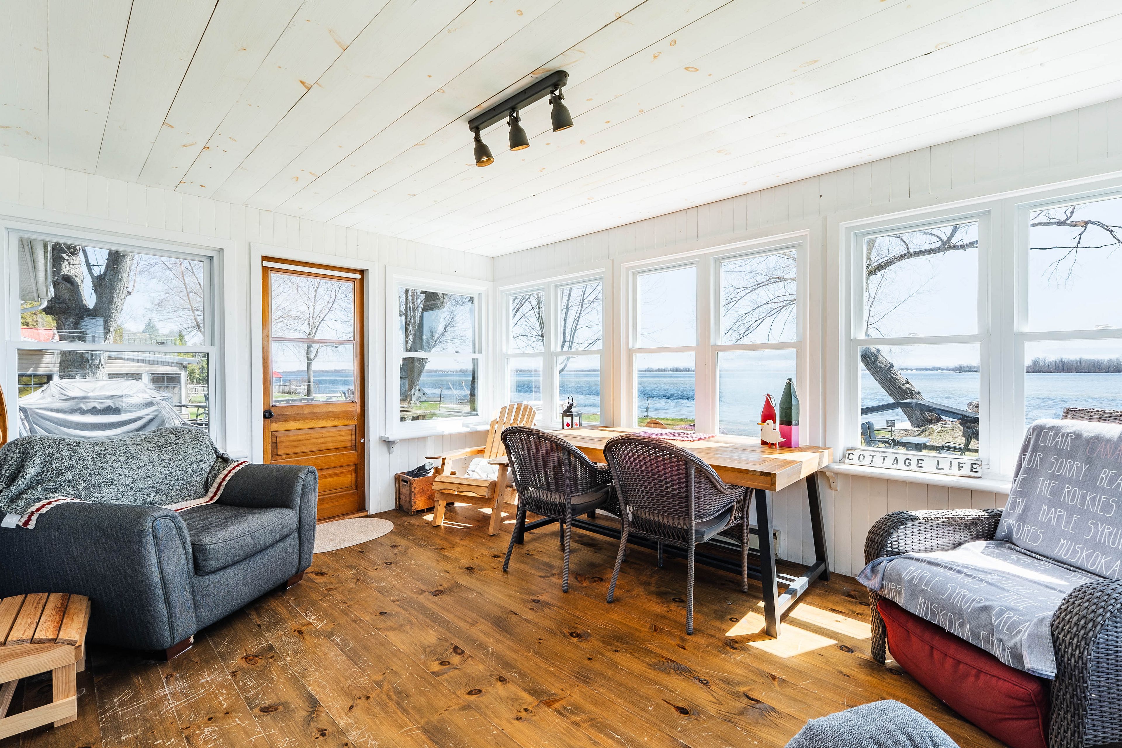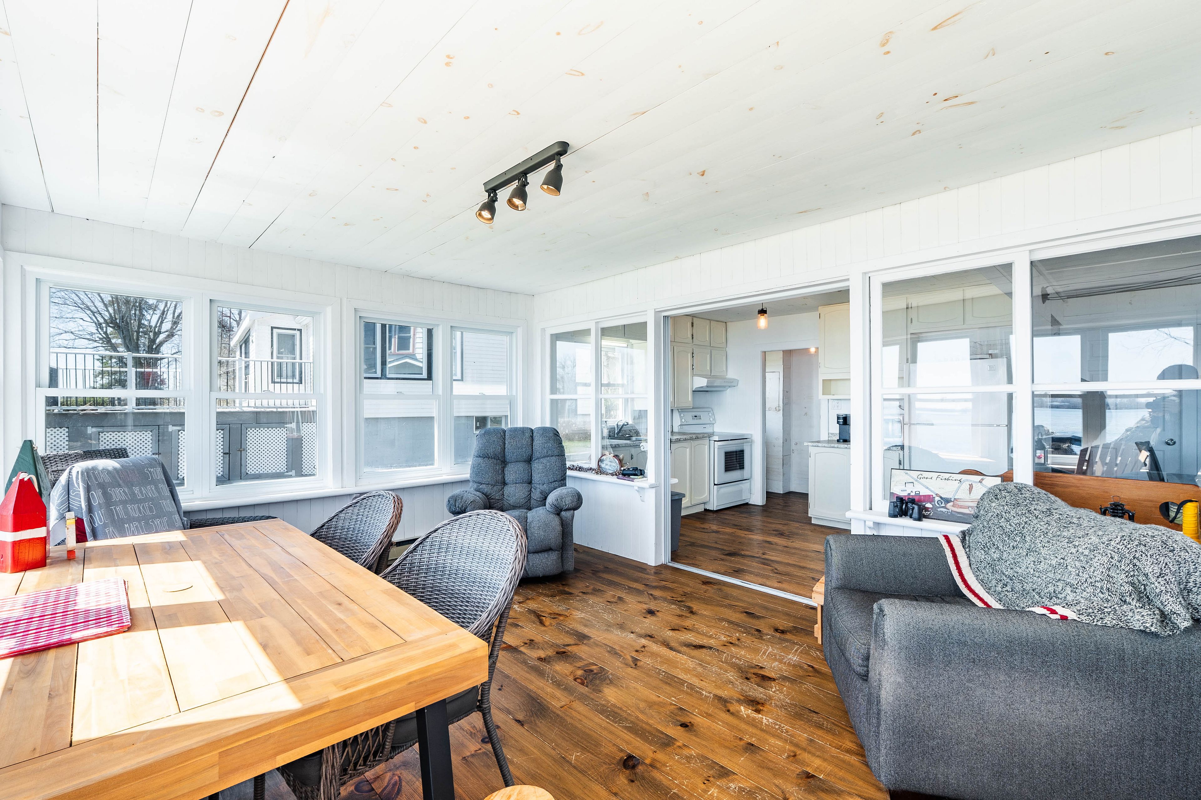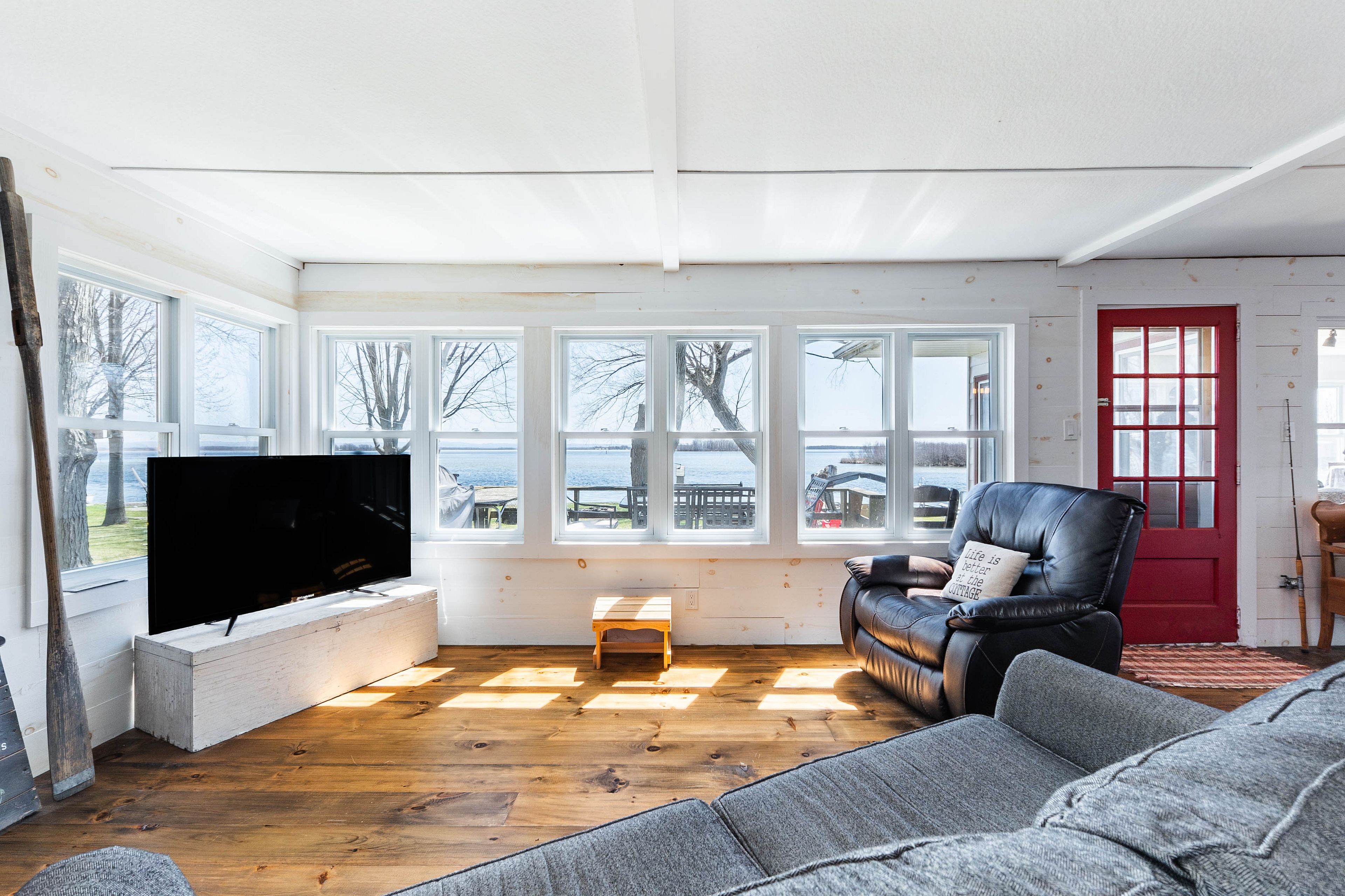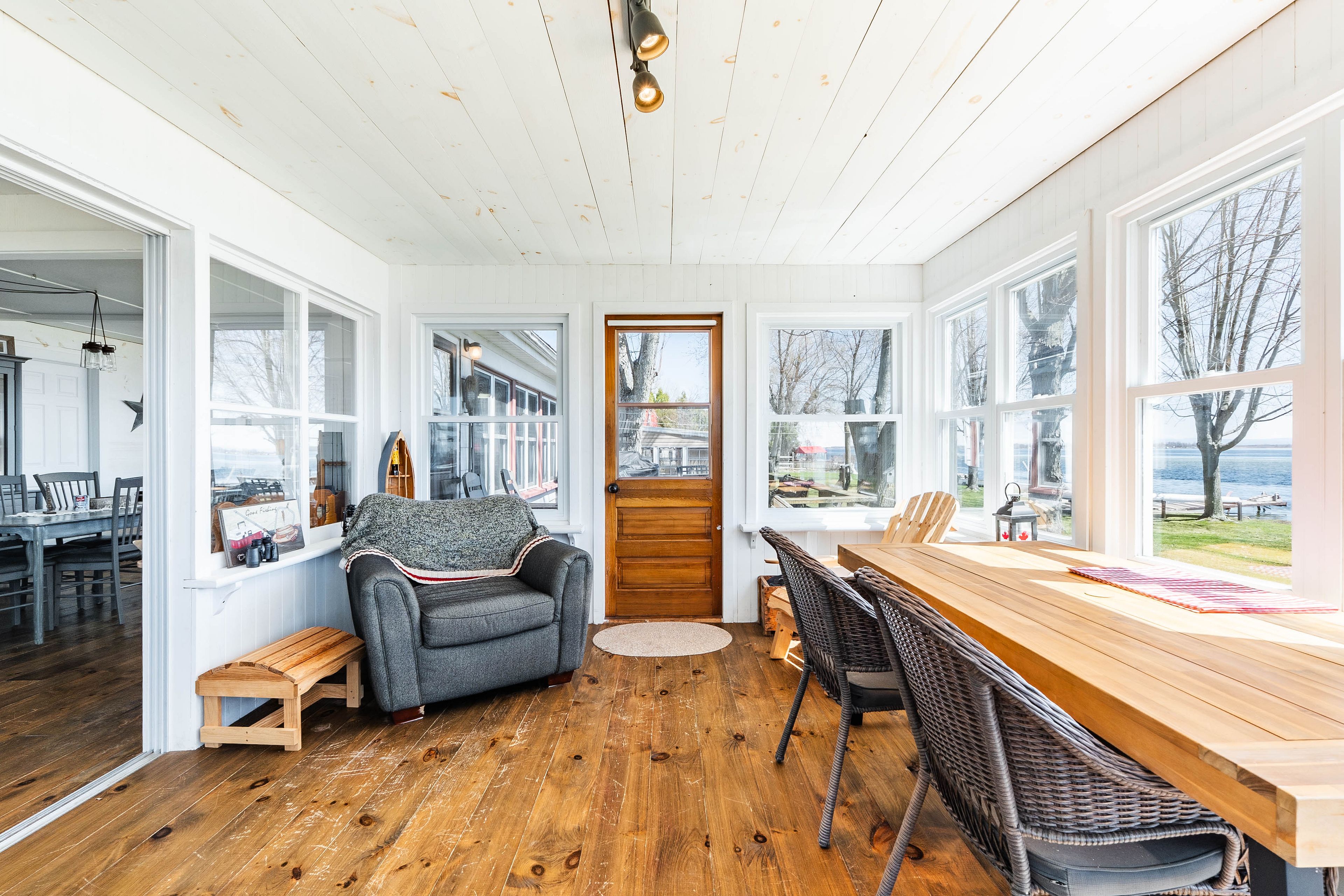 • Inviting sunroom for coffee, games, and enjoying waterfront views.