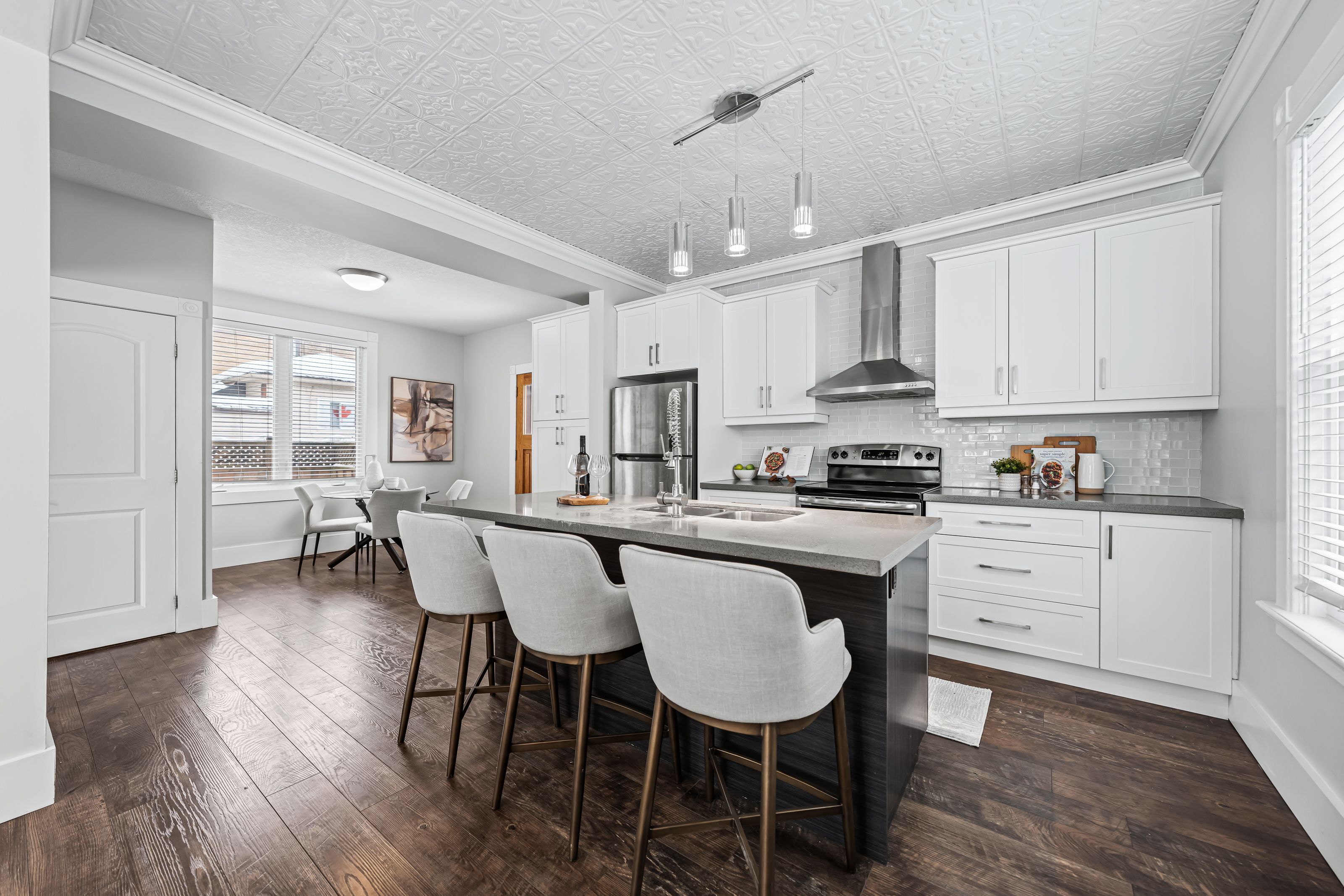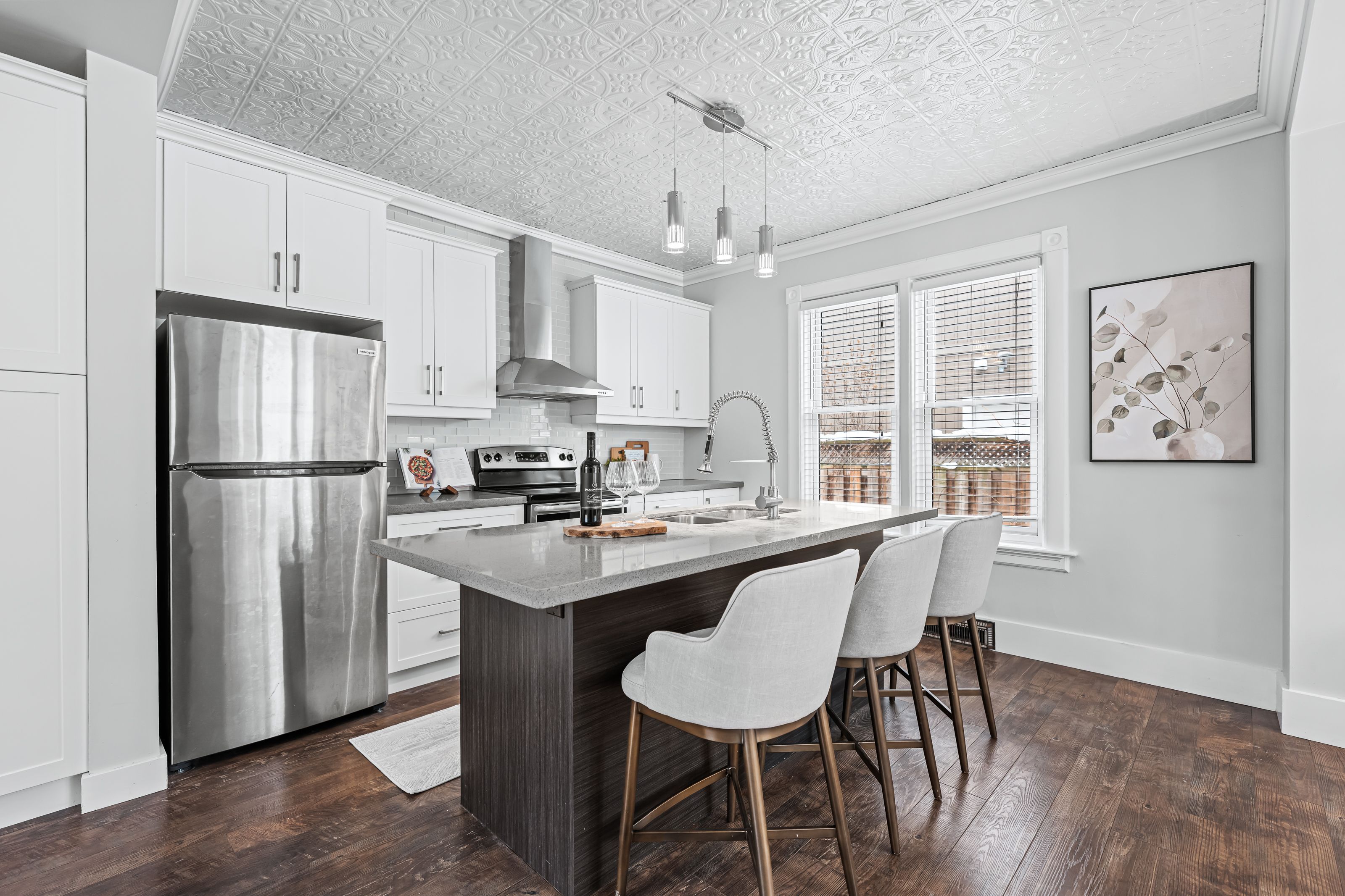 A rare opportunity in kitchener's historic victoria park neighbourhood-this beautifully restored century home has been fully updated from top to bottom while preserving the charm and character the area is known for. Located in the heart of the innovation district, this home offers modern finishes, thoughtful design, and an exceptional walkable lifestyle. The open-concept main floor features 9-foot ceilings, laminate flooring throughout, and a bright living room highlighted by an exposed brick feature wall. The updated eat-in kitchen offers quartz countertops, a large centre island, stainless steel appliances, tile backsplash, and a spacious integrated dining area, making it ideal for both everyday living and entertaining. A convenient 2-piece powder room completes the main level. The upper level includes a versatile media nook or home office area, two spacious bedrooms, and a spa-like 4-piece bathroom with a separate soaking tub, tiled glass shower enclosure, and rain shower fixture. The primary bedroom features dual closets, including a walk-in with custom built-ins and a sliding barn door. Outside, the fully fenced backyard offers a large deck and shed, providing functional outdoor space. Additional highlights include 2 parking spaces and sga-1 zoning, offering added flexibility for future use. Unbeatable location-minutes to the victoria park ion lrt station and downtown kitchener. Walk to victoria park, google, the tannery, university of waterloo health sciences campus, school of pharmacy, d2l, deloitte, restaurants, cafés, shopping, and transit. Close to grand river hospital, st. Mary's hospital, and the kitchener go station, with easy access to festivals, cultural events, and everything downtown kitchener has to offer. A rare blend of historic charm and modern living in one of kitchener's most sought-after neighbourhoods. An excellent opportunity to live-in or invest-perfect for owner-occupiers/those seeking a well-located property in the innovation district.