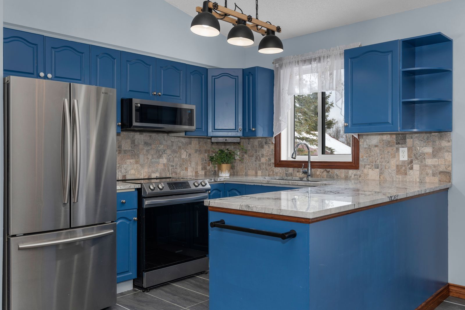 • Vibrant kitchen with blue cabinetry, granite counters, and stainless steel appliances.