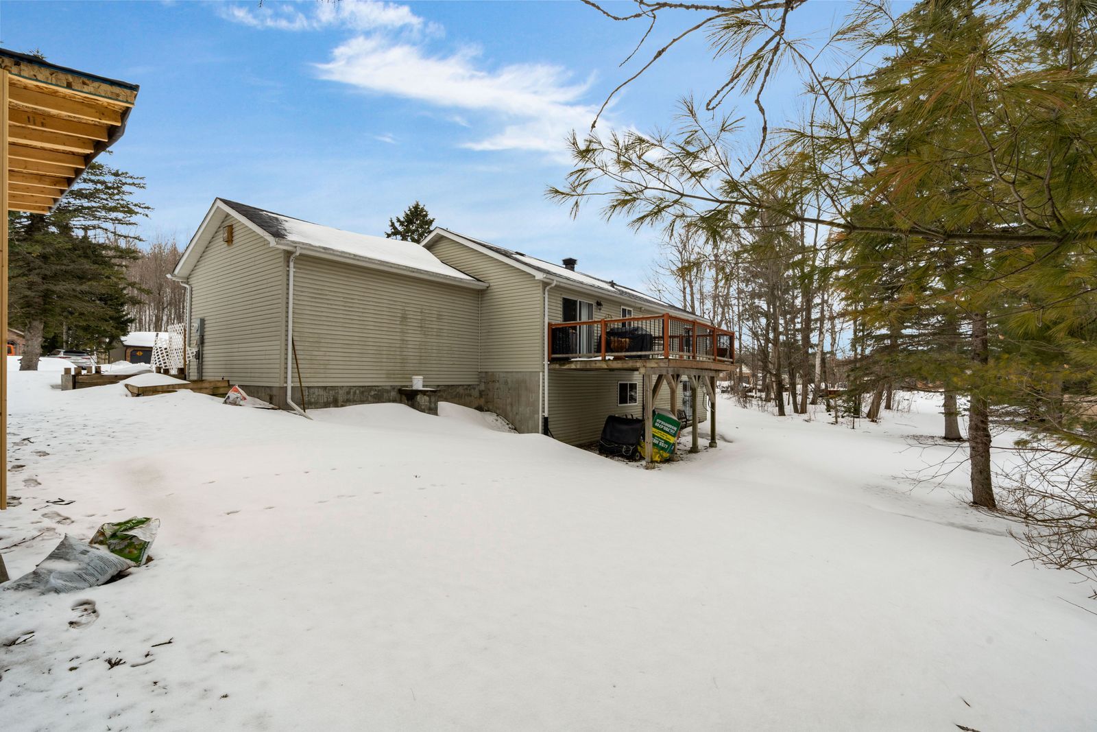 Walkout bungalow in the sought-after sugarbush neighbourhood with a four-season lifestyle right outside your door! Living in sugarbush means your morning routine includes the trailheads of copeland forest, local golf, and the ski runs of horseshoe valley, all while barrie and orillia sit just 20 minutes away. This bungalow stands out on its 227-foot corner frontage, framed by mature trees and a covered porch that's practically begging for a couple of muskoka chairs. The open-concept main level opens up beautifully with vaulted ceilings, natural light, and hardwood floors through the living and dining areas. The kitchen makes a bold statement with vibrant blue cabinetry, granite counters, stainless steel appliances, and a stylish industrial light fixture, while the adjacent dining area walks out to a raised deck overlooking the backyard and bordering trees. Solid oak doors and trim bring a sense of craftsmanship to the interior, while the primary bedroom includes a double closet and semi-ensuite access to the main 3-piece bathroom. The finished walkout basement extends the living space with a large rec room centred around a gas fireplace, a full bathroom, a large storage area, and a separate bonus space suited to a den, office, or home gym. With an attached 2-car garage and driveway parking for 4 or more vehicles, this is exactly where a quieter pace of life and four-season adventure finally come together.