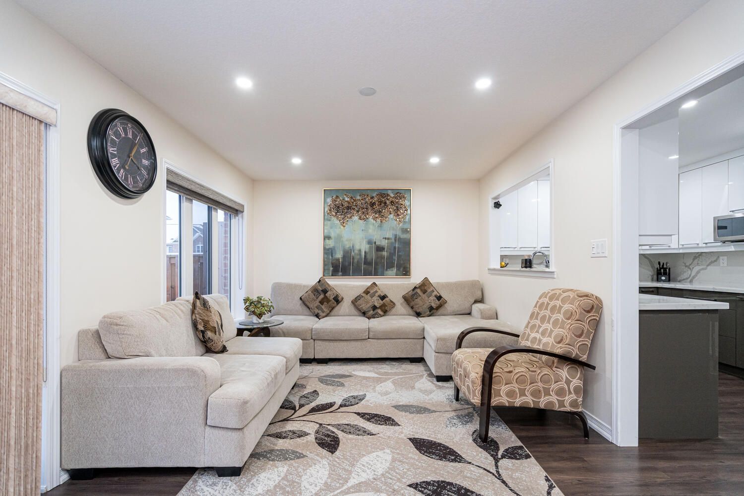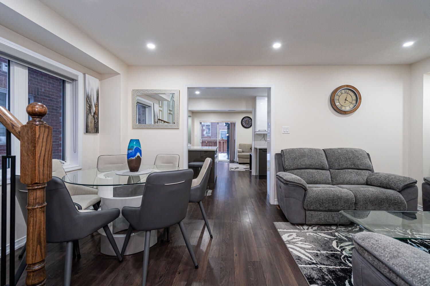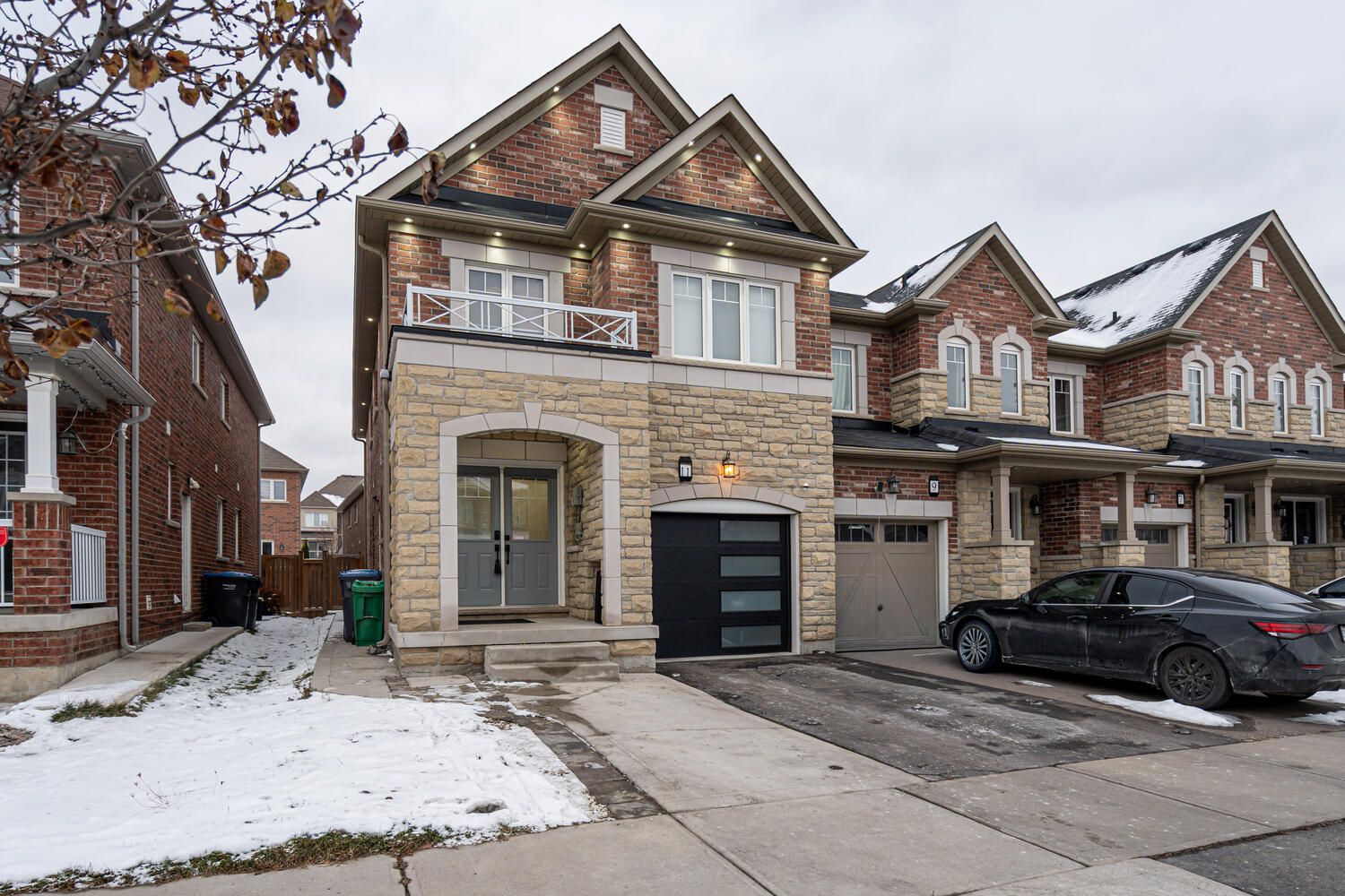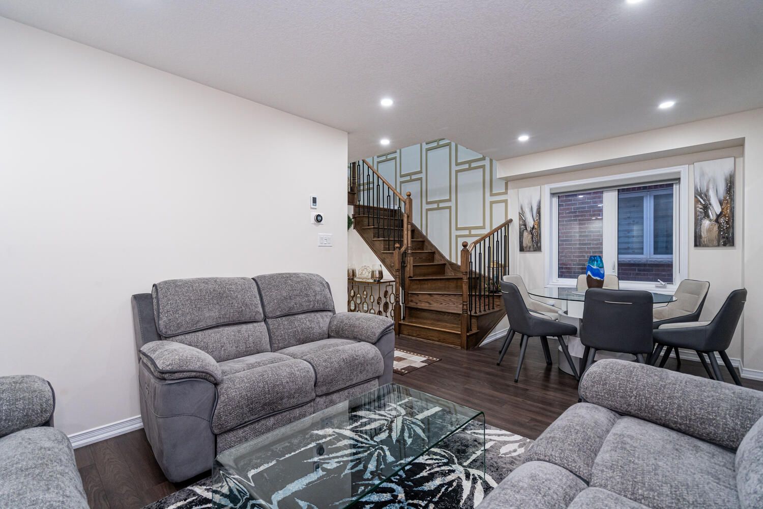 This absolutely gorgeous end-unit townhome offers over 2000 sq ft of beautifully finished living space and truly feels like a semi-detached, featuring a striking stone-and-brick exterior, exterior pot lights and a grand double-door entrance that makes an unforgettable first impression. The main floor is bright and inviting with laminate flooring, pot lights and both a separate living room and family room-perfect for families who want privacy and extra space. The stunning modern kitchen steals the show with high-end quartz countertops, a stylish backsplash, stainless steel appliances, glossy white cabinets and a functional island that adds both charm and convenience. The cozy family room is designed for comfort with a custom tv wall and added storage, while elegant wainscotting and upgraded oak stairs with iron spindles lead you to the second level, where you'll find four spacious bedrooms, two full bathrooms and a dedicated laundry room. The finished basement adds incredible value, ideal as an in-law suite or future rental potential, giving first-time buyers room to grow. The maintenance-free backyard with a massive deck and beautiful gazebo creates the perfect outdoor retreat. This home is truly a rare find-stylish, spacious and absolutely perfect for first-time buyers looking for comfort, luxury and long-term value.