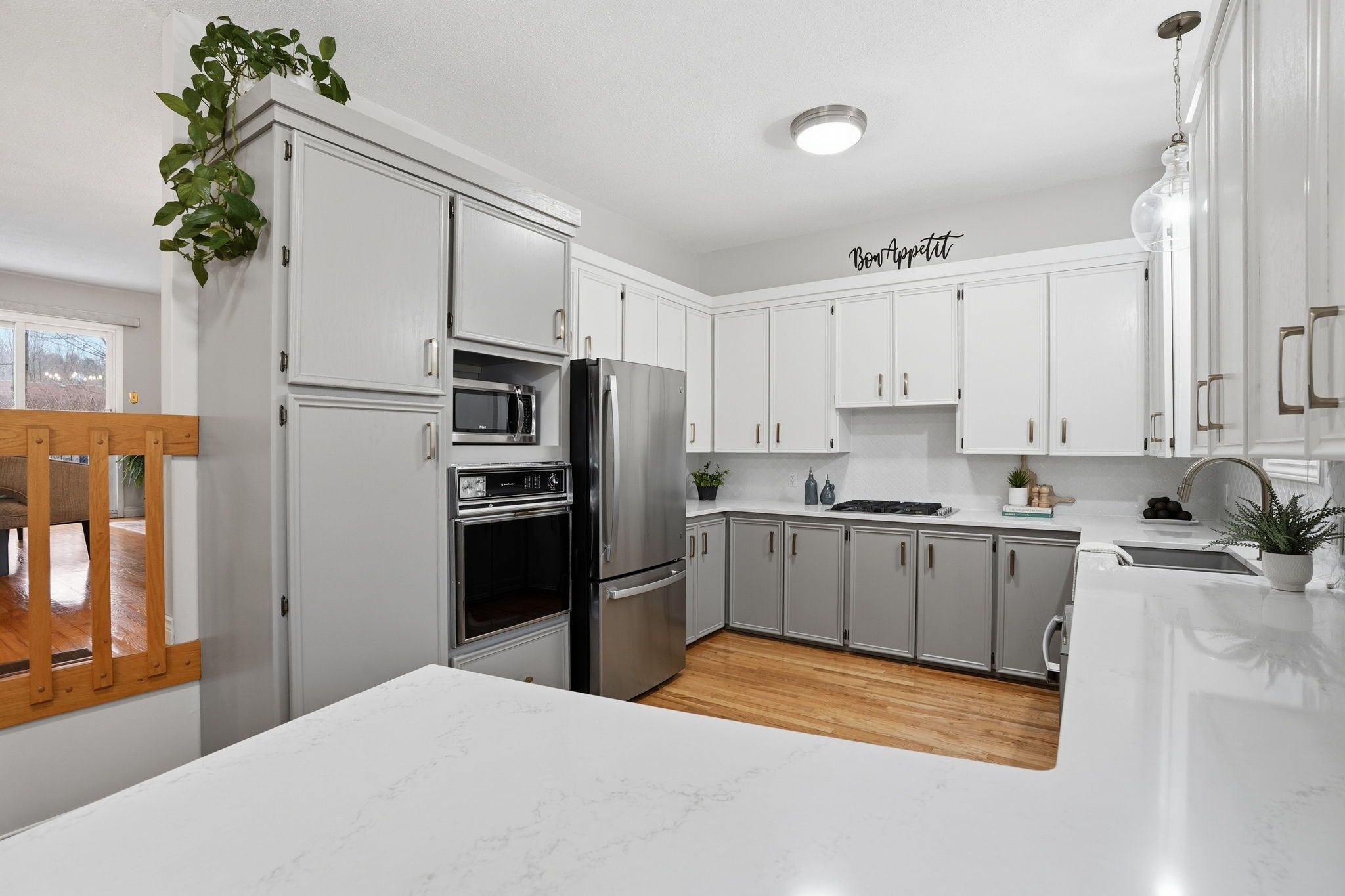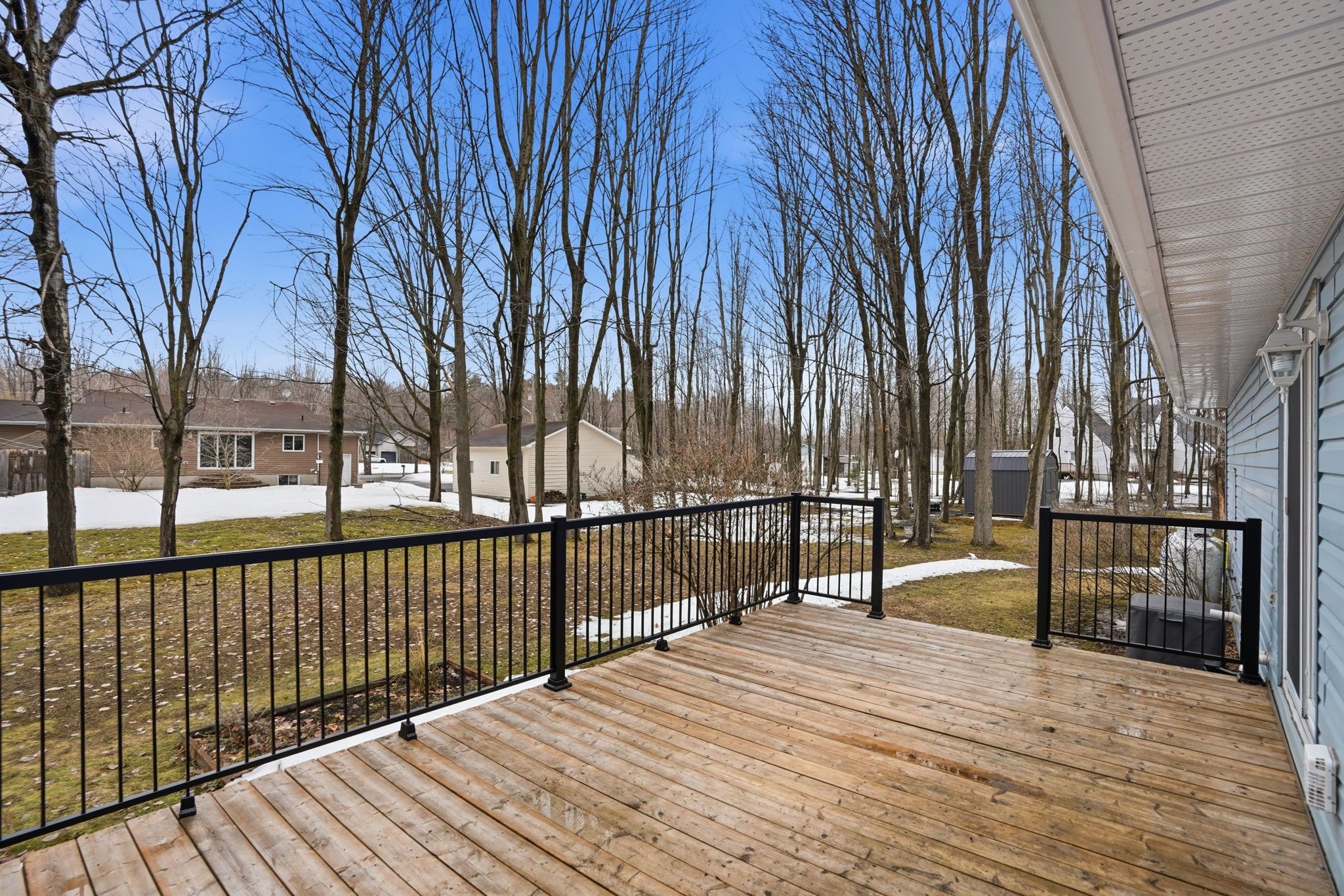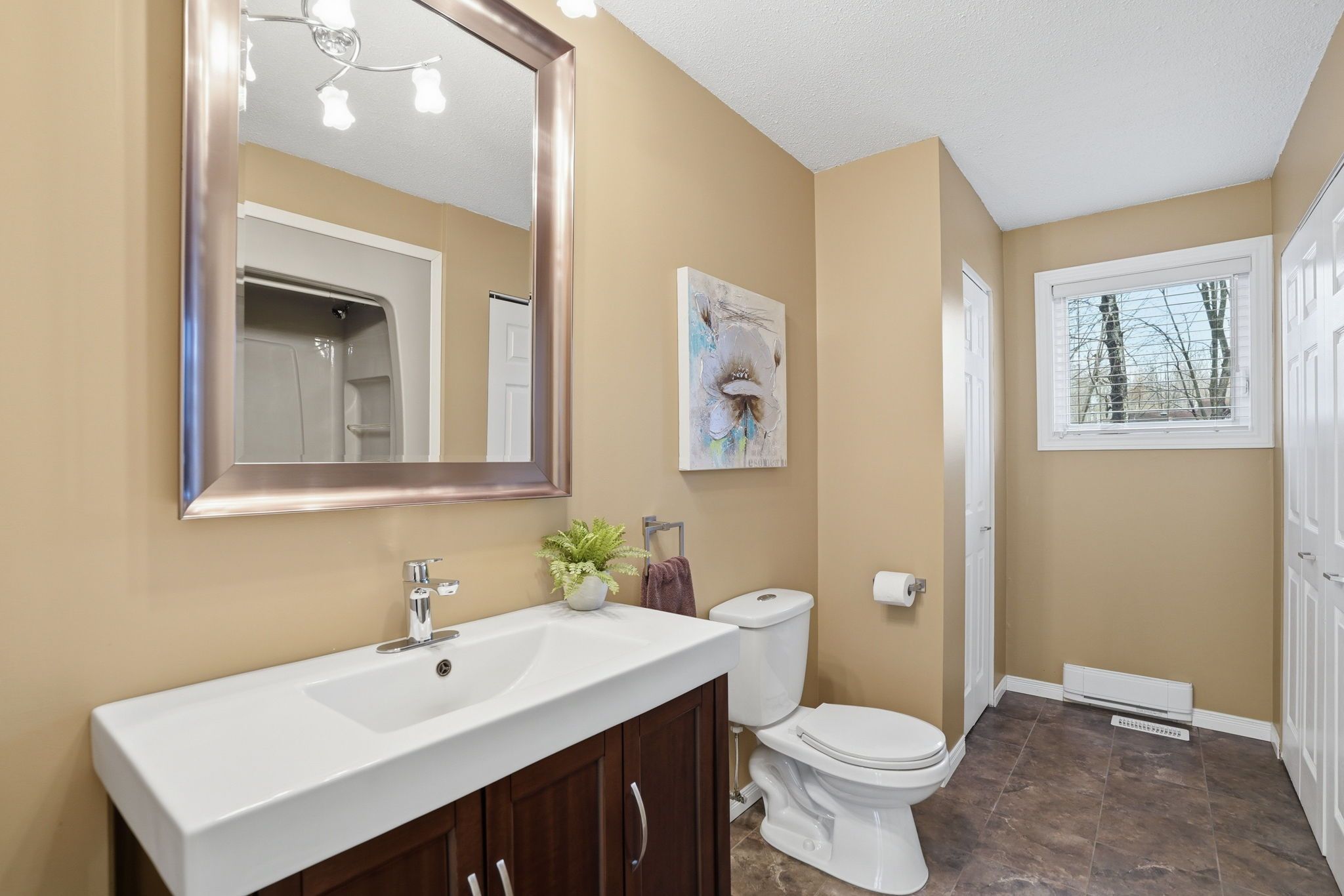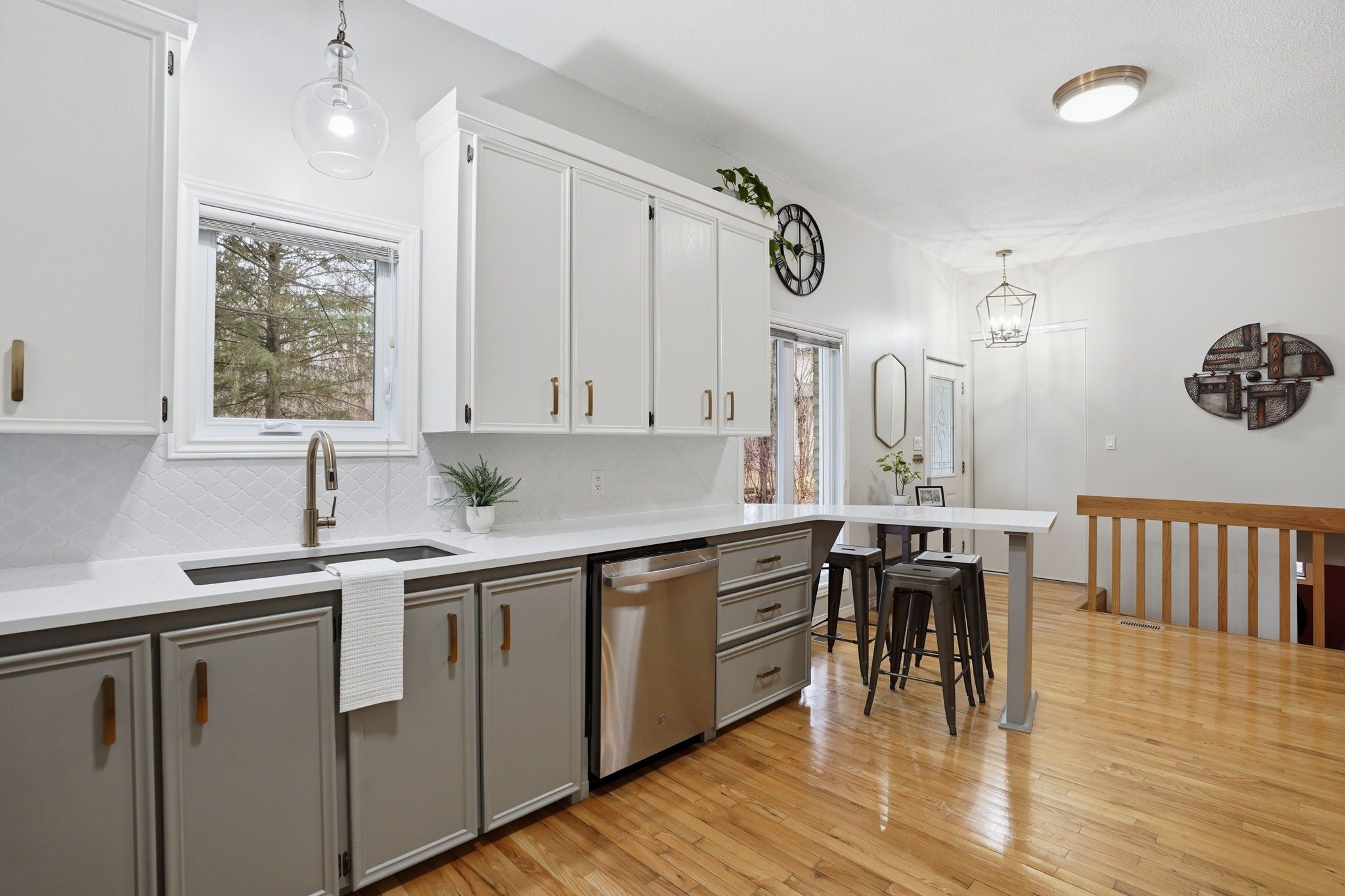 Welcome to this beautiful bungalow offering the perfect blend of comfort, style, and space. Set on a generous, private lot with mature trees and exceptional outdoor living, this home is a dream. From the moment you arrive, the charming covered front porch invites you in. Step inside to a bright and sunny main level, where natural light pours through the windows, highlighting the home's warm and inviting atmosphere. The stunning kitchen is truly the heart of the home, featuring sleek, modern finishes and a functional layout that makes it a dream for both everyday living and entertaining. The open-concept living and dining areas flow seamlessly, with patio doors leading to the backyard-perfect for indoor-outdoor living. The main floor offers three well-appointed bedrooms and two stylish bathrooms, including one with convenient main-floor laundry. The spacious primary bedroom features his and hers closets, providing both comfort and practicality. The fully finished lower level expands your living space with a large rec room complete with a cozy fireplace-ideal for relaxing or hosting-along with an additional bedroom for guests or family. Outside, enjoy a large, private backyard surrounded by mature trees, featuring a spacious deck perfect for entertaining, unwinding, or enjoying peaceful summer evenings. A truly lovely home that checks all the boxes-modern, functional, and set in a serene setting.