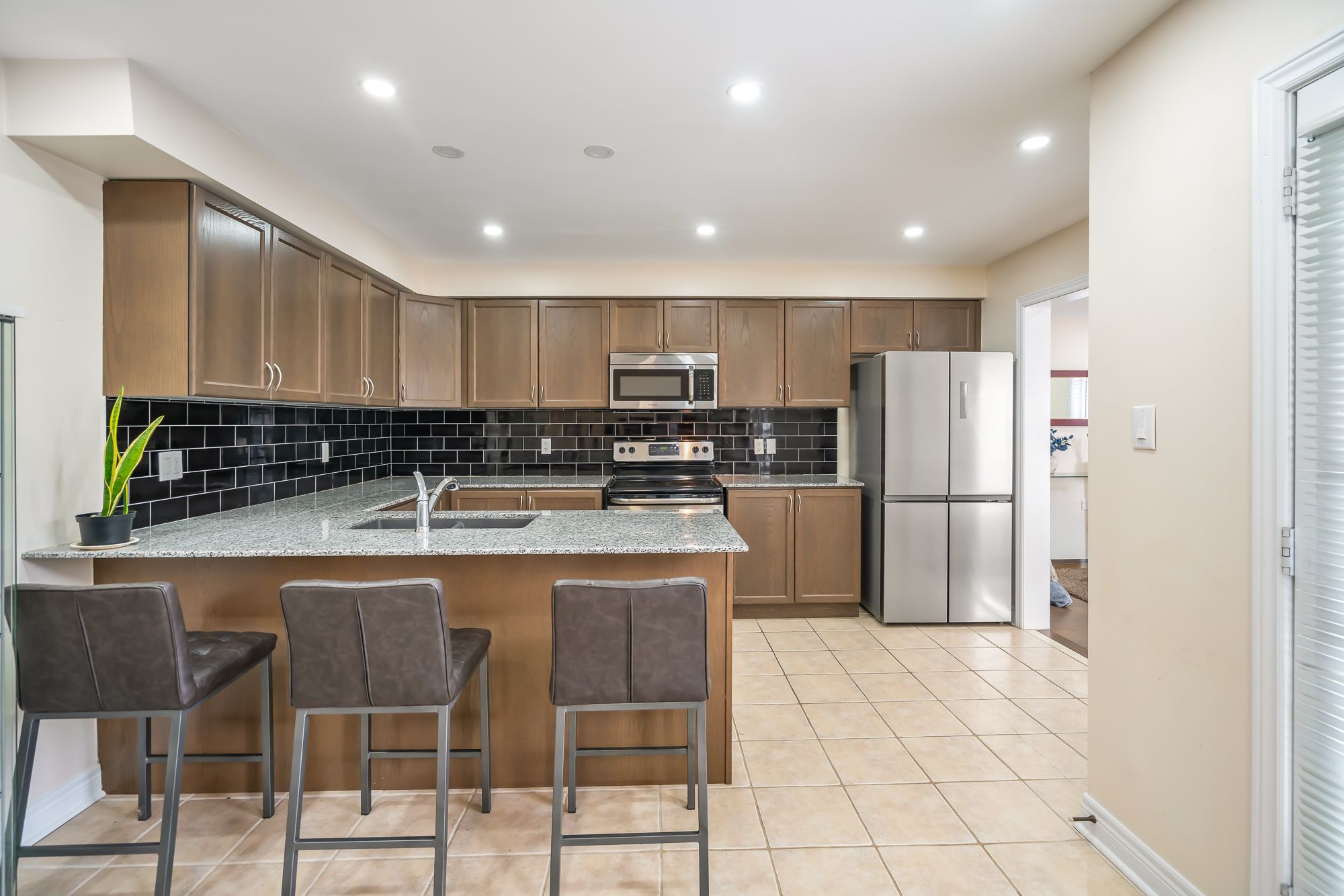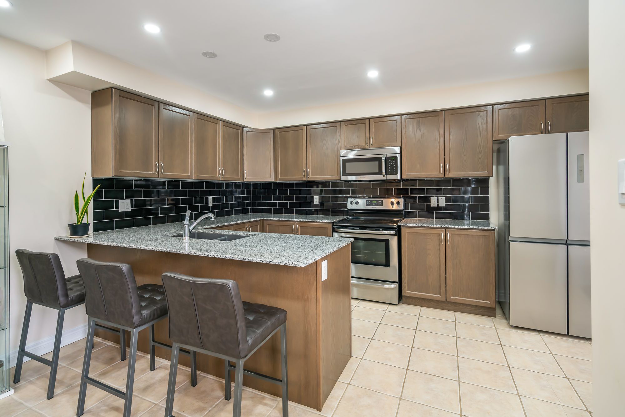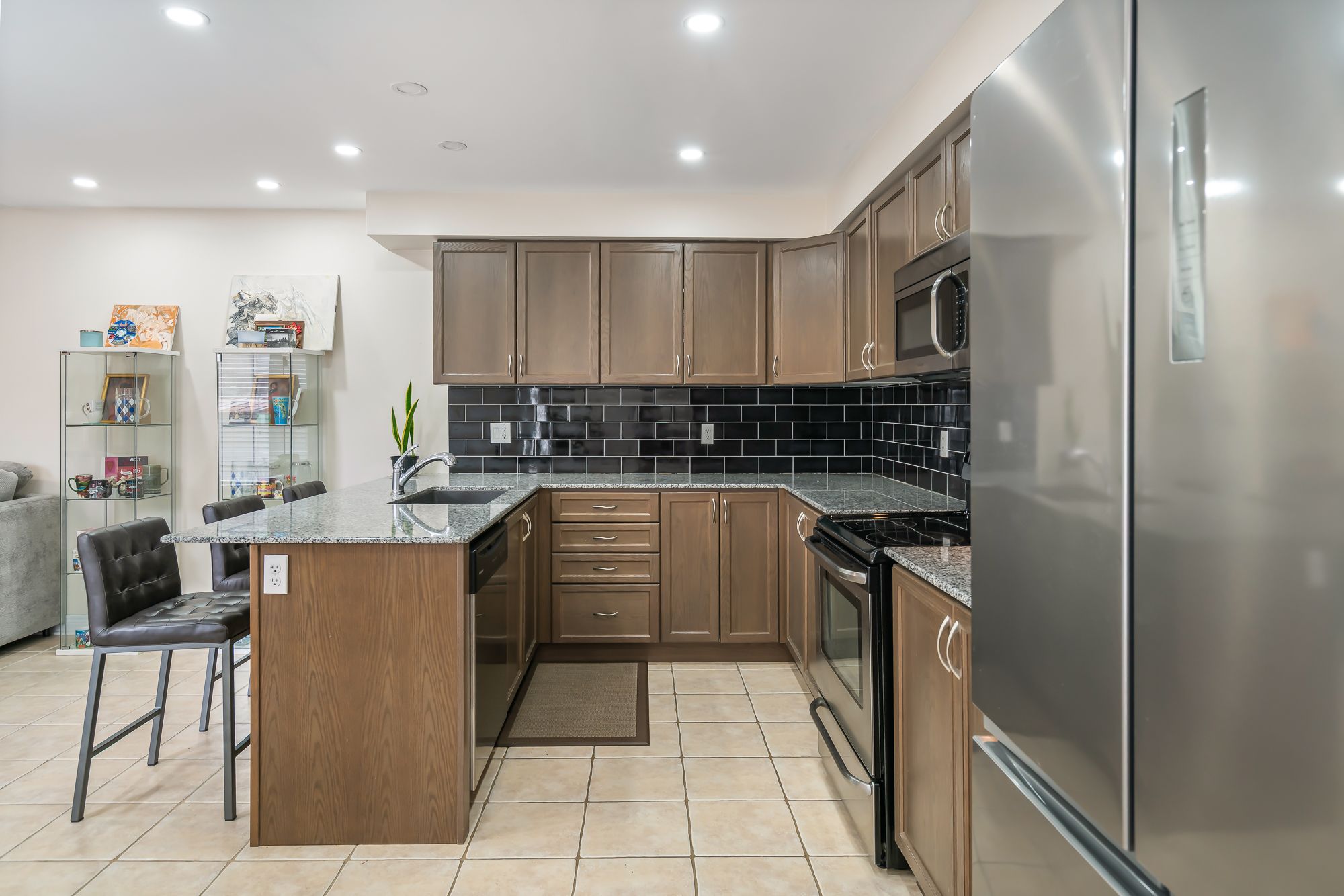 • Modern kitchen with quartz countertops and stainless steel appliances.