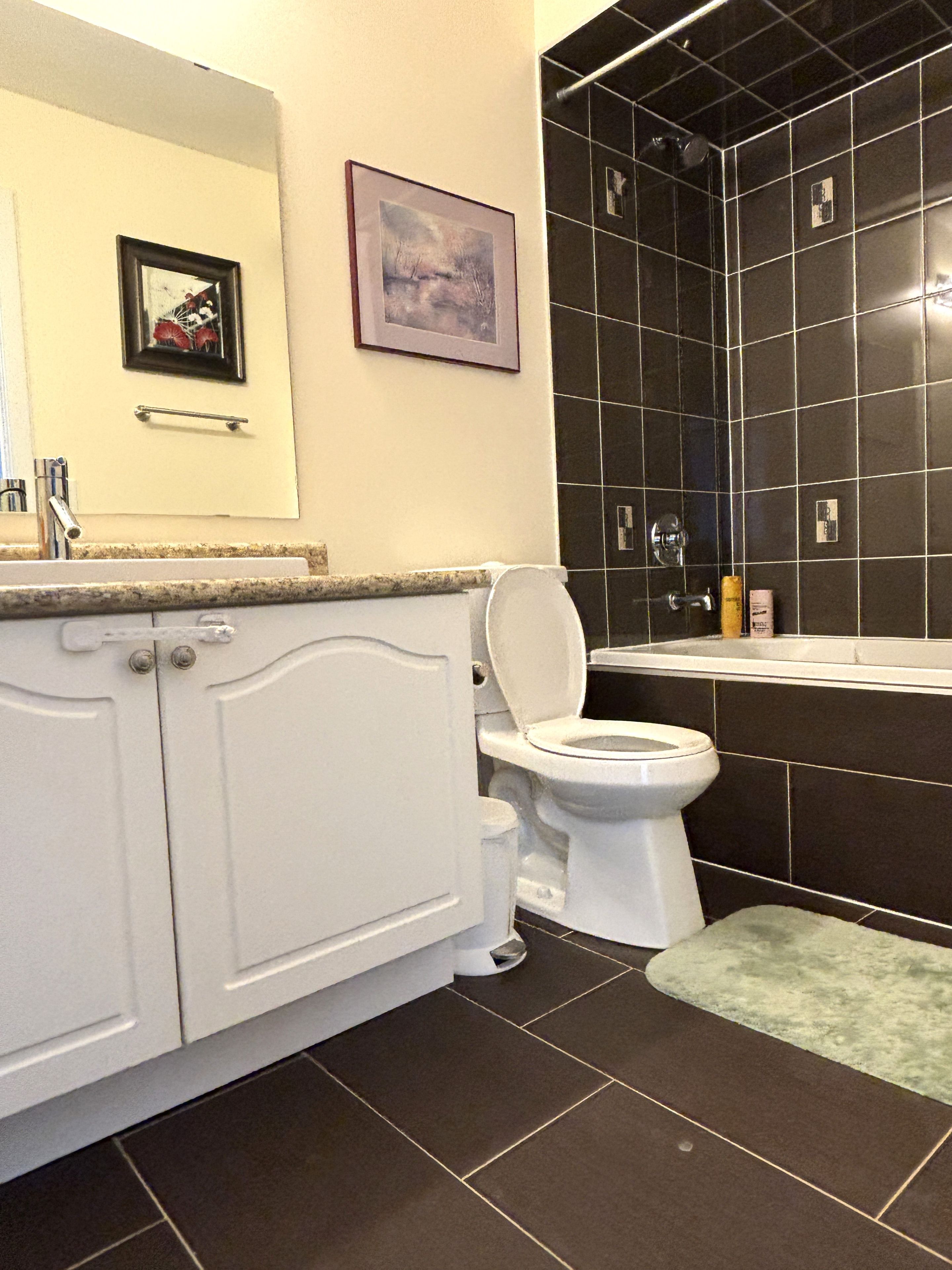 • Modern kitchen features stainless steel appliances and quartz countertops.