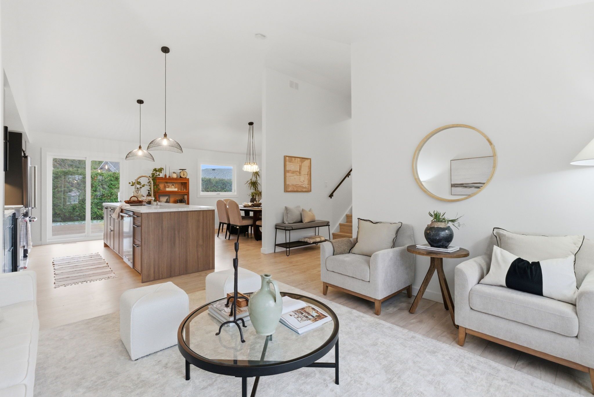 • Bright living room with vaulted ceilings and a custom deck for outdoor access.