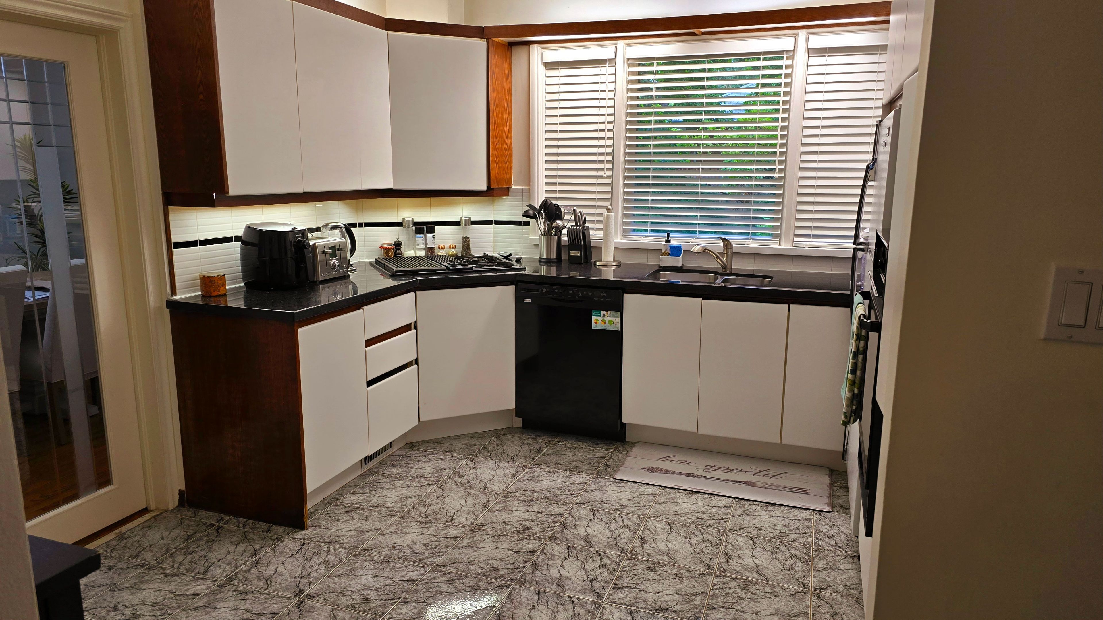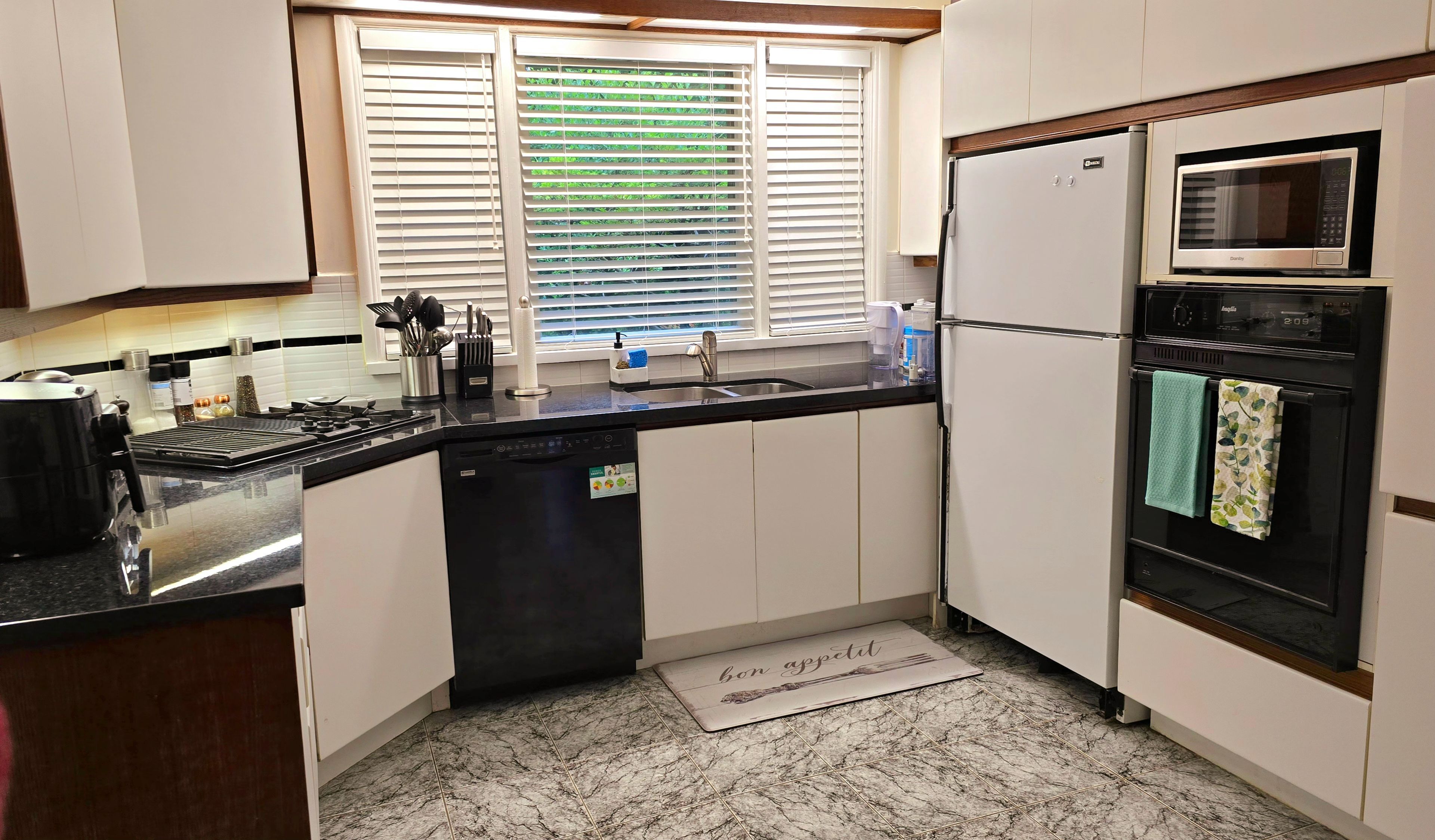 • Bright white kitchen overlooking a fenced backyard for family activities.