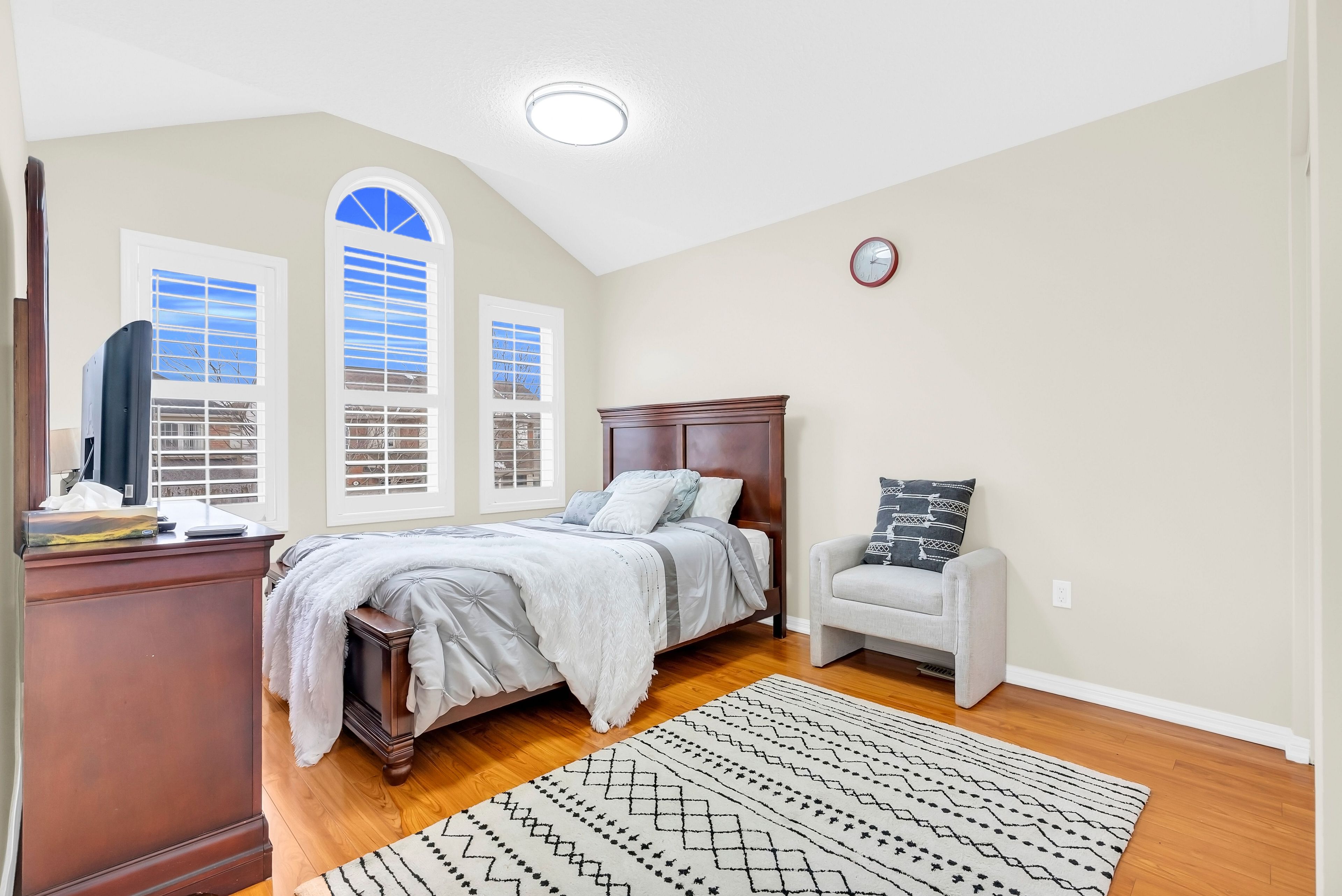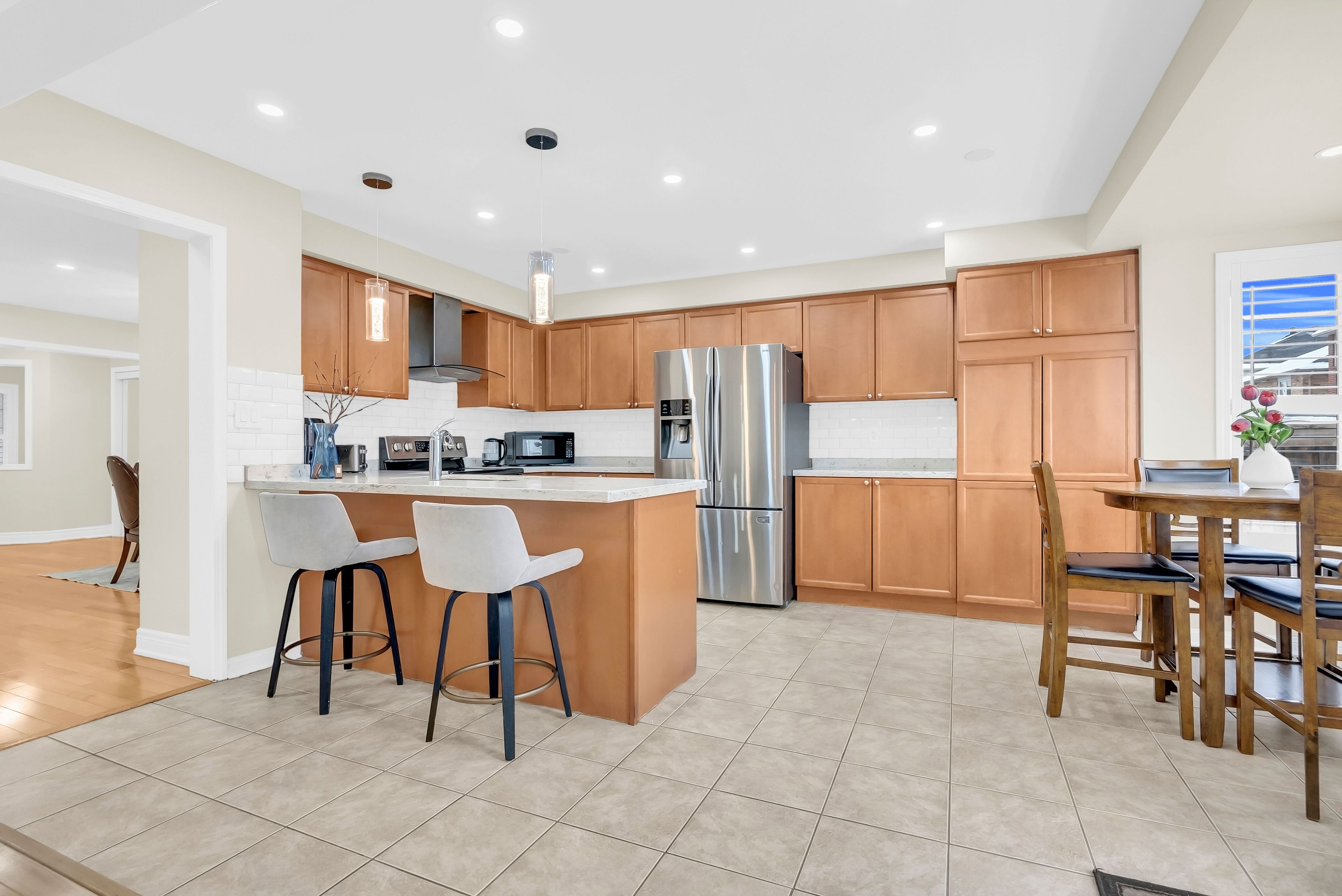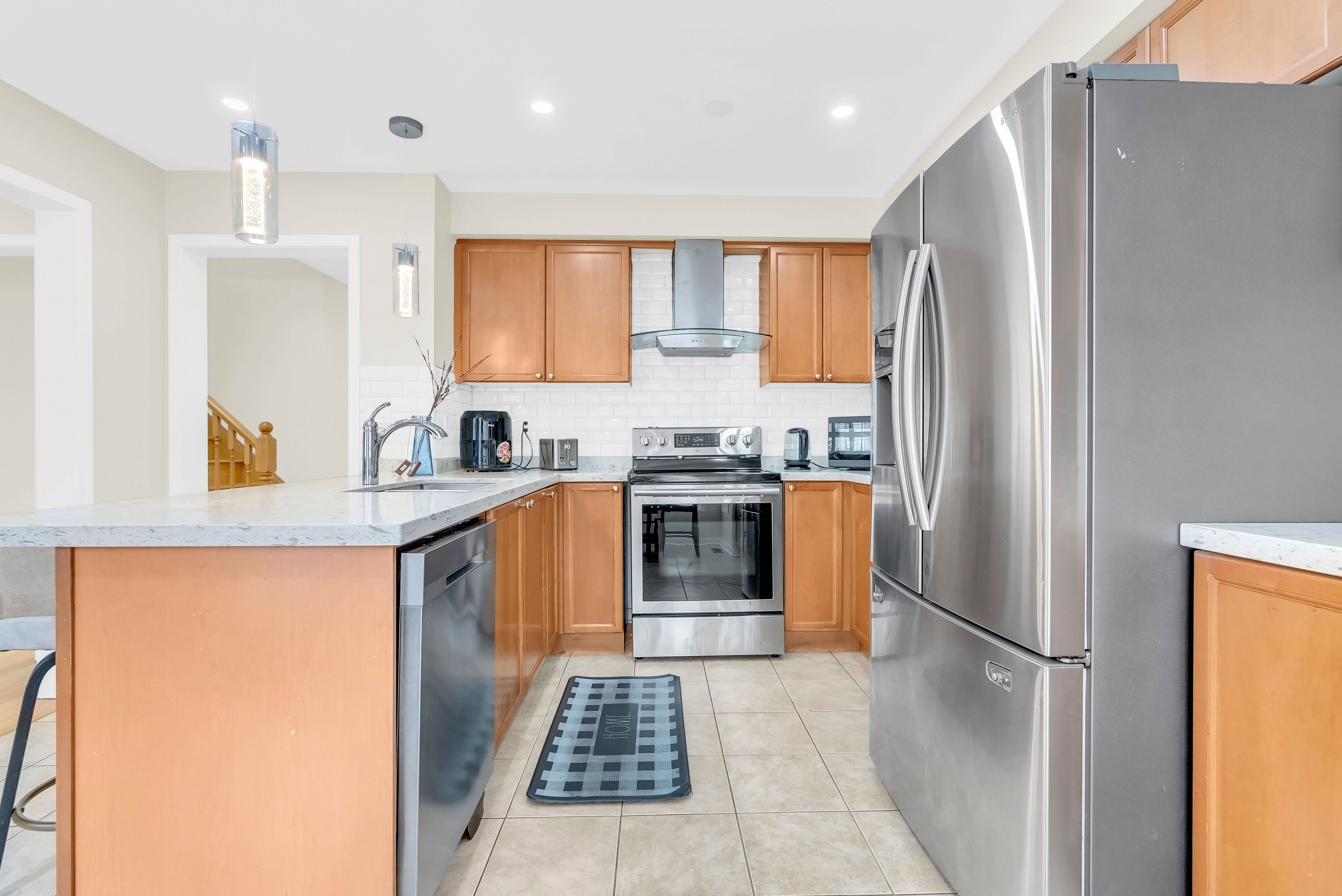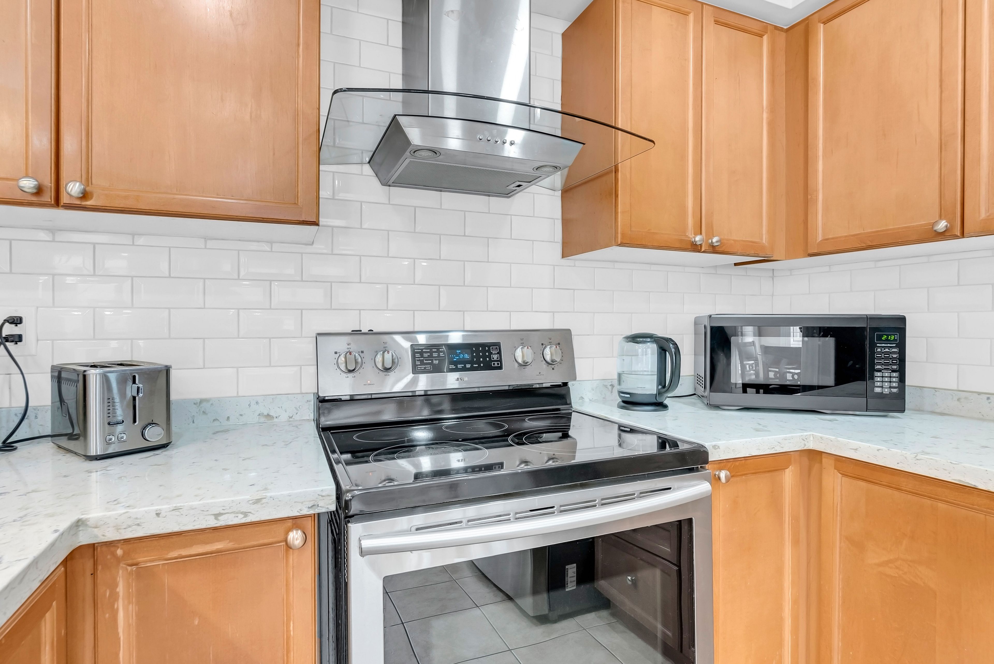 • Upgraded kitchen with quartz countertops and hardwood cabinetry.