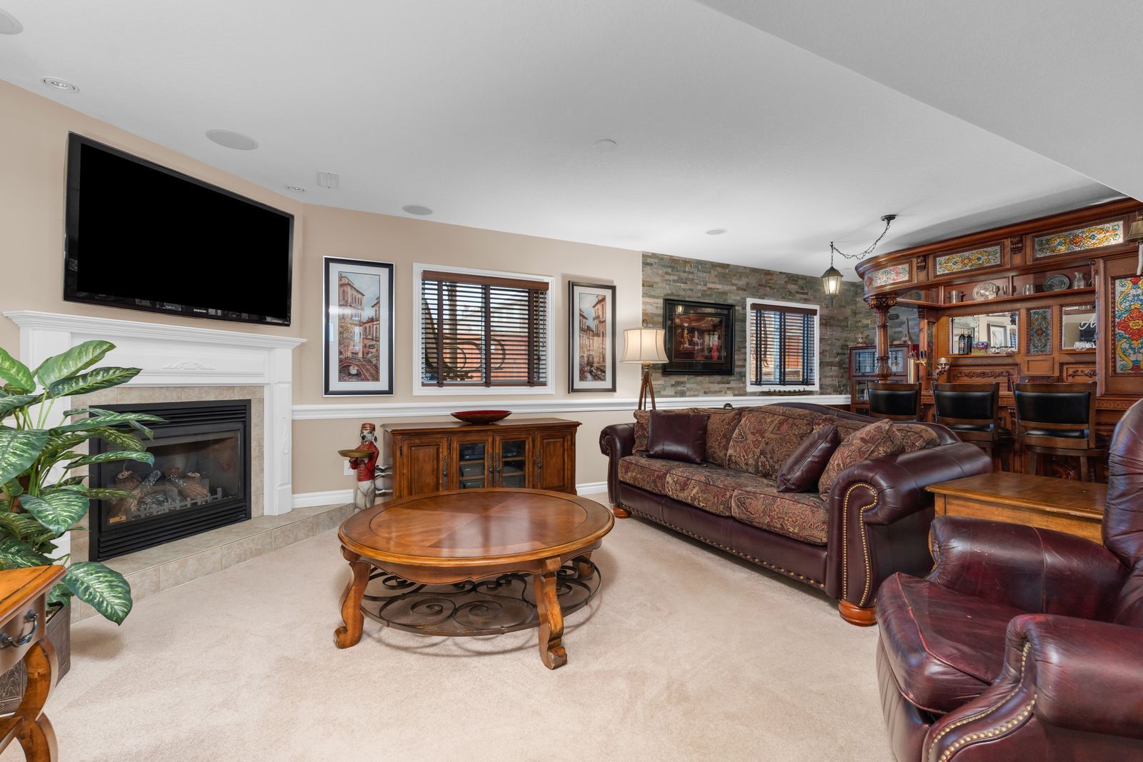 • Vaulted ceilings and wood beams create an inviting, spacious atmosphere.