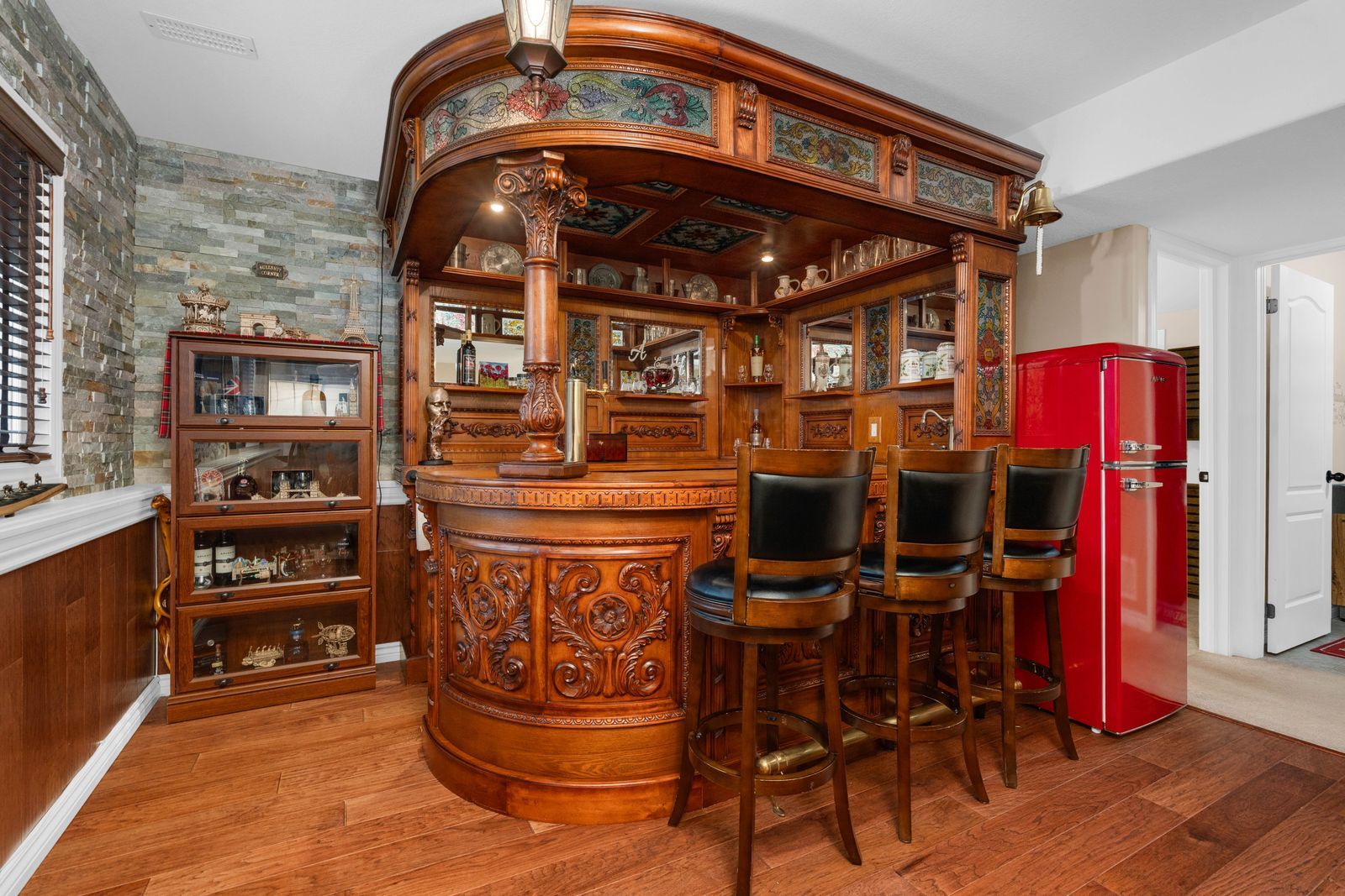 Pride of ownership, a heated garage, & upgrades in all the right places! There's something about this home that feels different the moment you step in, where soaring ceilings, rich finish choices, and warm wood details give the interior an inviting, refined feel. Set on a family-friendly street in angus, this beautifully maintained 3-level backsplit offers more than 1,300 square feet with pride of ownership and thoughtful upgrades throughout. Vaulted ceilings with wood beams bring dramatic height to the kitchen and dining area, while the open view into the living room gives the layout a look that feels far more custom than expected. Wood cabinetry, tile backsplash, stainless steel appliances, a pot filler, and a raised island with seating, a prep sink, display cabinetry on one side, and wine storage on the other make the kitchen a standout in both style and function. Formal dining overlooks the living room, where a fireplace adds warmth, while the bar area with intricate wood detailing gives the space a high-end look buyers will remember. Three upper-level bedrooms include a primary bedroom with double french doors, decorative wall moulding, and semi-ensuite access. Outside, the brick and siding exterior is framed by beautifully landscaped grounds with gem stone lighting, updated shingles, in-ground irrigation, a fully fenced yard, a matching shed, and a metal gazebo. The attached 2-car heated garage features a gas furnace, epoxy flooring, and a garage door screen, plus there is parking for 4 more vehicles in the driveway. A water softener, a central vac with a kitchen kick plate, and a security alarm system are also included. With restaurants, schools, trails, golf, essa public library, angus recreation centre, and base borden nearby, plus easy access to highway 400, alliston, and barrie, this is the kind of home that buyers will remember long after the showing ends.