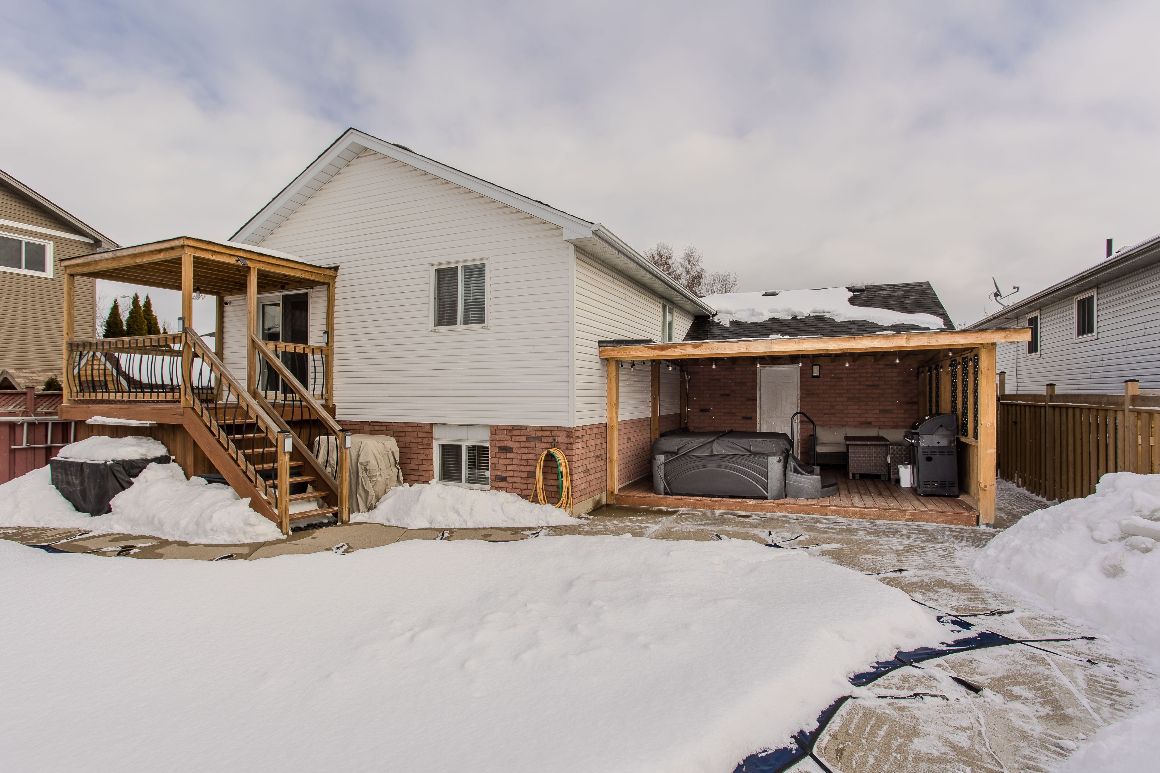 Welcome to this beautifully maintained raised bungalow nestled on a quiet, family-friendly street in one of brantford's most sought-after communities. Offering 2325sf of living space, this home blends comfort, functionality, and outdoor fun-perfect for families. Enjoy a connected neighbourhood with a museum just around the corner with tons of activities for the family. Step inside to a warm and welcoming entryway and discover hardwood flooring throughout the main level. The bright and inviting living room features sun-filled windows, a vaulted ceiling, and a gas fireplace-creating the perfect space for relaxing evenings and gatherings. The dining area flows seamlessly from the living space, making hosting effortless. The eat-in kitchen offers plenty of room for everyday life, complete with tile backsplash, stainless steel appliances, and a charming breakfast nook overlooking the backyard-perfect for casual meals, homework time, or morning coffee. The spacious primary bedroom serves as a peaceful retreat, featuring a walkout to the elevated back deck where you can enjoy quiet mornings or unwind at the end of the day. Two additional generously sized bedrooms and a well-appointed 4-piece main bathroom provide comfortable space for children, guests, or a home office. The fully finished lower level expands your living space with large egress windows that fill the area with natural light. Enjoy a generous rec room perfect for movie nights, a 3-piece bathroom, and an additional bedroom-ideal for guests, teens, or a home office. Step outside to your private backyard oasis. Fully fenced and designed for entertaining, it features a sparkling in-ground pool, a raised covered wood deck, a second deck with pergola, and a convenient pool shed. Whether hosting summer gatherings or enjoying quiet family time, this outdoor space truly has it all. A fantastic opportunity to own a move-in ready family home in a desirable neighbourhood close to parks, schools, and everyday amenities.