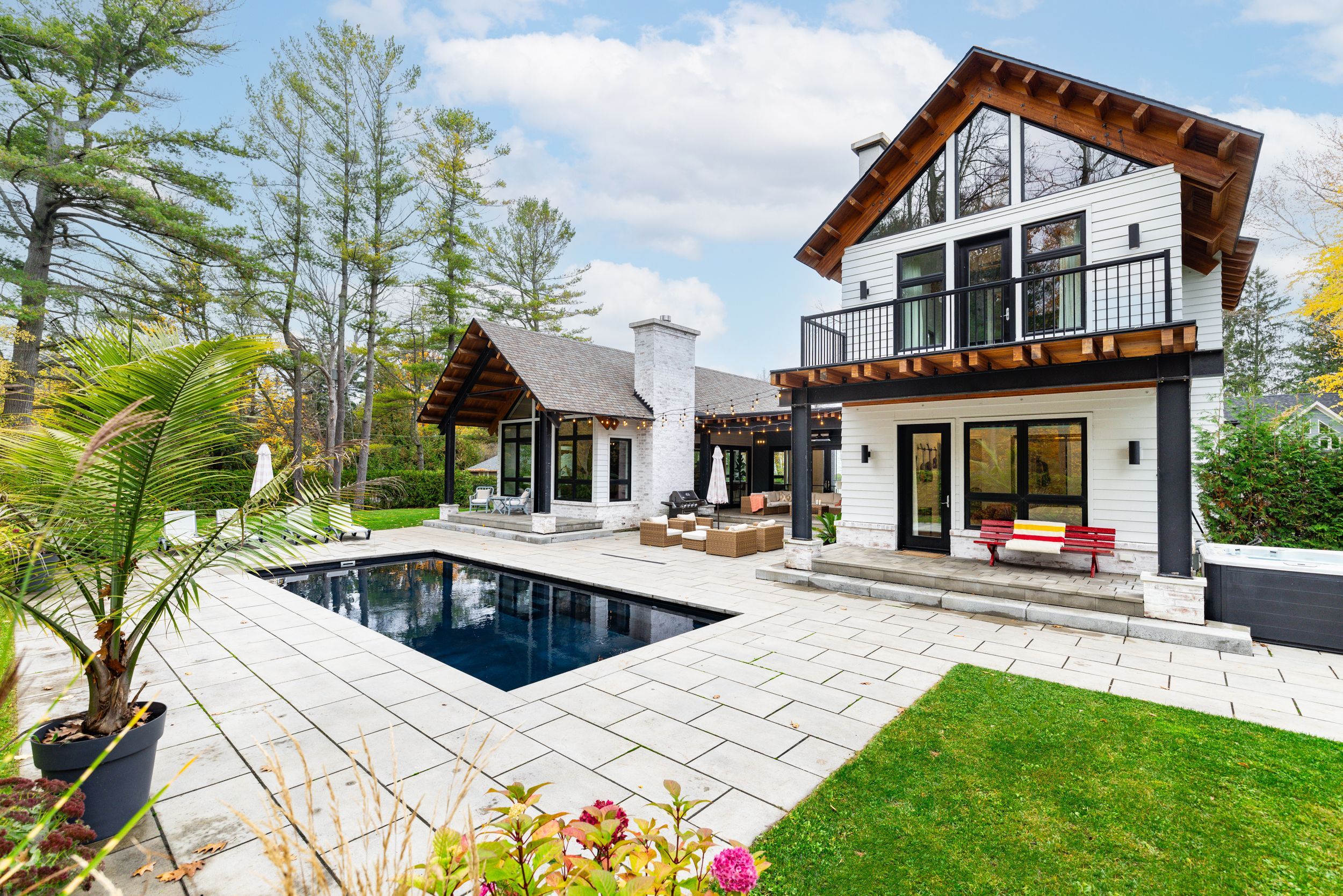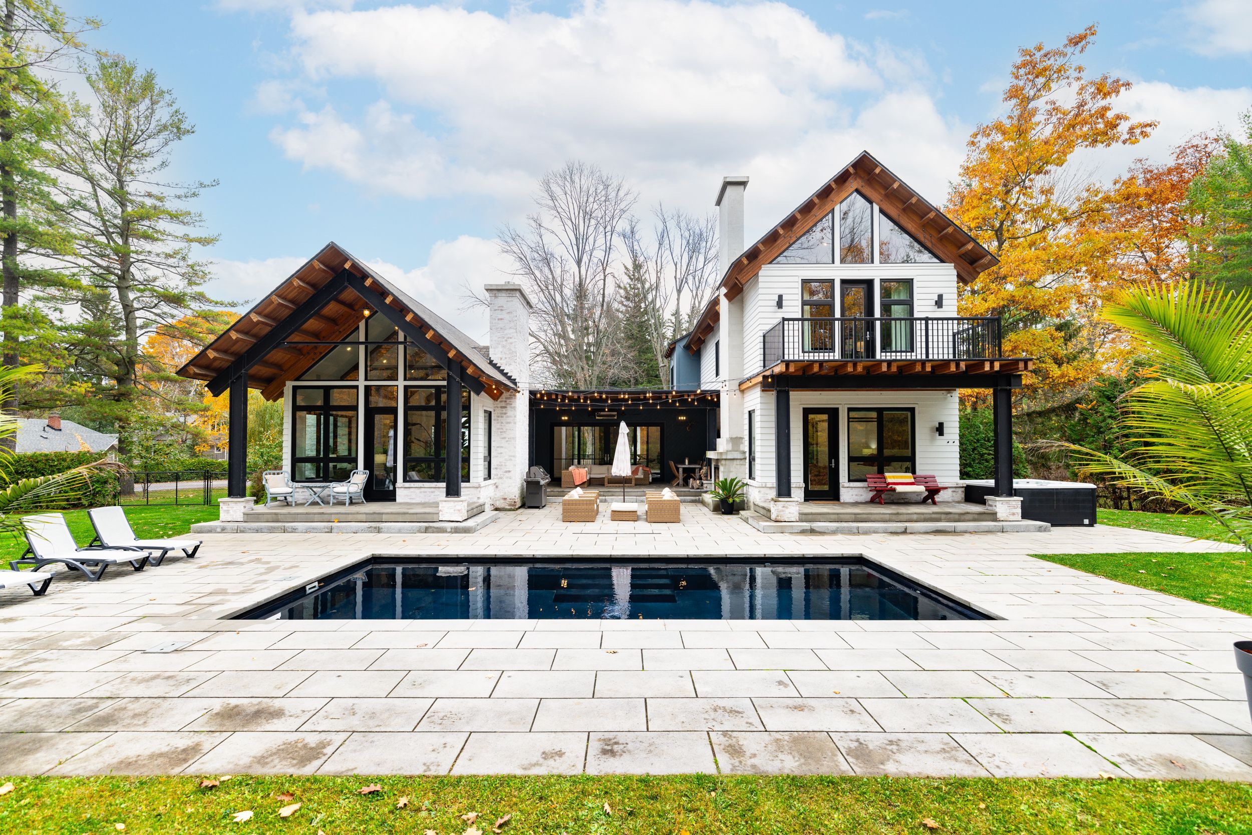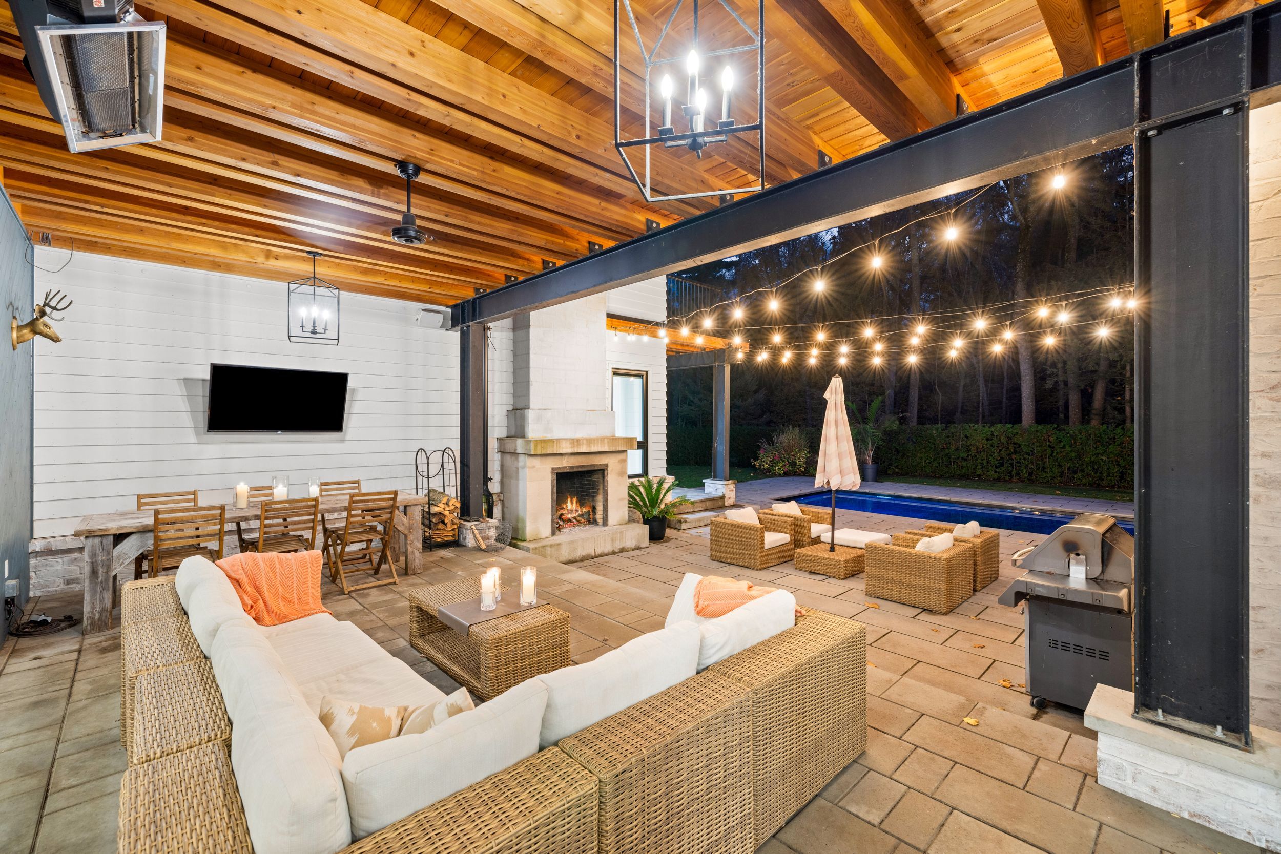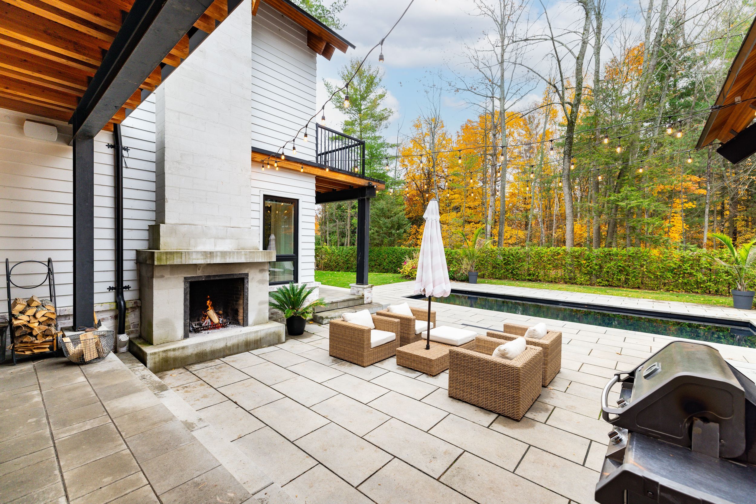 • Outdoor space features a patio, fireplace, and modern in-ground pool.