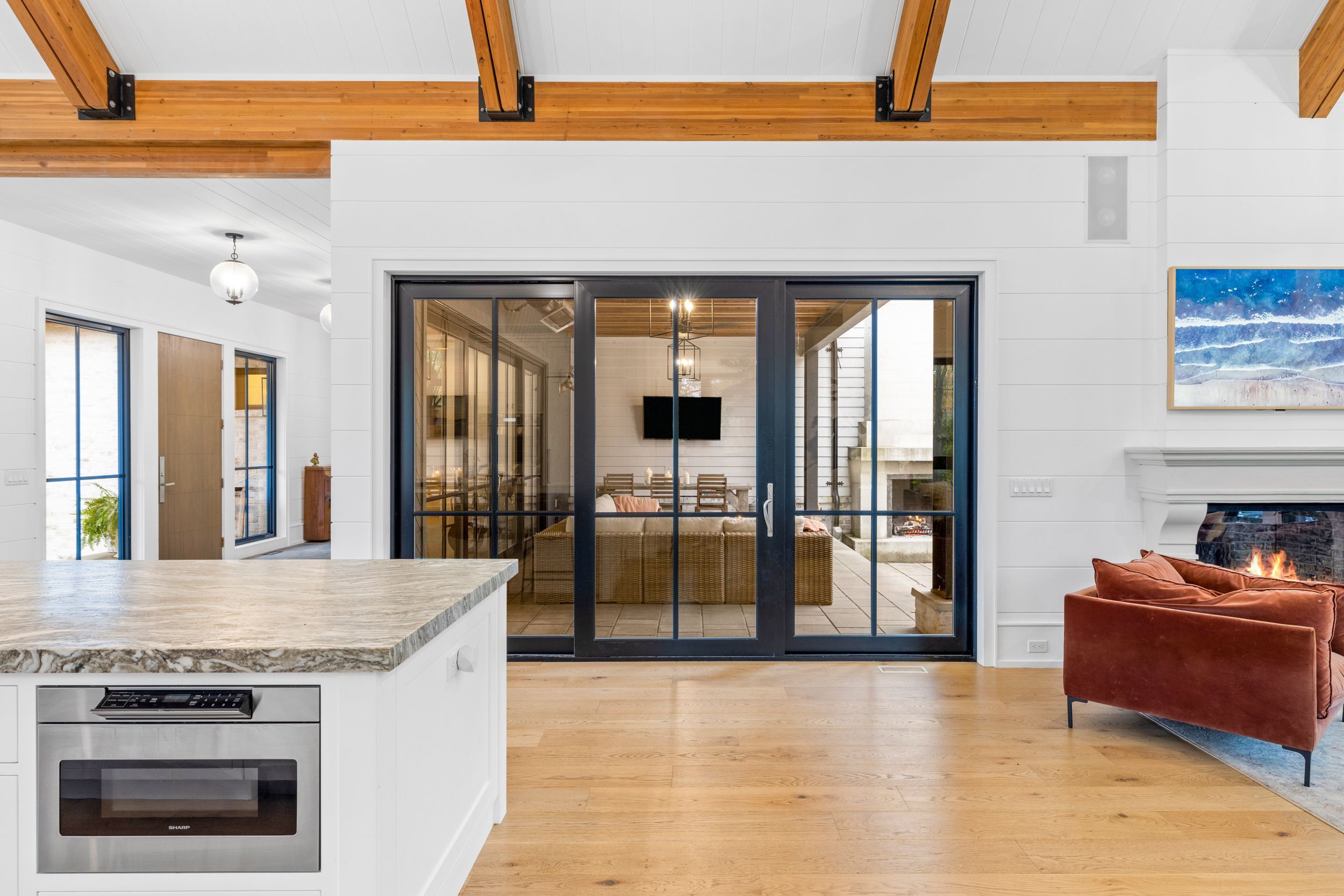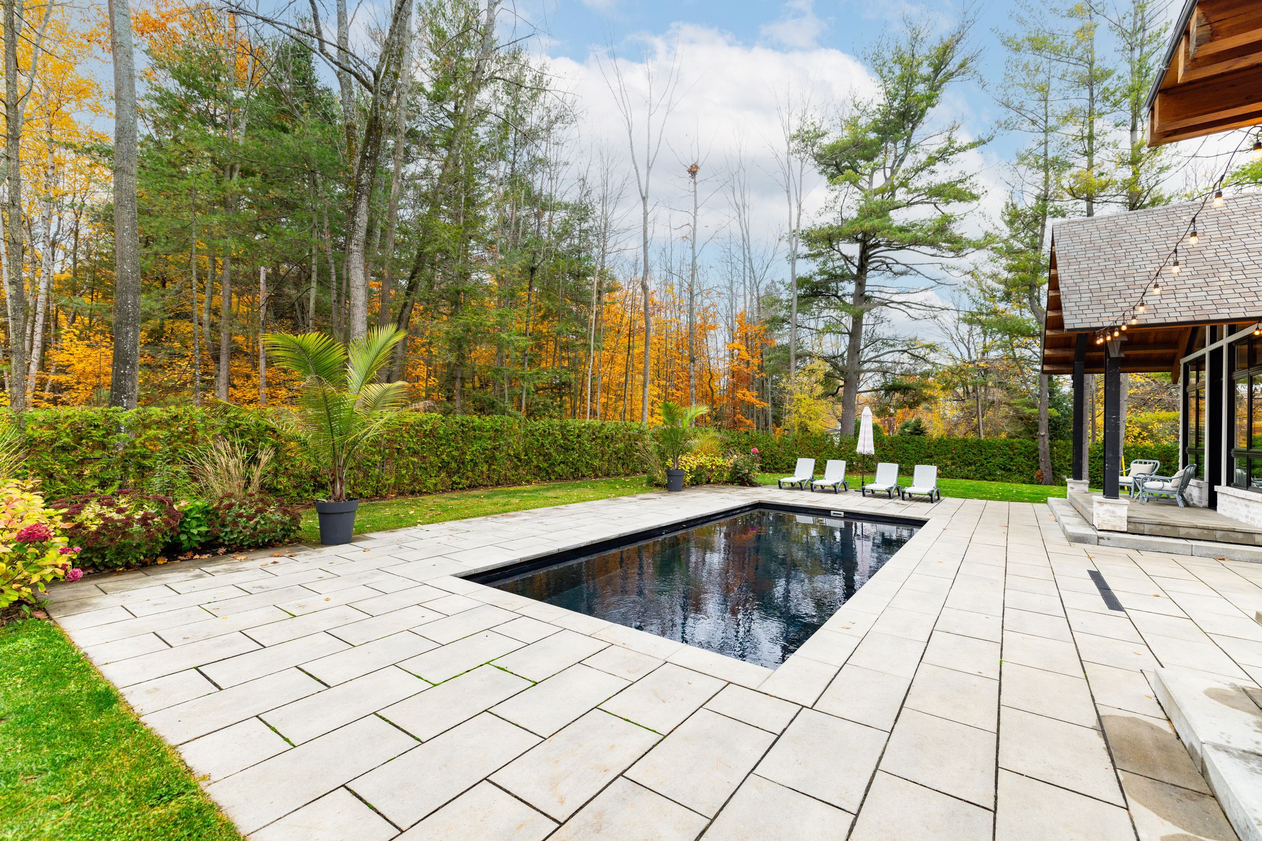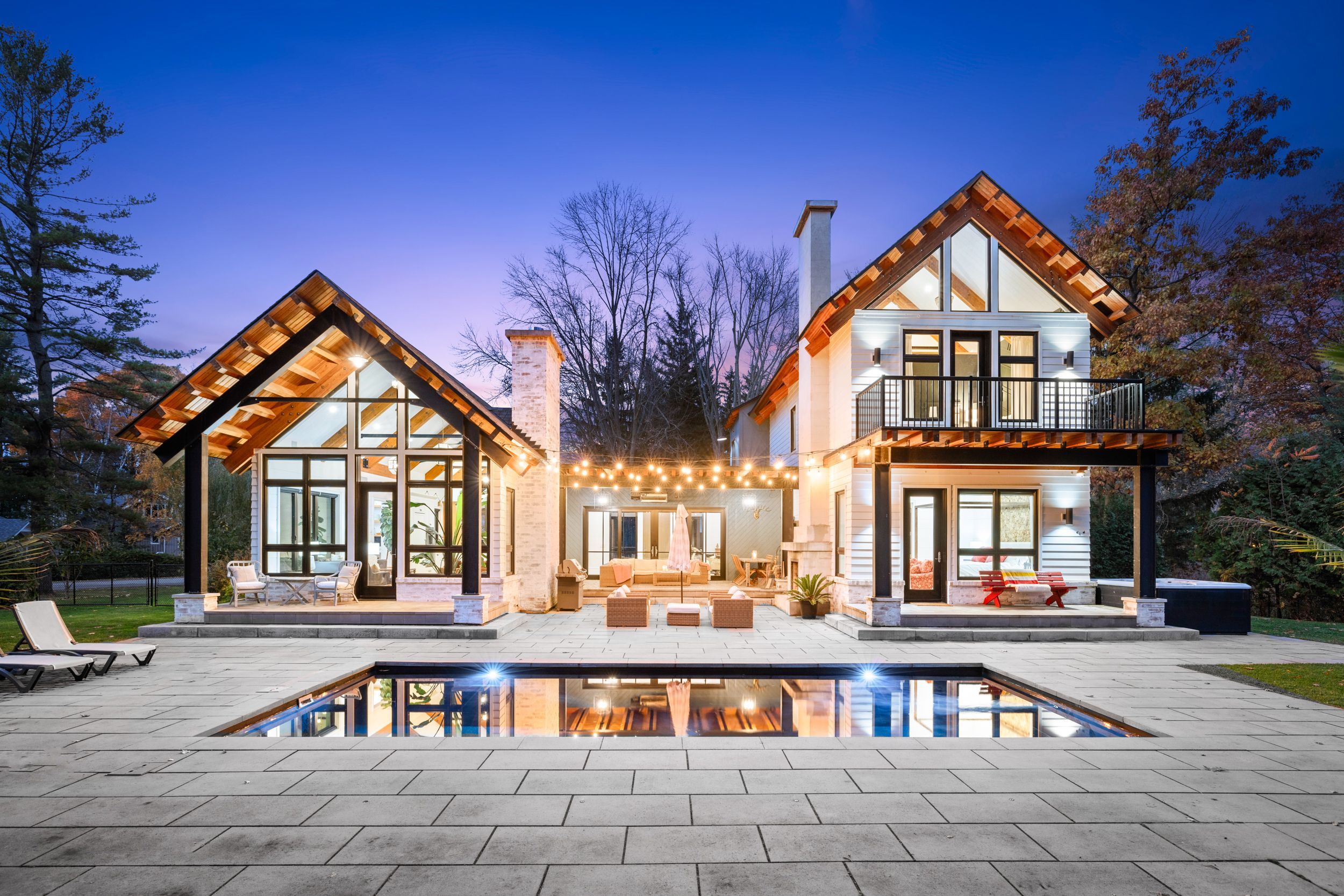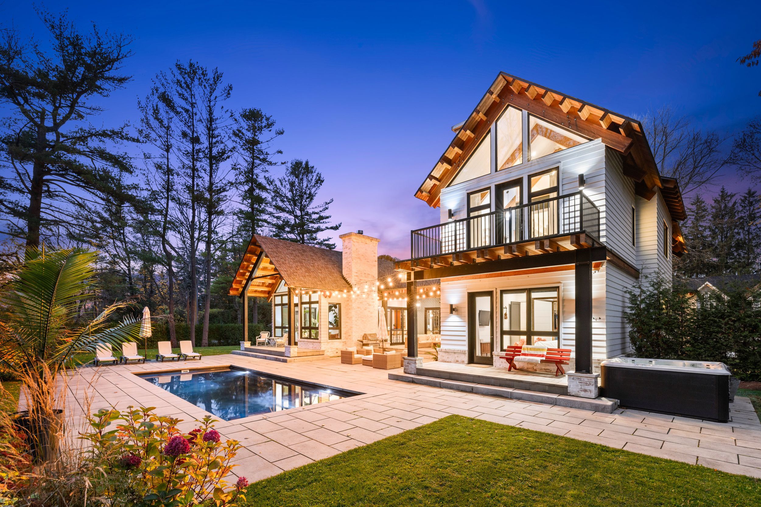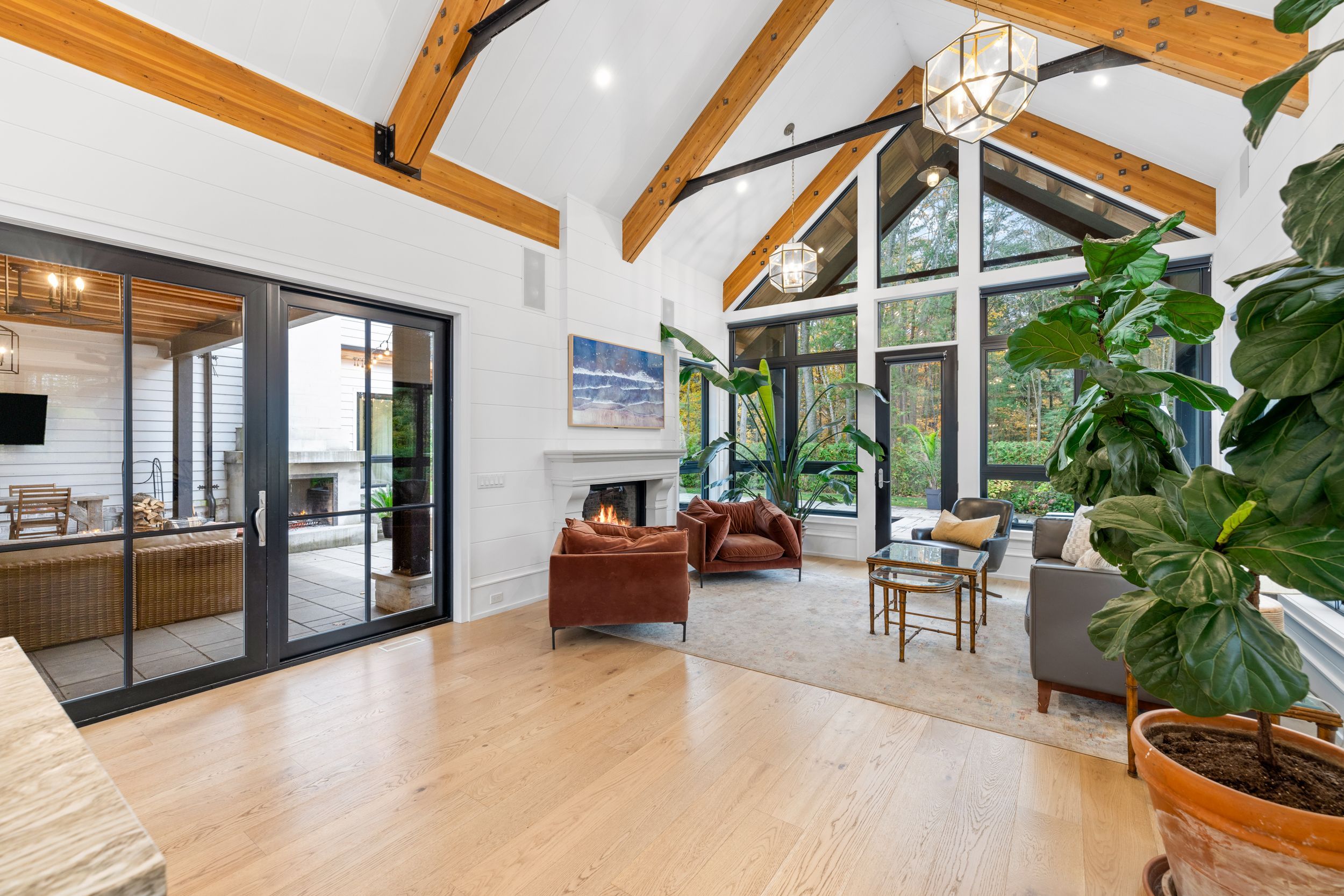 • Outdoor space features a patio, fireplace, and modern in-ground pool.
