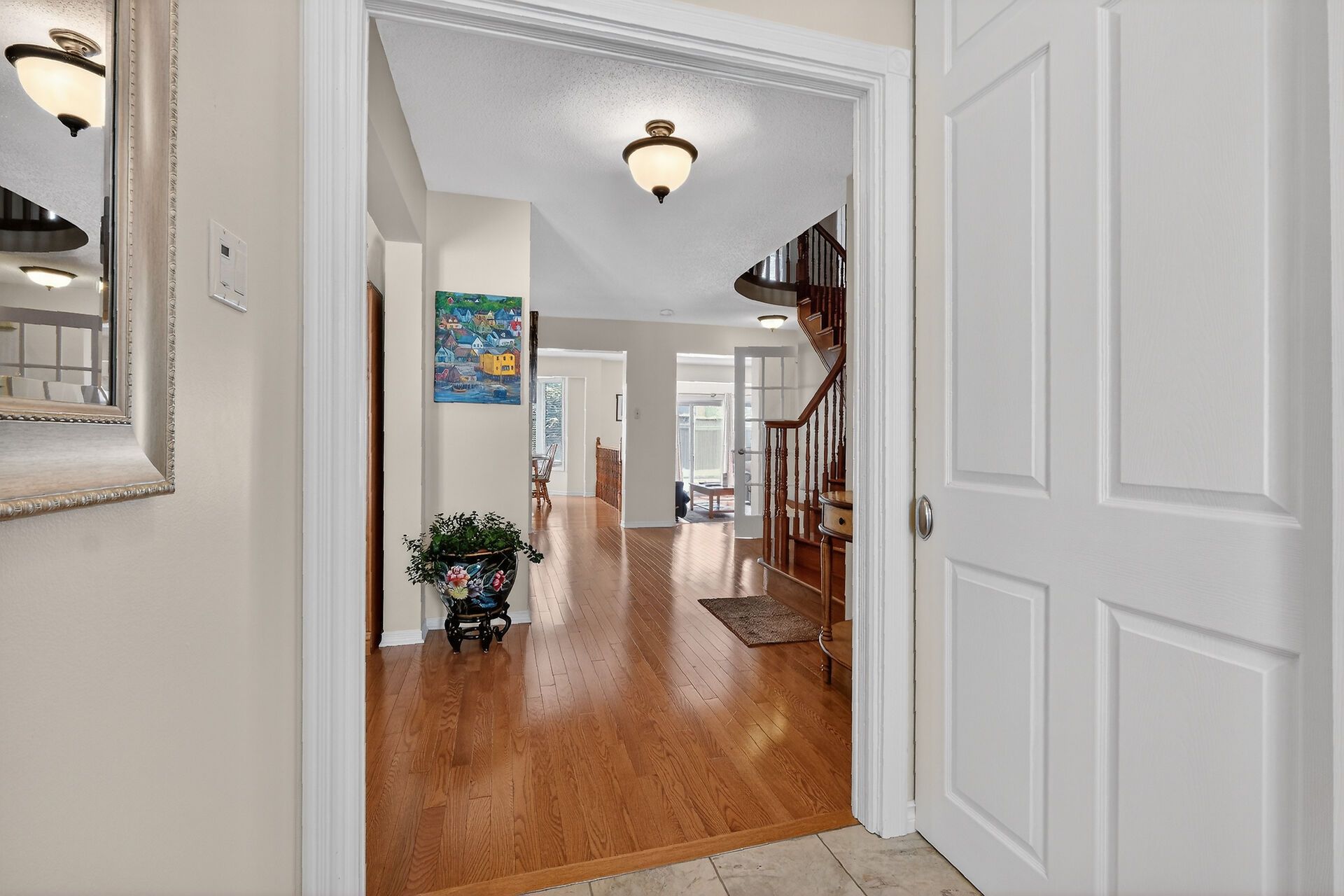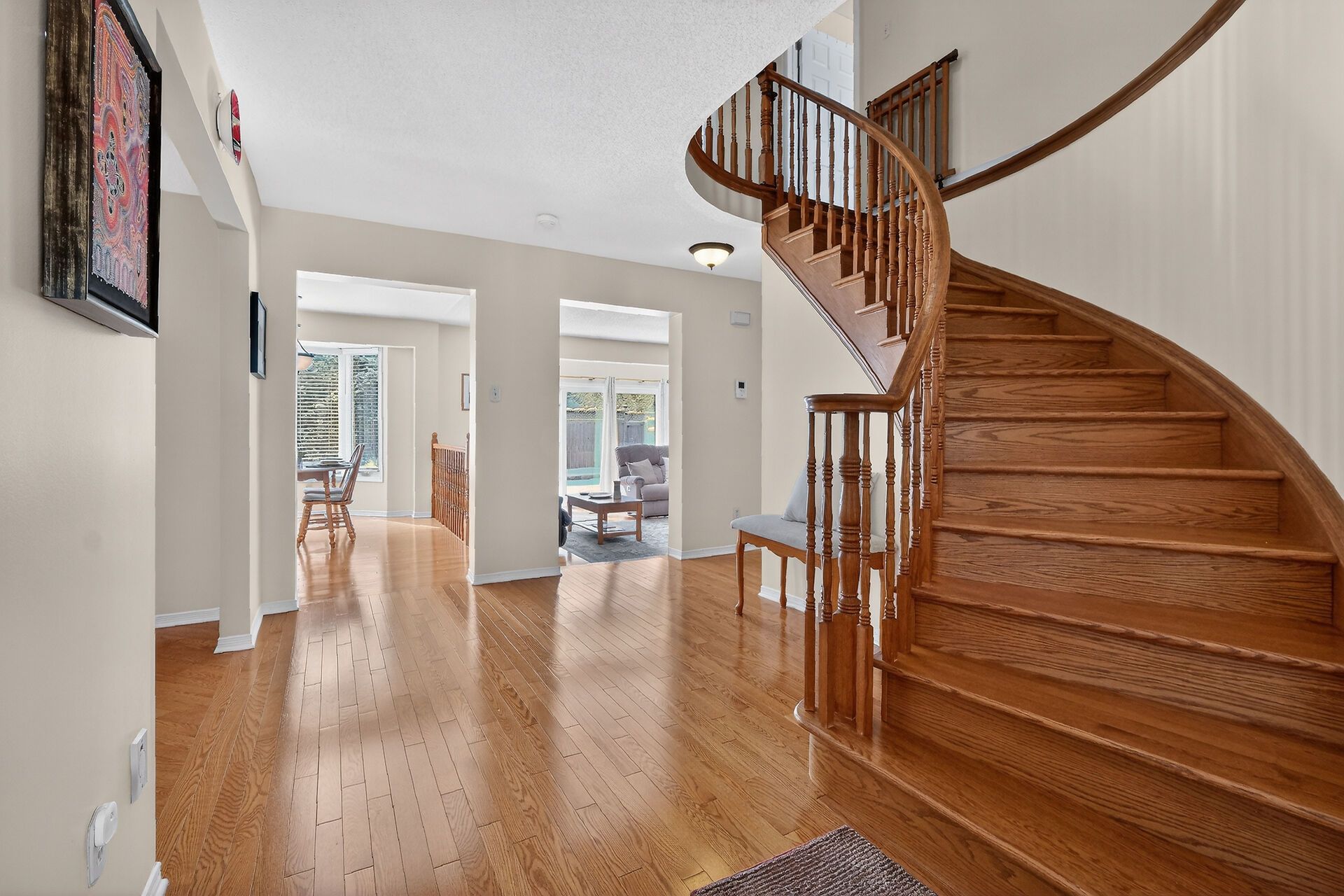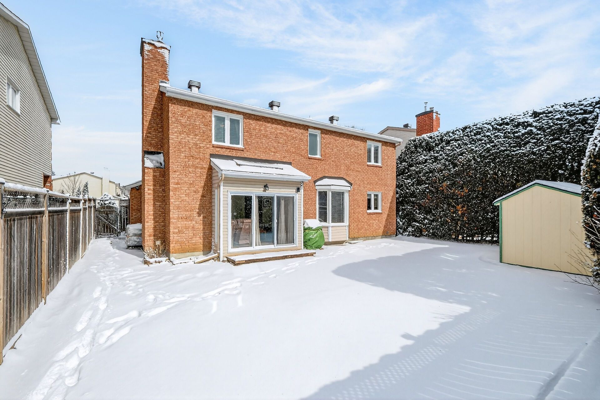 Wonderfully updated & maintained, this mostly brick home is located on a private street in the bridlewood community of kanata. Fantastic for families with 4 bedrooms, 3 baths, expansive finished lower level & private 50+ ft wide backyard with interlock patio & southern exposure. Almost 2,700 sqft above grade with entertaining size living & dining room, kitchen with eating area opens to spacious family room with sliding door to patio & yard. Many upgrades throughout the home including: hardwood & tile flooring on first & 2nd levels & stairs, updated kitchen & baths, windows & doors, landscaping, roof, & more. Interlock walkway welcomes you to the covered front porch & wider front door with pretty inset window. Tiled foyer has a double closet with updated doors. Entertaining size living & dining room with tall windows, chandelier & room for a buffet. Bright kitchen has many cabinets, pantry cupboards, pot drawers, subway tile backsplash, granite counters & updated sink & faucet & s/s appliances. Spacious eating area has views of the backyard & family room with gas fireplace. Enlarged patio door, 2 side windows bring natural light into the room. Handy laundry & mudroom has tall closets & side door to interlock walkway to backyard & entry to double garage. Elegant curved staircase to the 2nd level. Primary suite has room for a 2 dressers & a king size bed. Walk-in closet has built-in shelving plus a window. Spa-like ensuite bath has updated tiled flooring, upgraded counters, 2 sinks, big tiled shower, tub & extra cabinets for linen. Secondary bedrooms have neutral decor, big windows & double closets. Main bath has quartz counters, updated vanity doors, tile flooring & tub surround. Prof. Finished basement offers tremendous space for a home theatre with built-ins & electric fireplace. Plus room for hobbies, gym & office areas. Separate room with a workshop, storage & utility areas. Walk to several parks,trans canada trail, schools & shops. 24 hours irrevocable on offers.